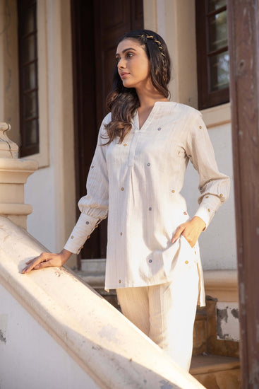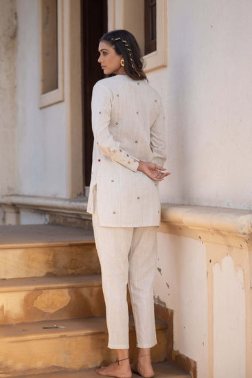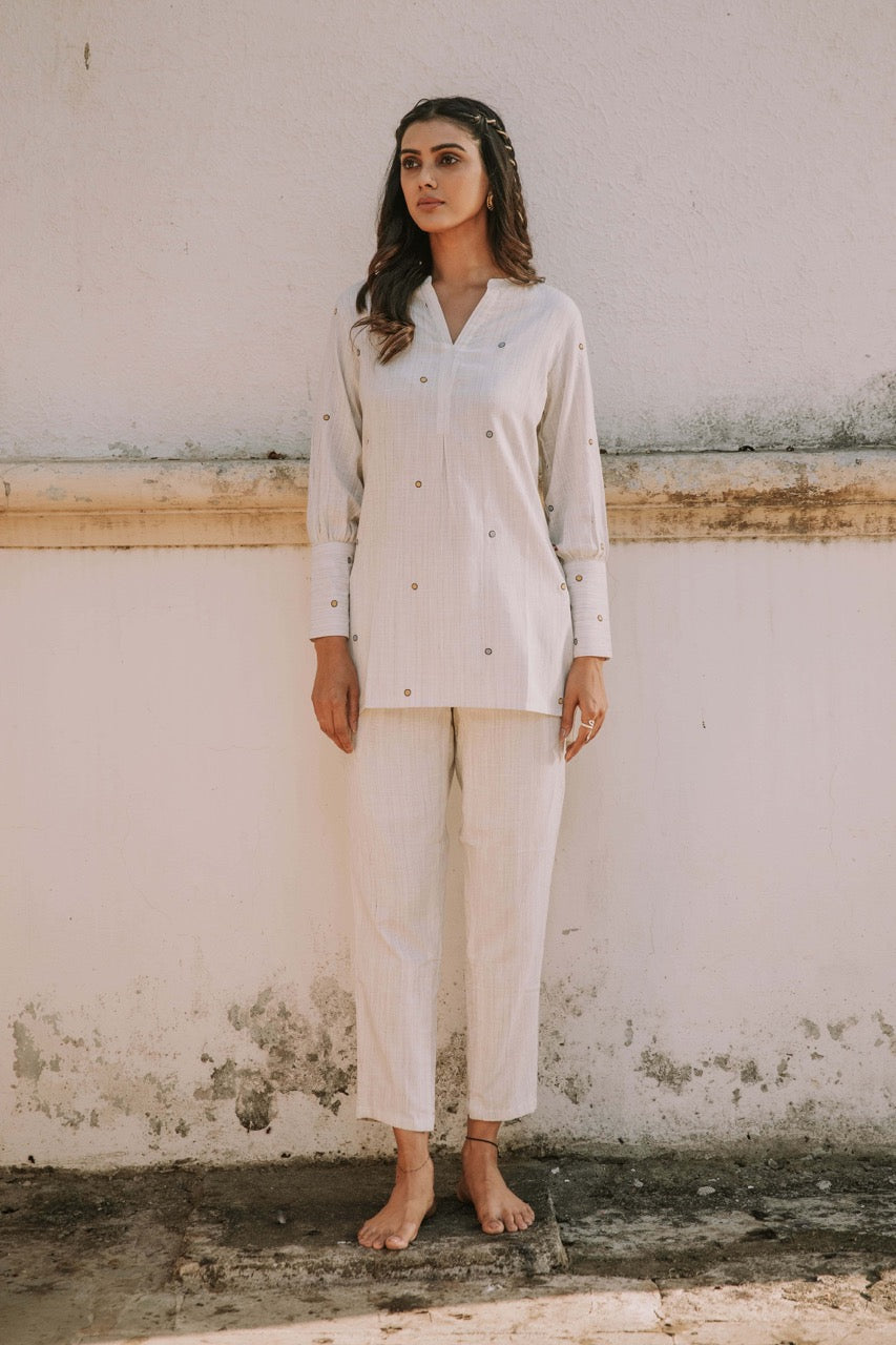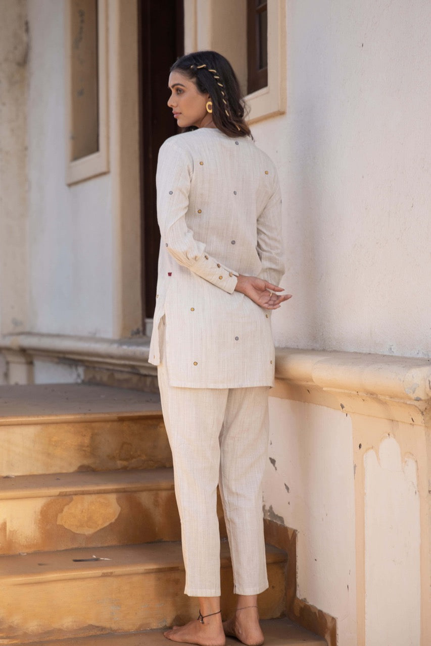 Introducing “Adorned,” a charming ensemble consisting of a natural cotton tunic and matching pants. Delicate thread embroidery is scattered throughout, adding a touch of elegance and allure to this stylish and comfortable outfit.