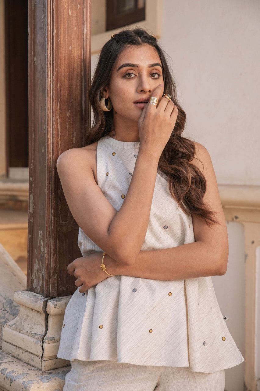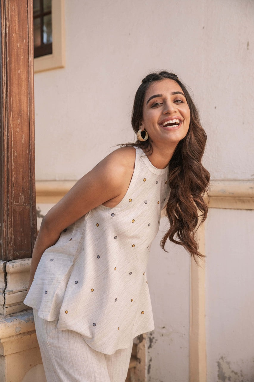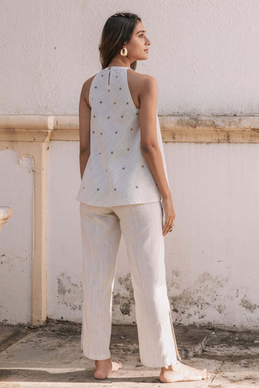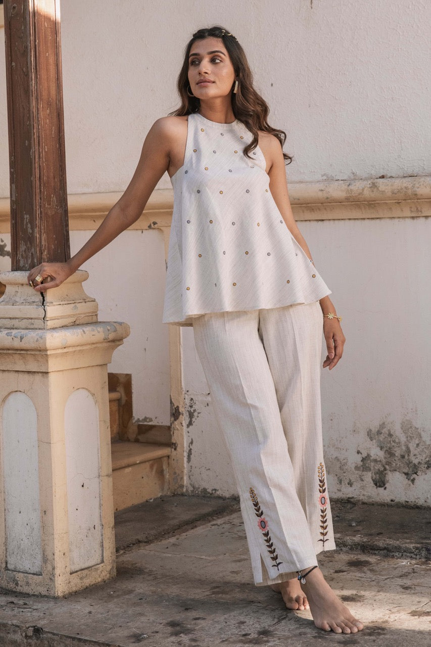 Introducing "Beloved," an enchanting sleeveless top and pants set. The bias-cut top, crafted from natural cotton fabric, features scattered embroidery, perfectly complemented by the delicately embellished embroidery on the bottom of the matching cotton pants. Exquisite elegance meets comfort in this ensemble.