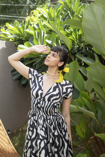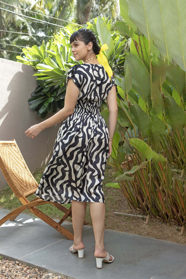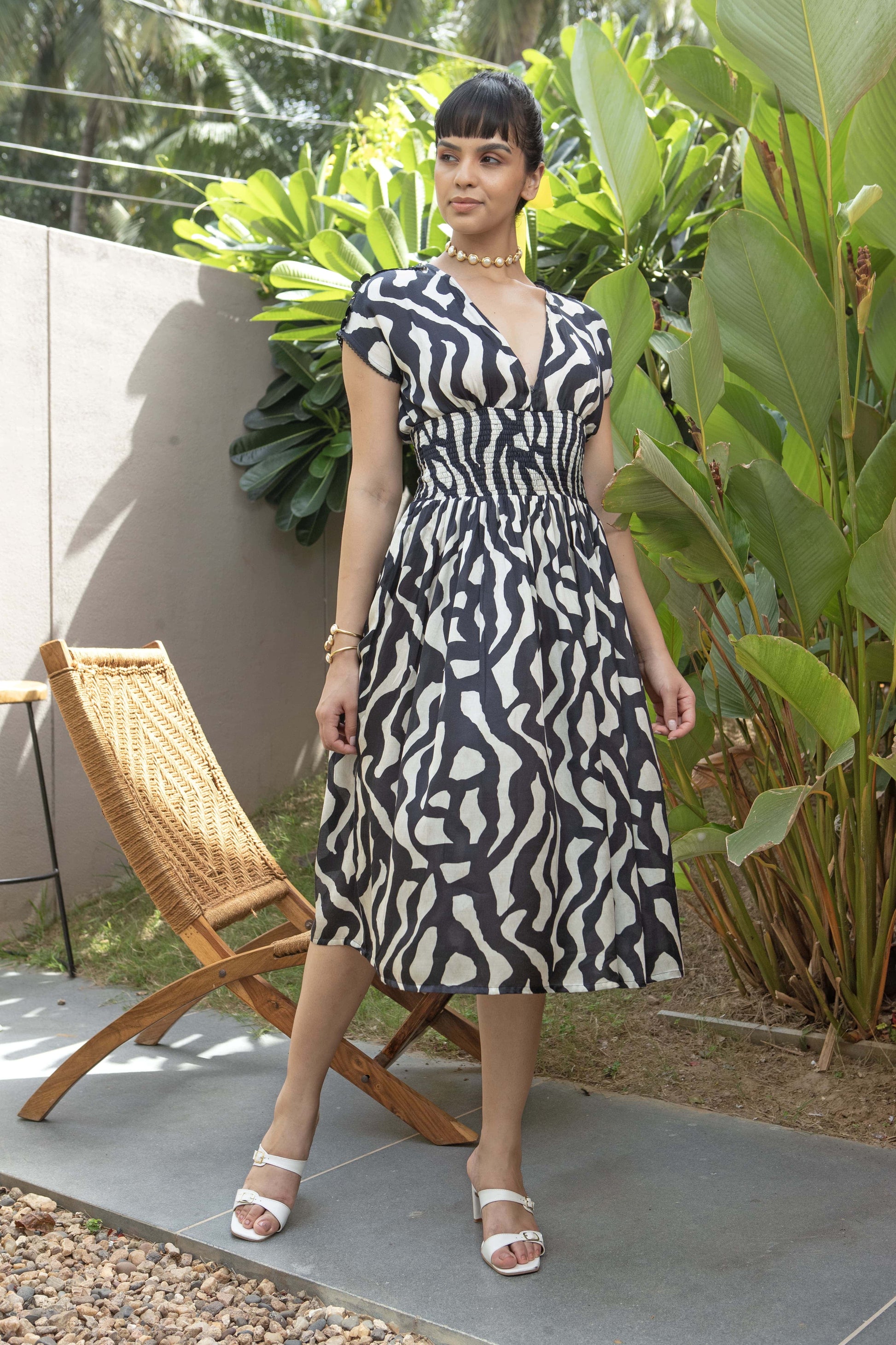 Blissful print graces this elegant calf-length dress from the Love Letter collection. With a V-neck, smocked waist for a perfect fit, and delicate laser-cut shoulder detailing, it's the epitome of dainty and versatile style, ideal for any occasion.