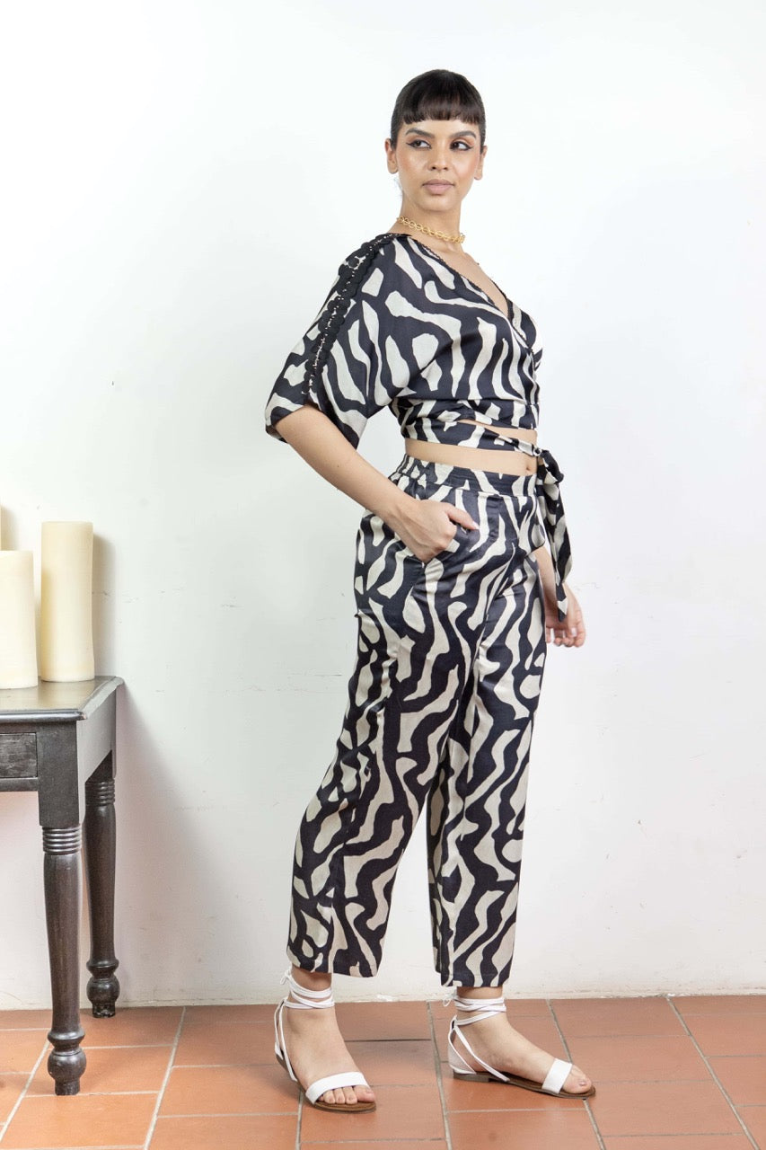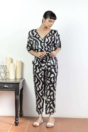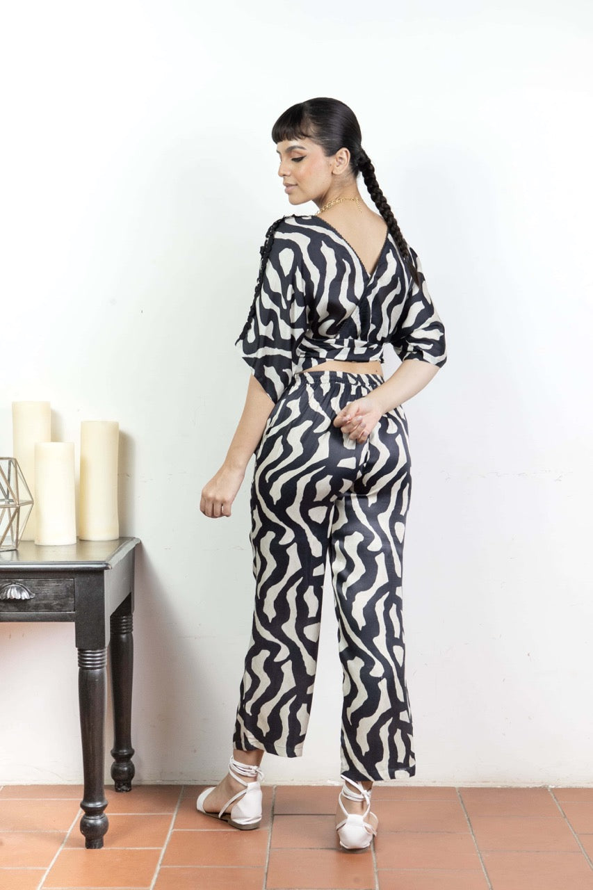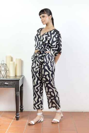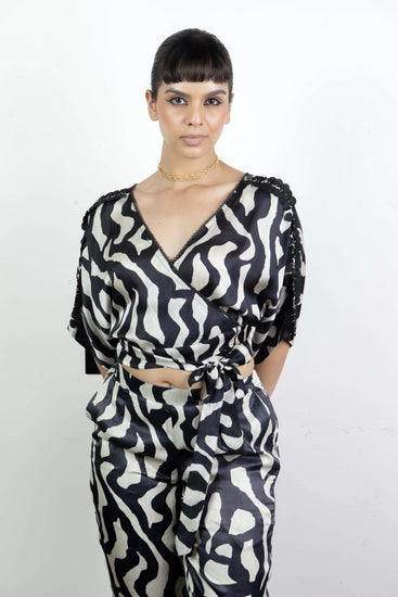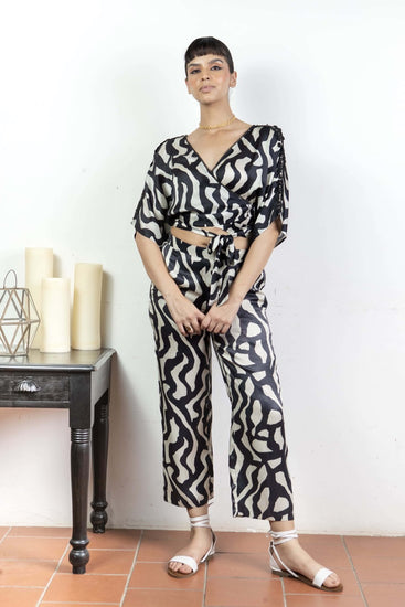 Blissful, a versatile co-ord set from the Love Letter collection, features abstract-inspired detailing from shoulder to sleeve, adding an elegant touch to its black and white palette. This outfit offers endless possibilities; the top pairs beautifully with other pants, and the pants complement various tops, making it a versatile choice for your wardrobe.