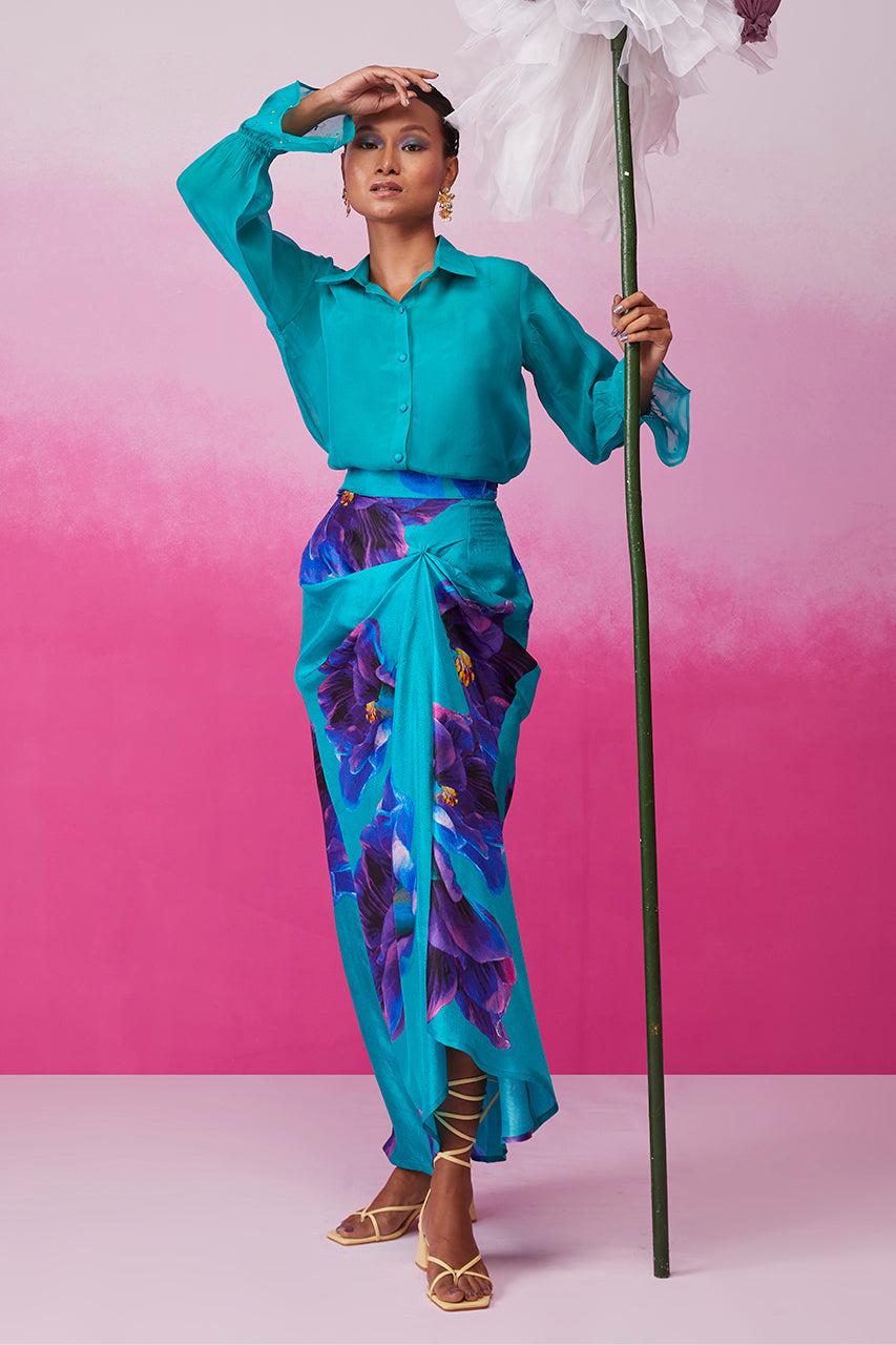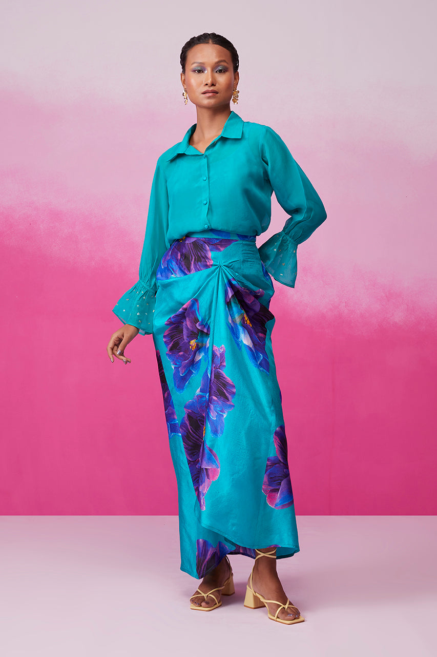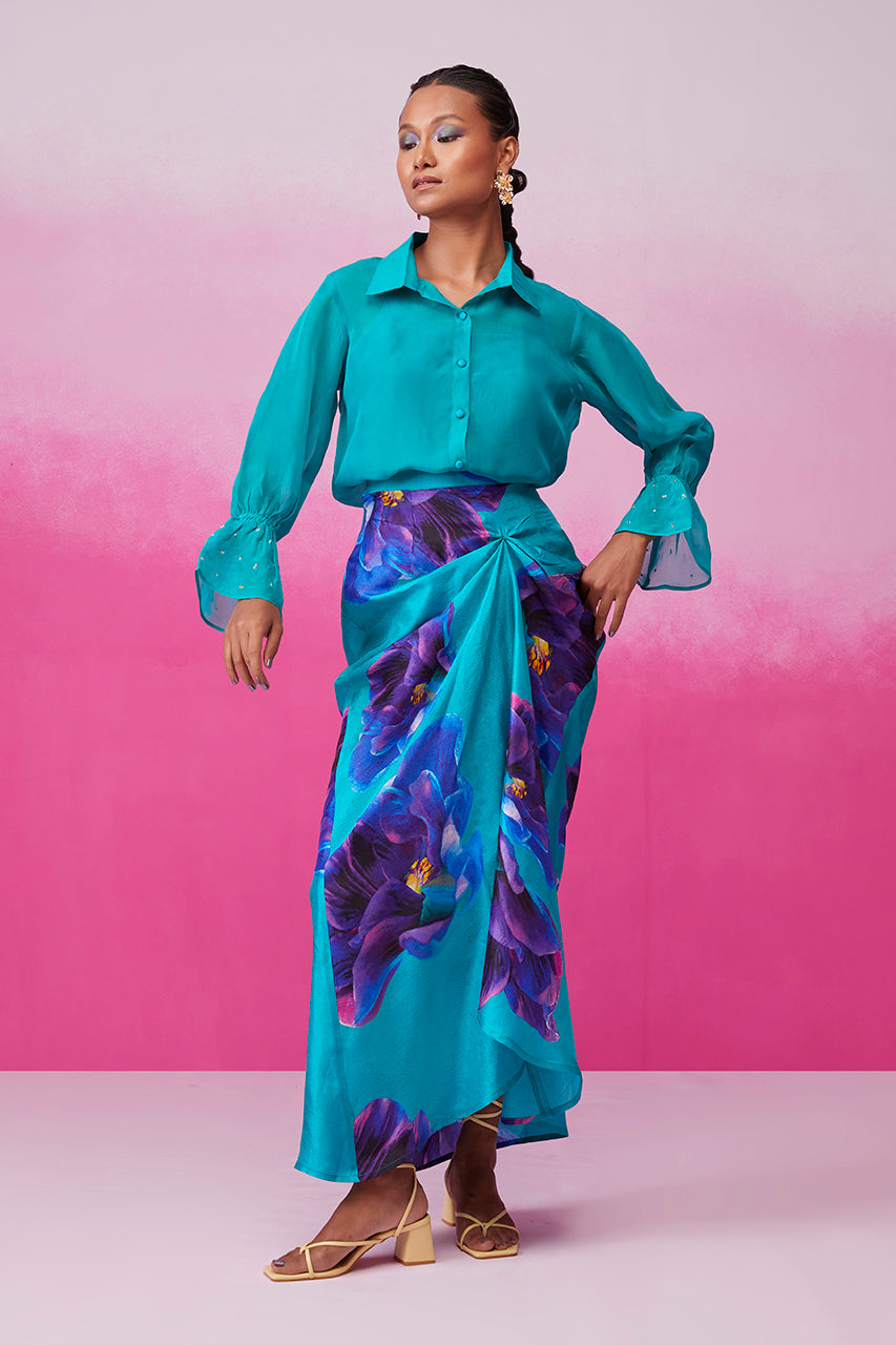 Embrace bold elegance with "Blossom Bliss" from Call it Love. The cyan side-tucked skirt, adorned with large flowers, pairs seamlessly with a high-waisted organza shirt. Sequin highlights on the sleeves add a touch of glamour. This smart party wear look is flamboyant and flattering, catering to every body type.