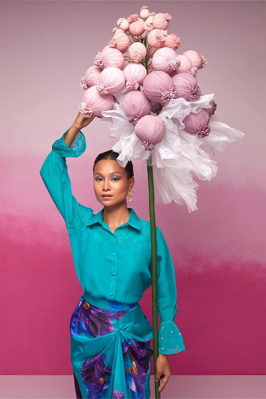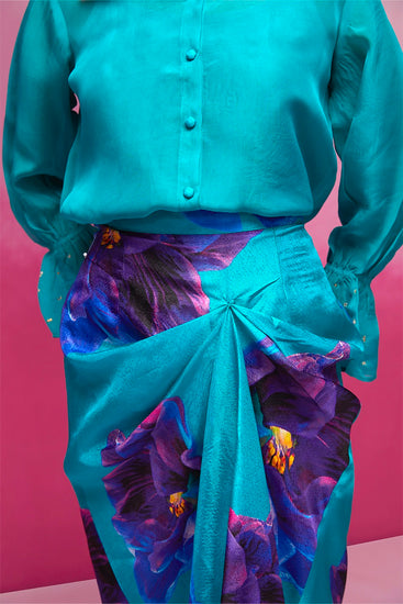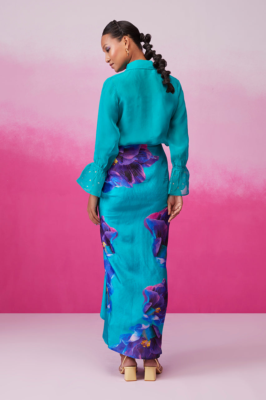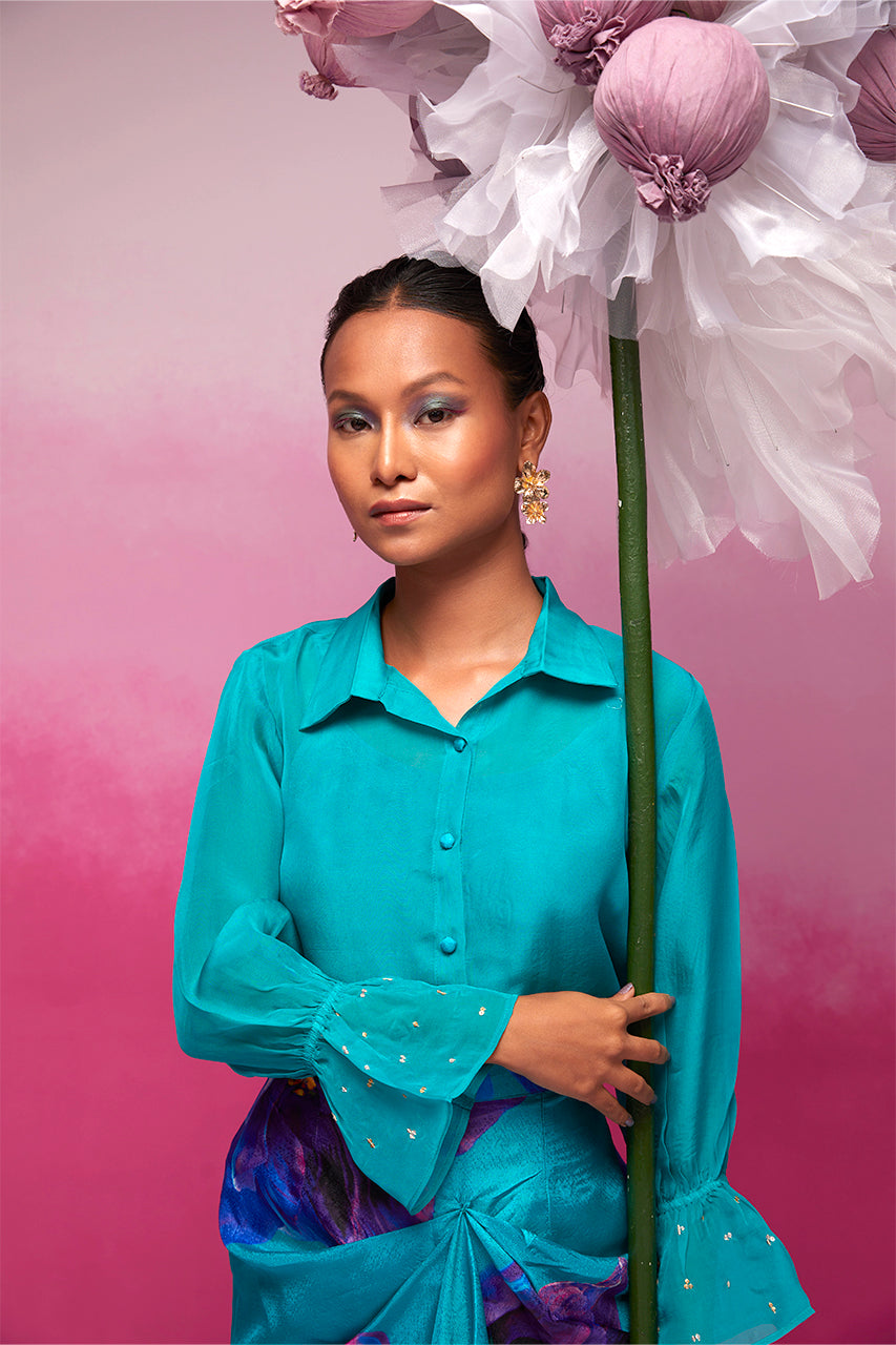 Embrace bold elegance with "Blossom Bliss" from Call it Love. The cyan side-tucked skirt, adorned with large flowers, pairs seamlessly with a high-waisted organza shirt. Sequin highlights on the sleeves add a touch of glamour. This smart party wear look is flamboyant and flattering, catering to every body type.