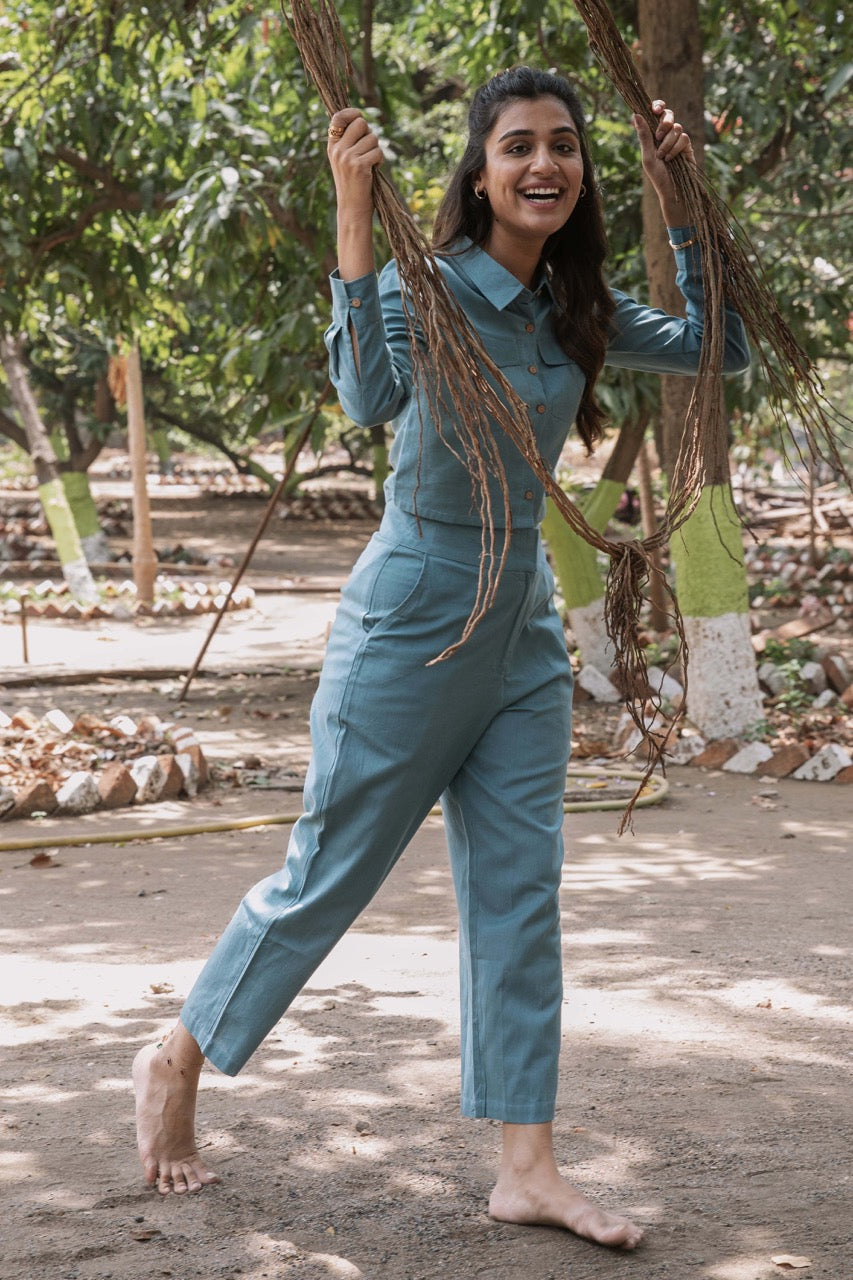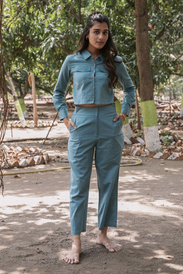 Teal Blue pocket shirt coord set will keep your movie dates and cofee dates sorted.you can also wear a tank top inside and keep the shirt open.Layering will give you that edge.