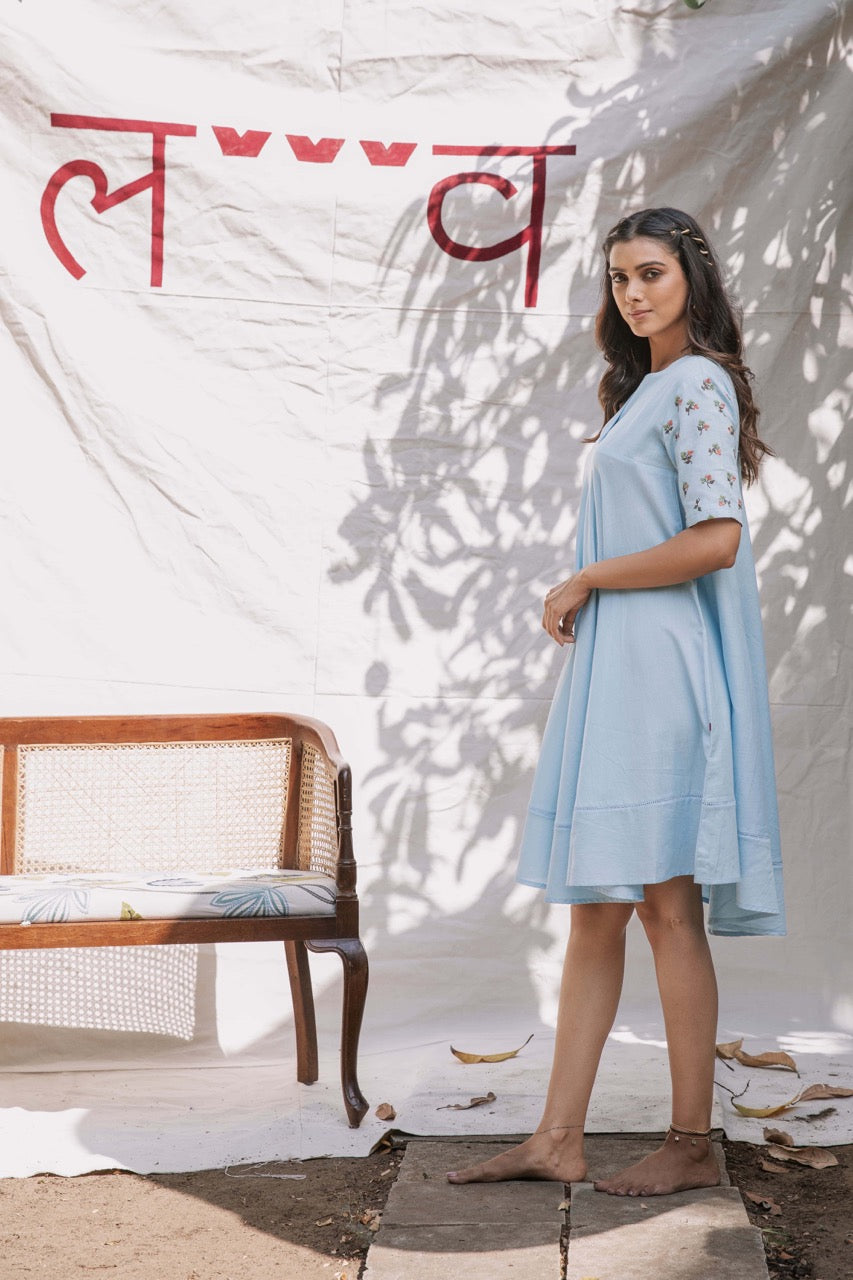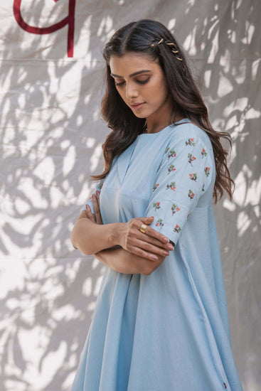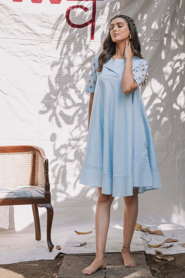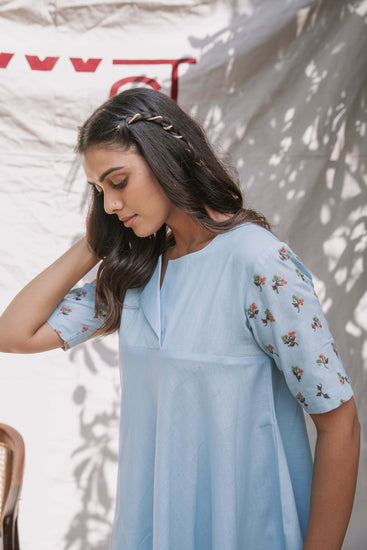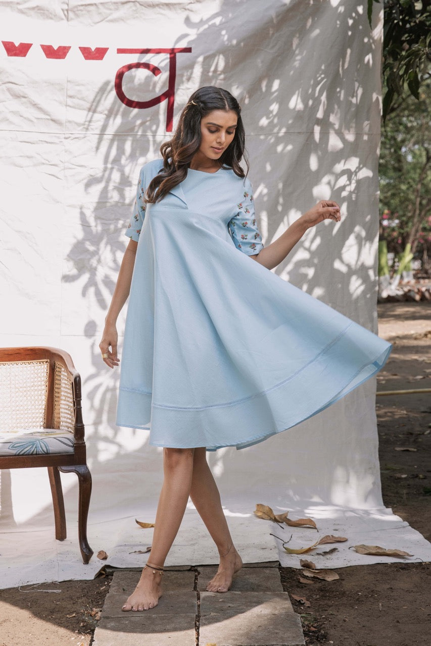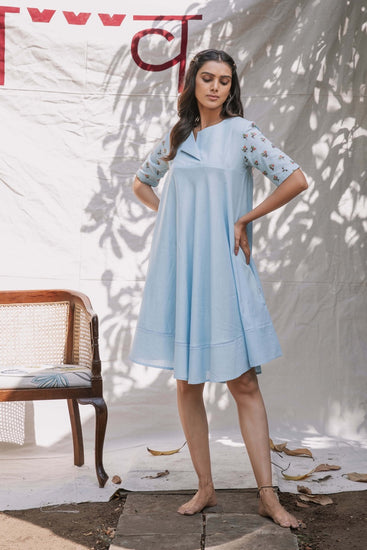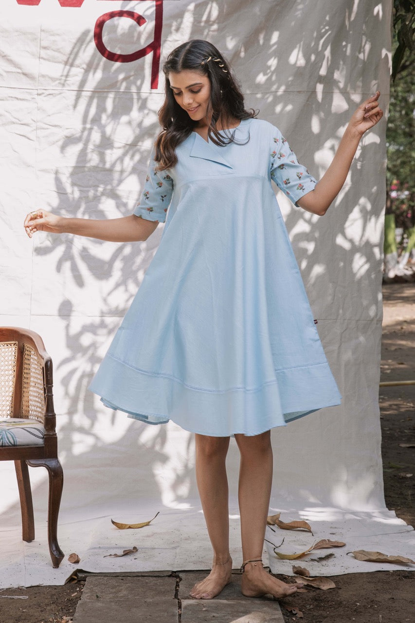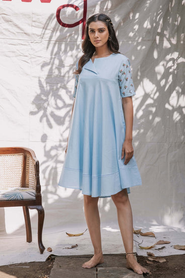 Ice Blue dress is surely a style to wear on your first date or brunch with friends.There is pretty floral detailling on sleeves.