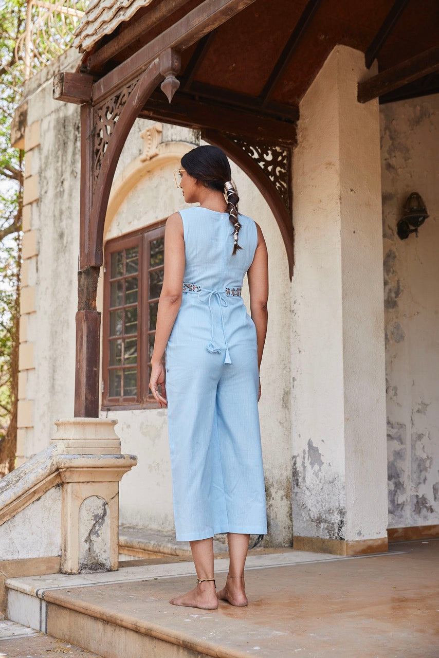 Ice blue sleeveless jumpsuit with floral embroidered belt is a hit on dinner and a day out with your partner. Accessorise it with anything pearl,be it a bracelete or a pair of earrings.