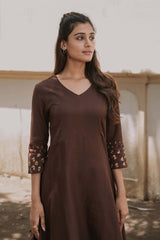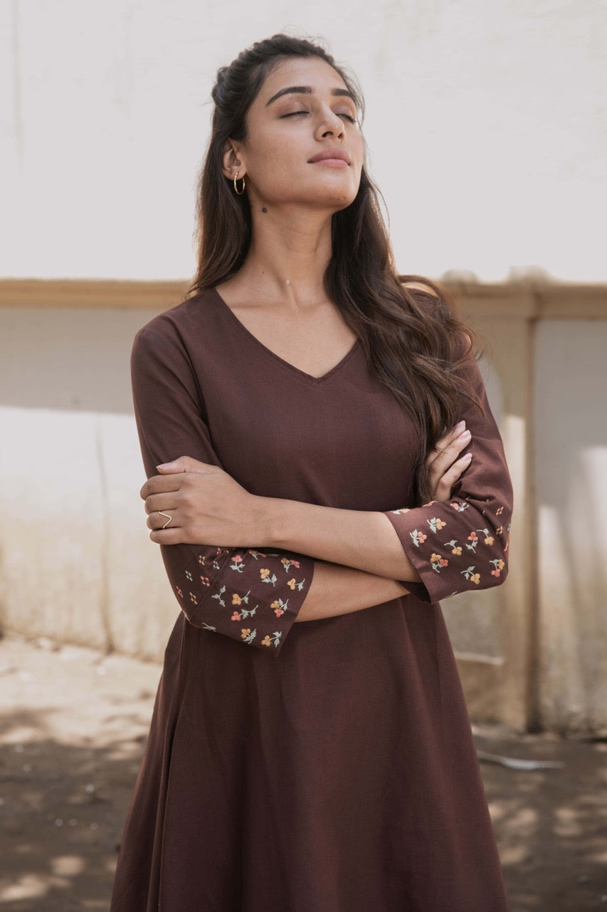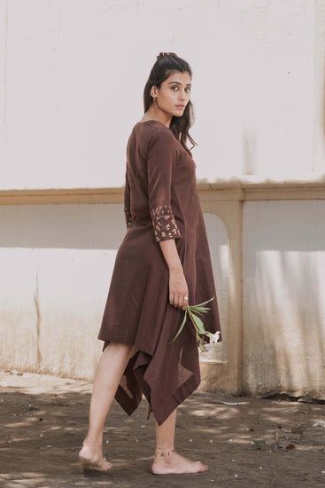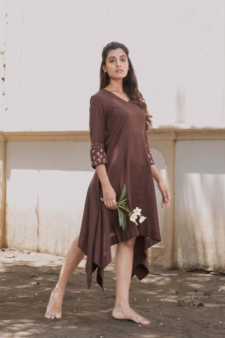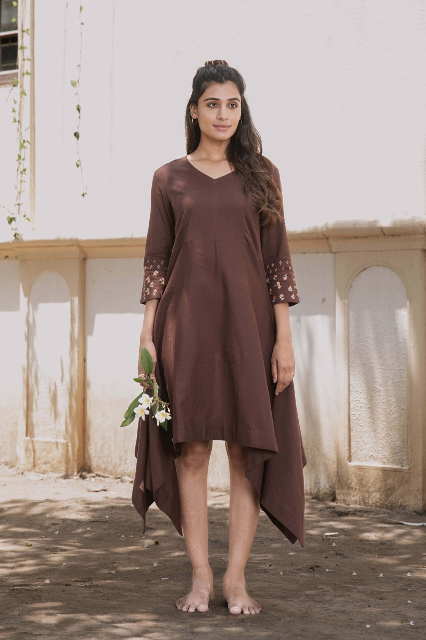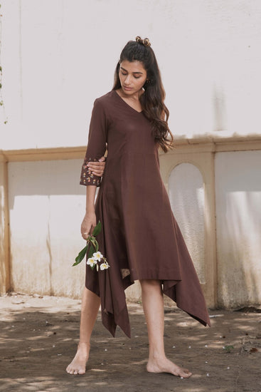 Cinnamon asymetrical dress pattern with thread detailingson sleeve, is every body type and you can pull this off on your holiday or your spa day.Wear your favourite tie up sandals and flaunt it.