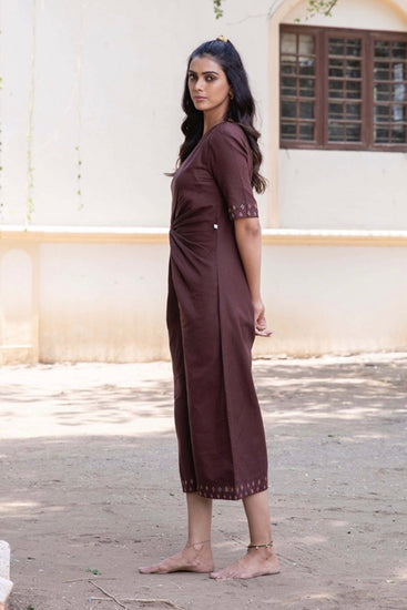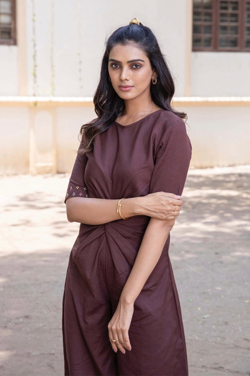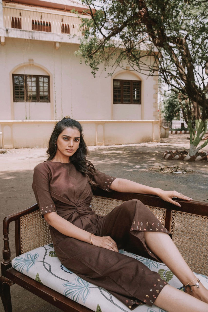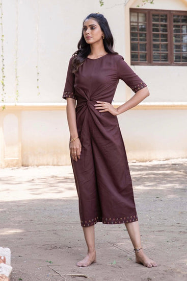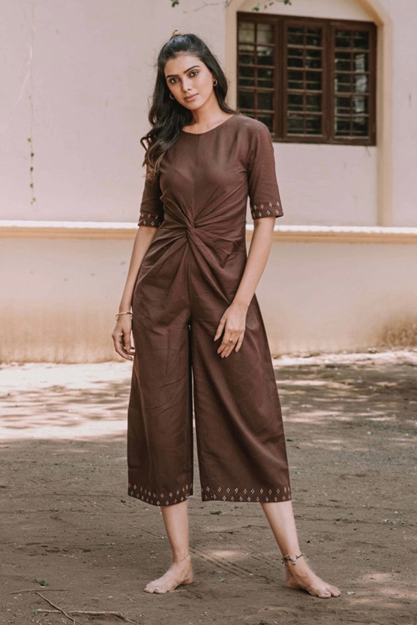 Brown center knot jumpsuit gives you a stylish look and has cute detailling on sleeve.Pair with your favourite tote bag and enjoy your day.