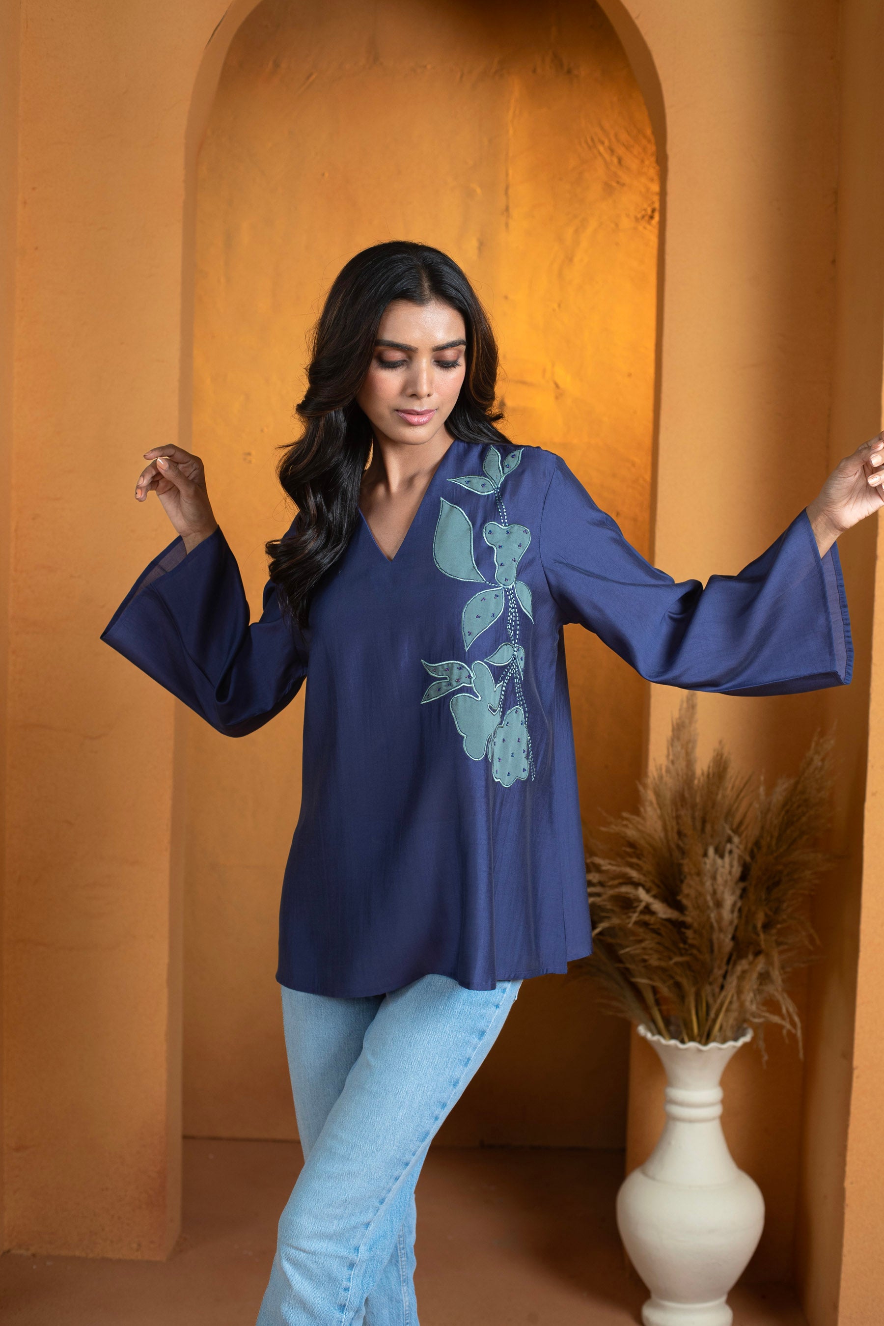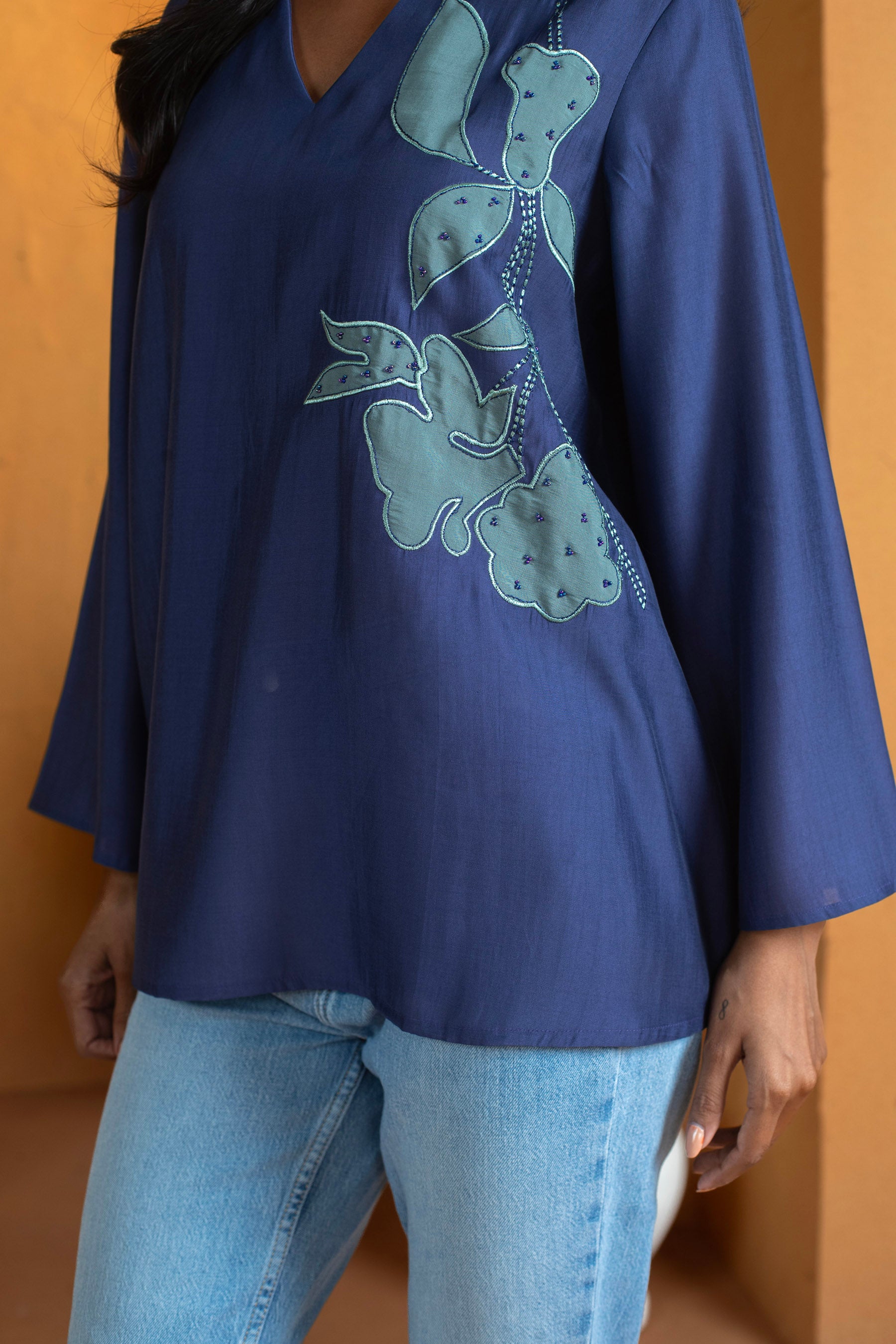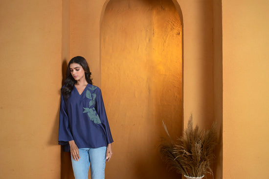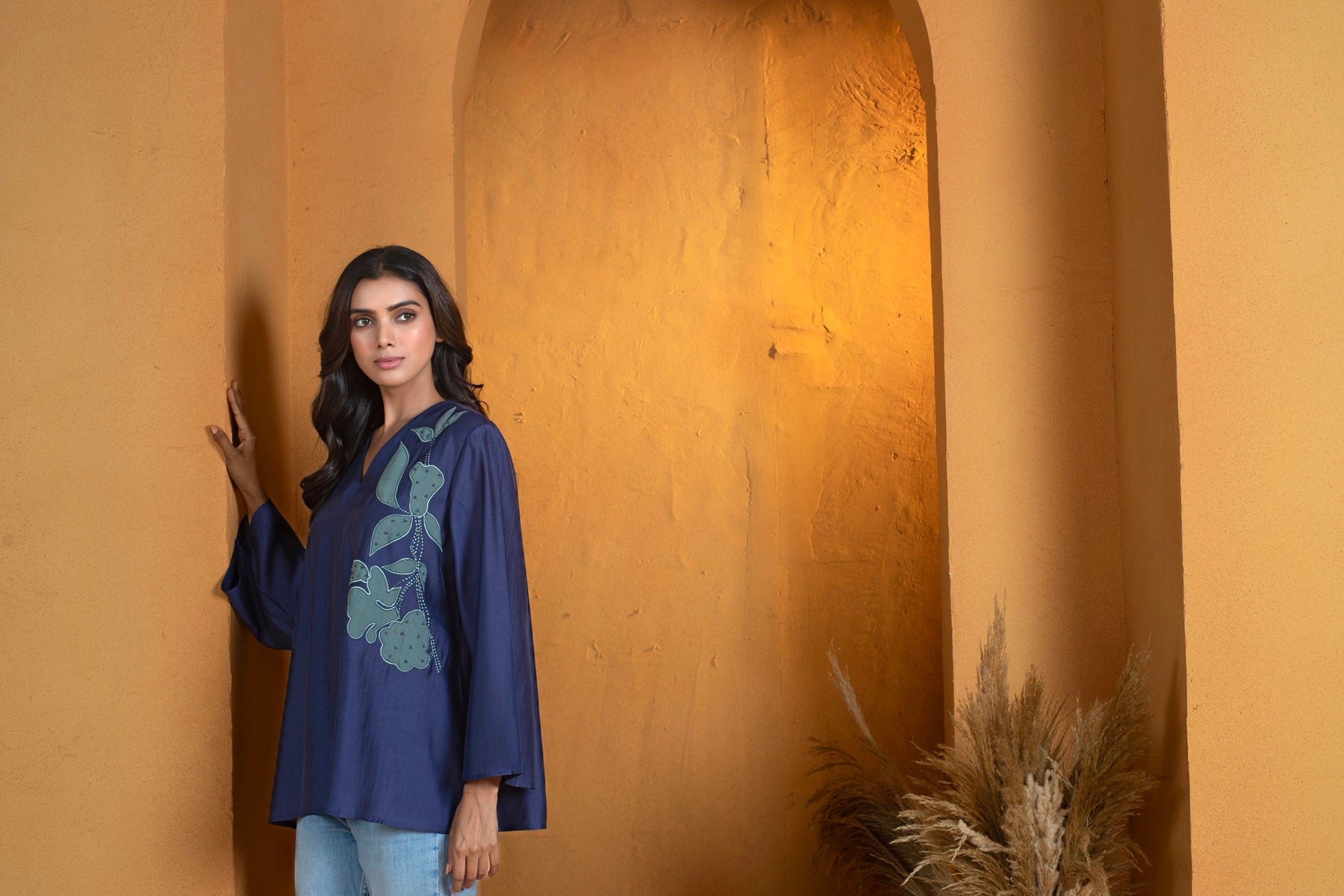 This top is a classic stye with one side patch work and some hand detailings on it. The colors are elegant and subtle. Th bell sleeves gives a graceful look to the top.