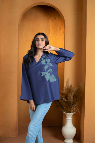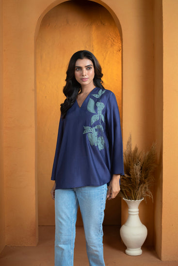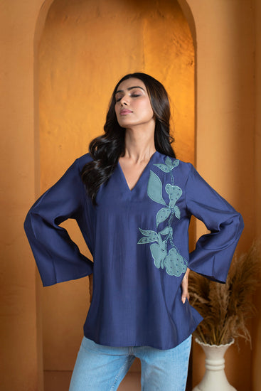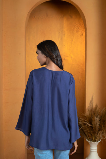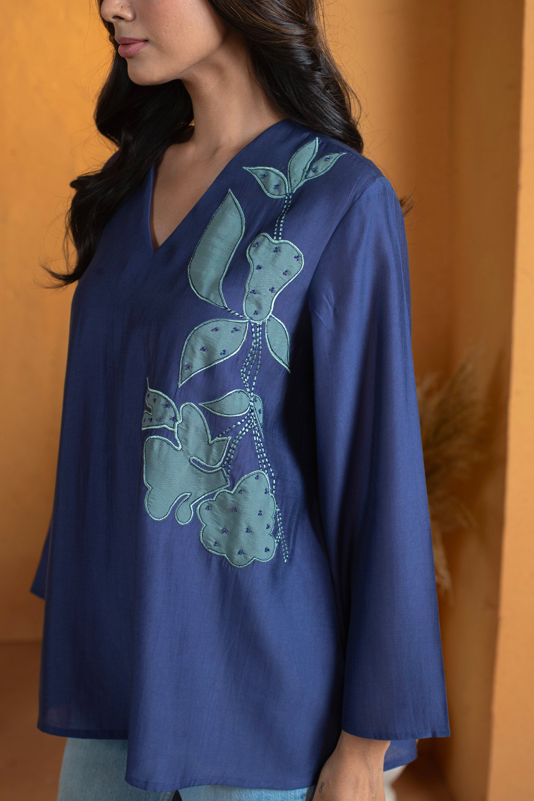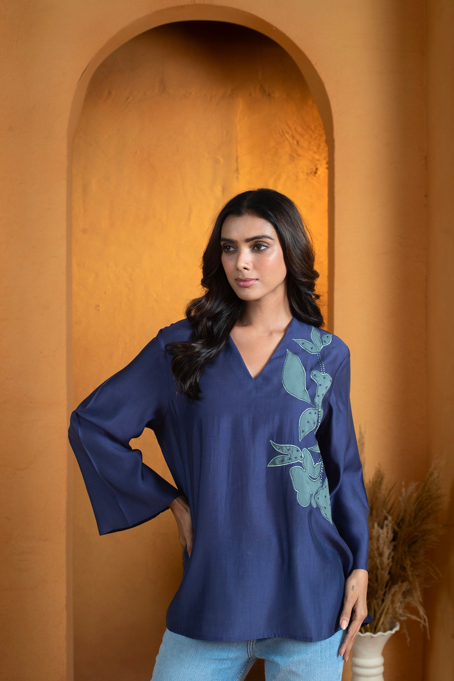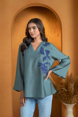 This top is a classic stye with one side patch work and some hand detailings on it. The colors are elegant and subtle. Th bell sleeves gives a graceful look to the top.
