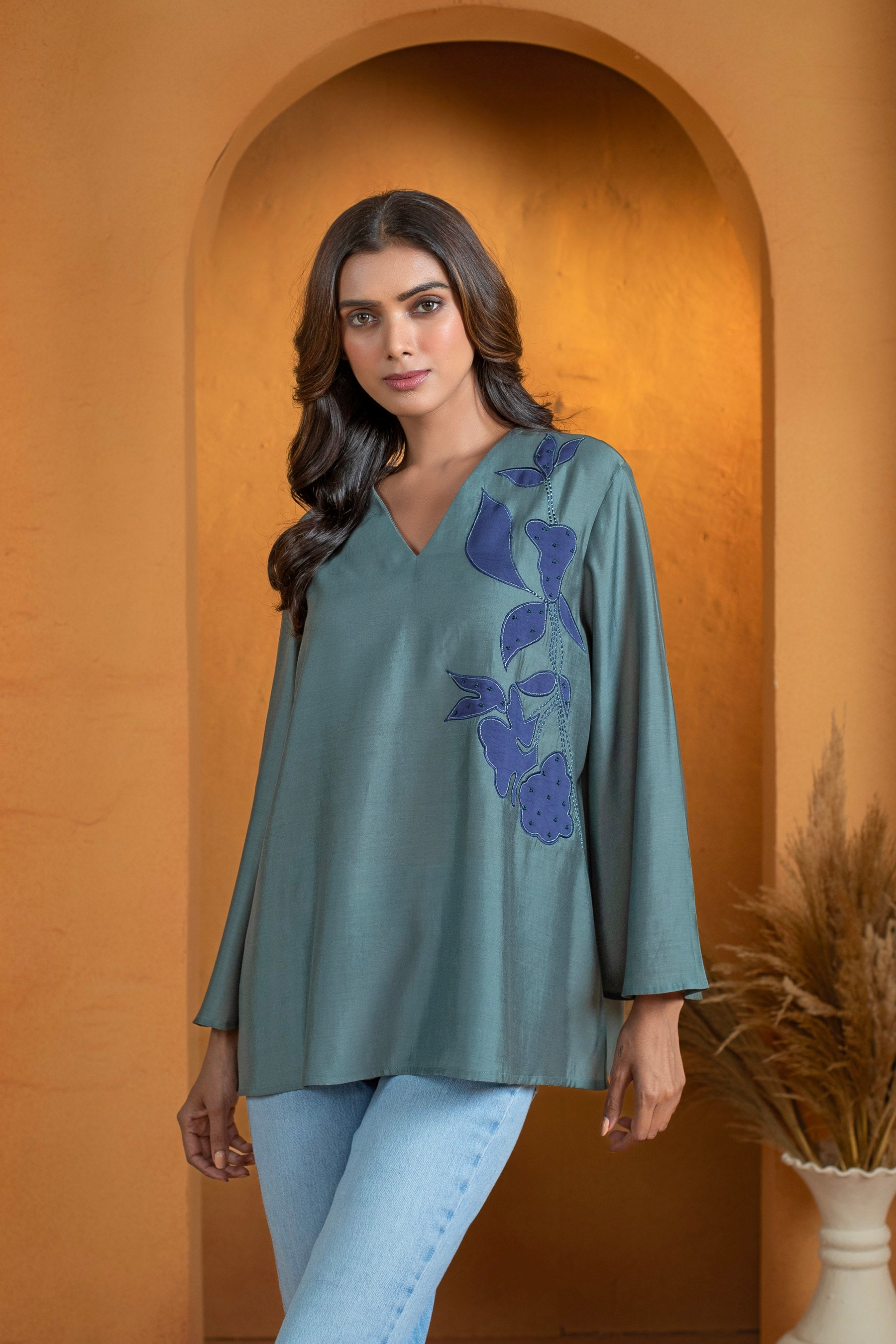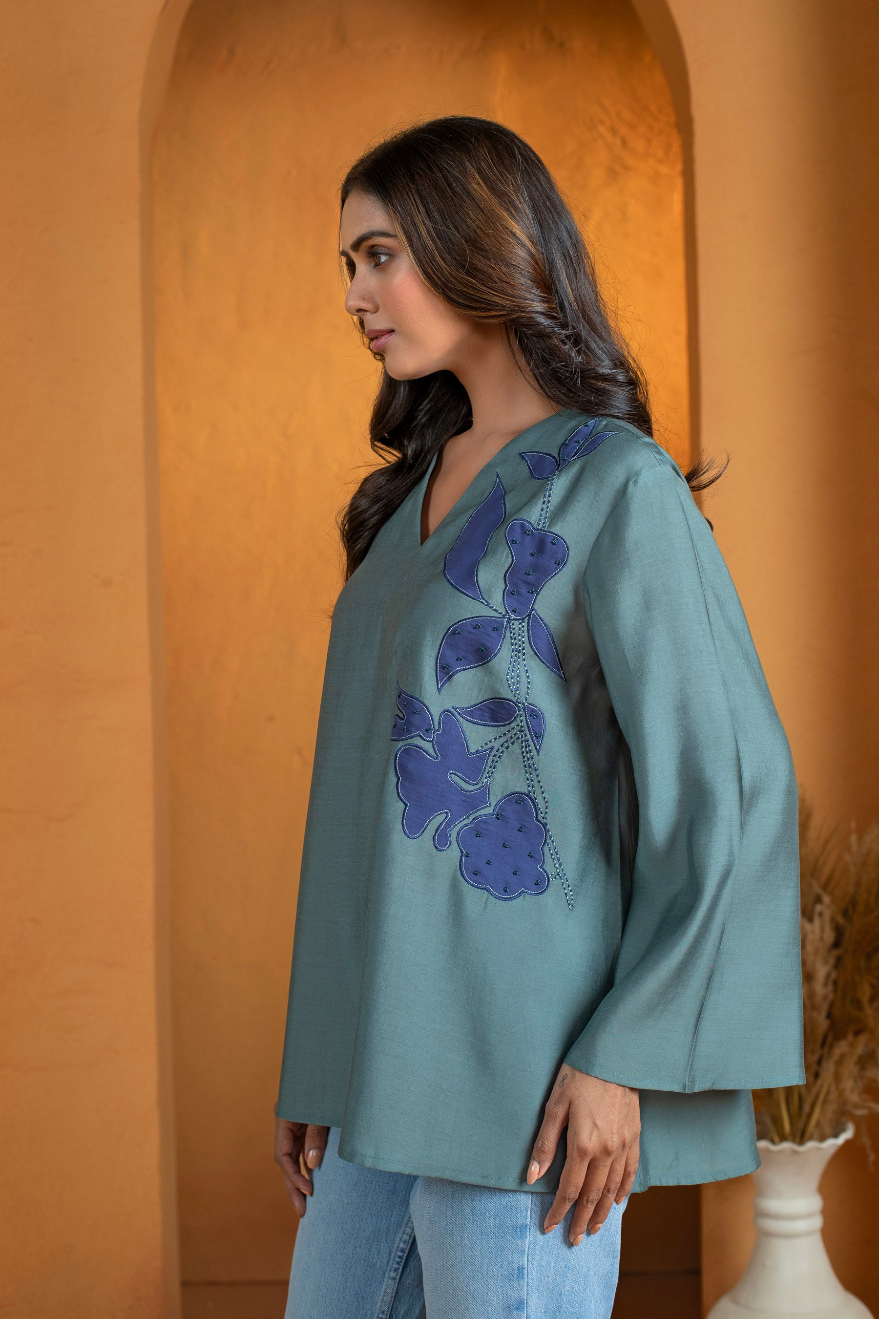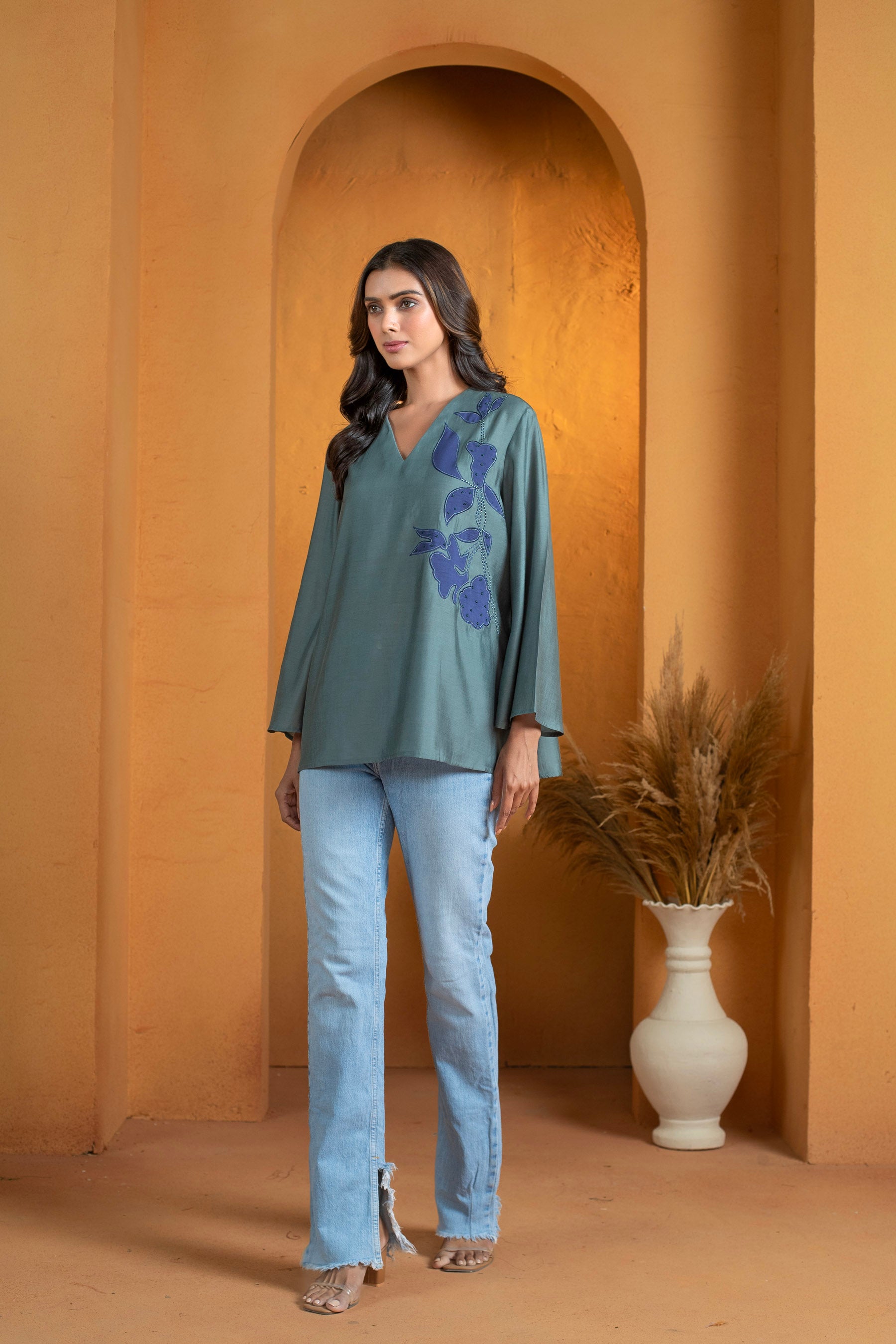 This top is a classic stye with one side patch work and some hand detailings on it. The colors are elegant and subtle. Th bell sleeves gives a graceful look to the top.