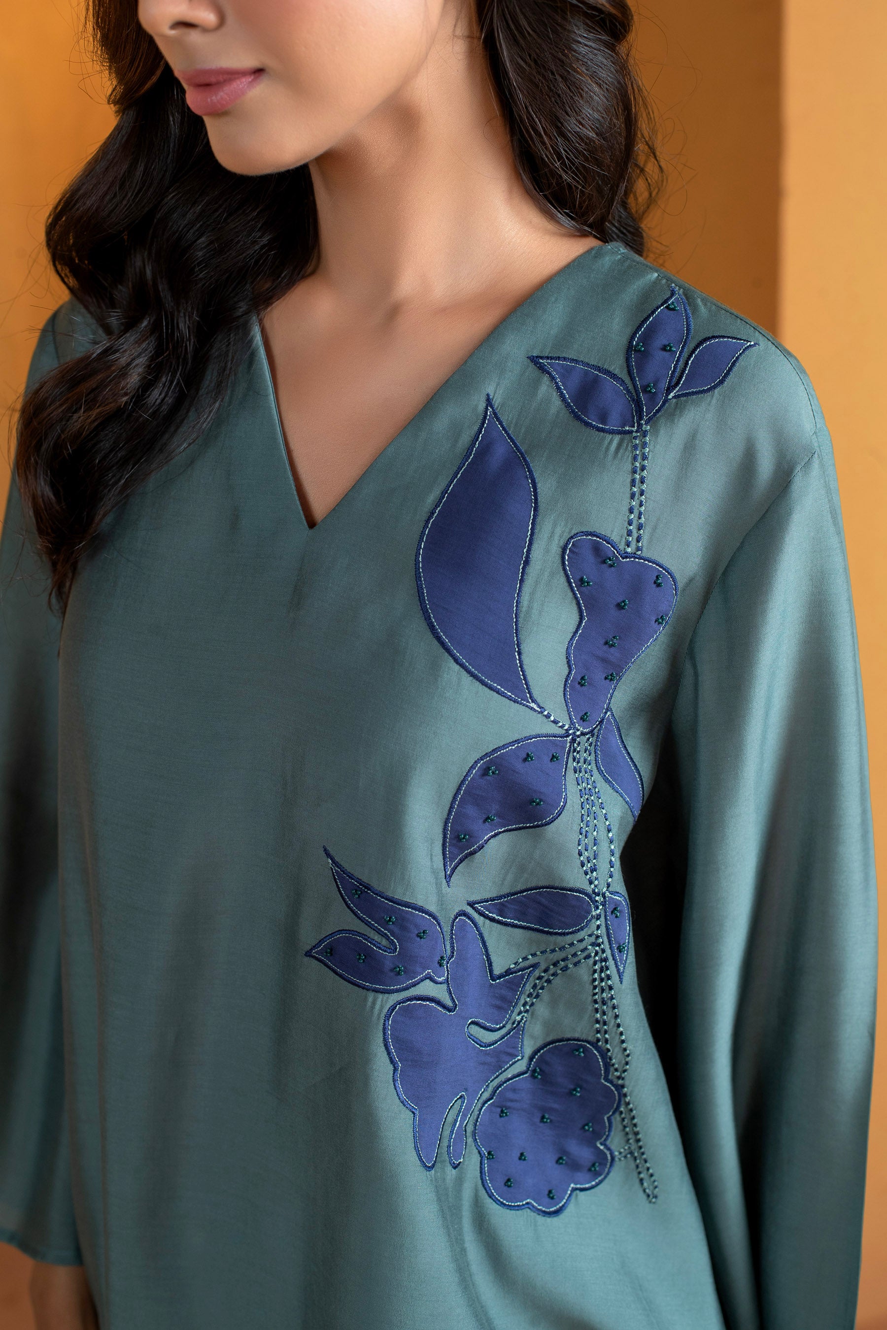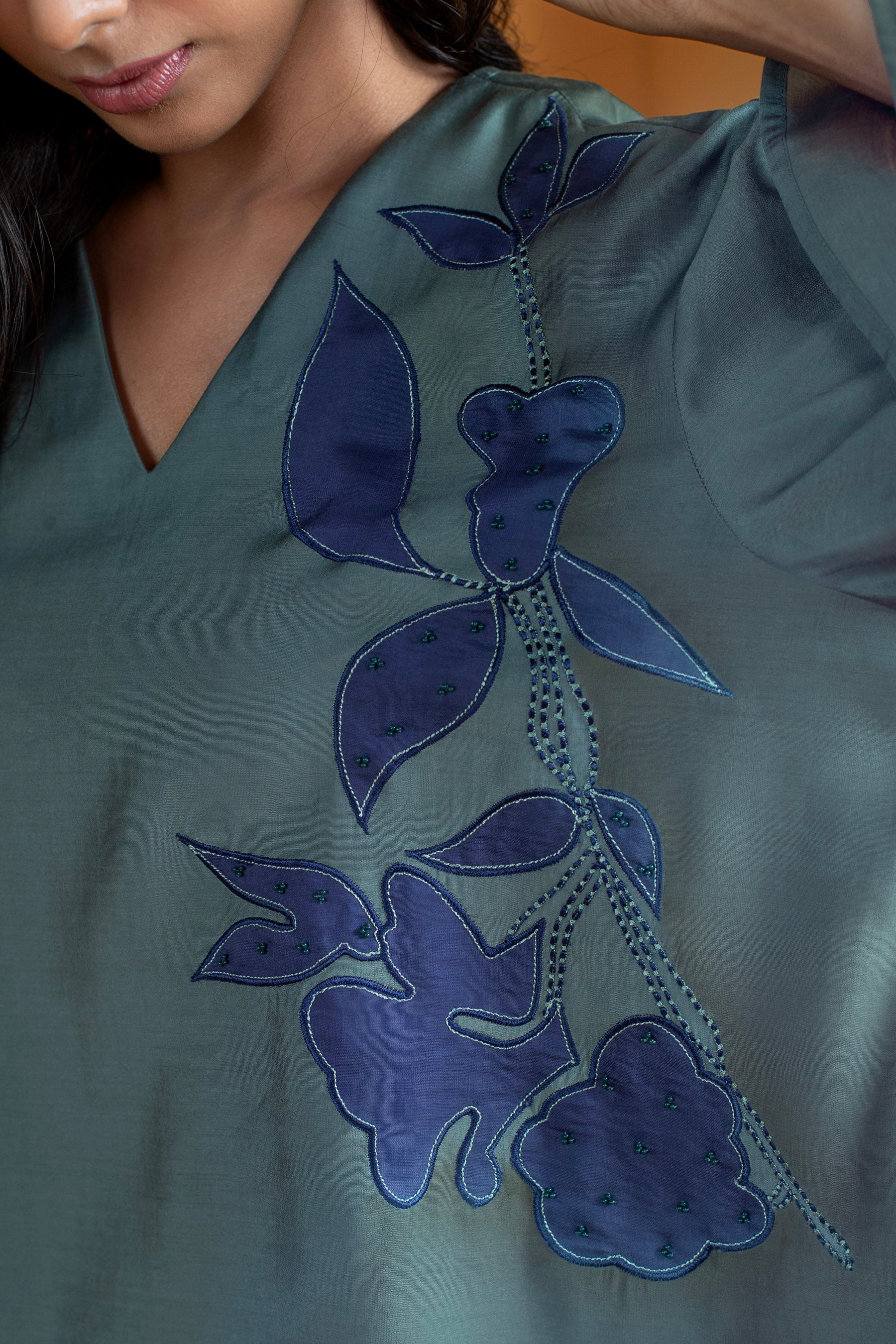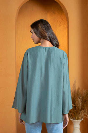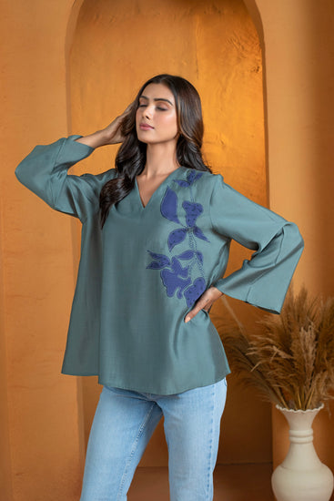 This top is a classic stye with one side patch work and some hand detailings on it. The colors are elegant and subtle. Th bell sleeves gives a graceful look to the top.
