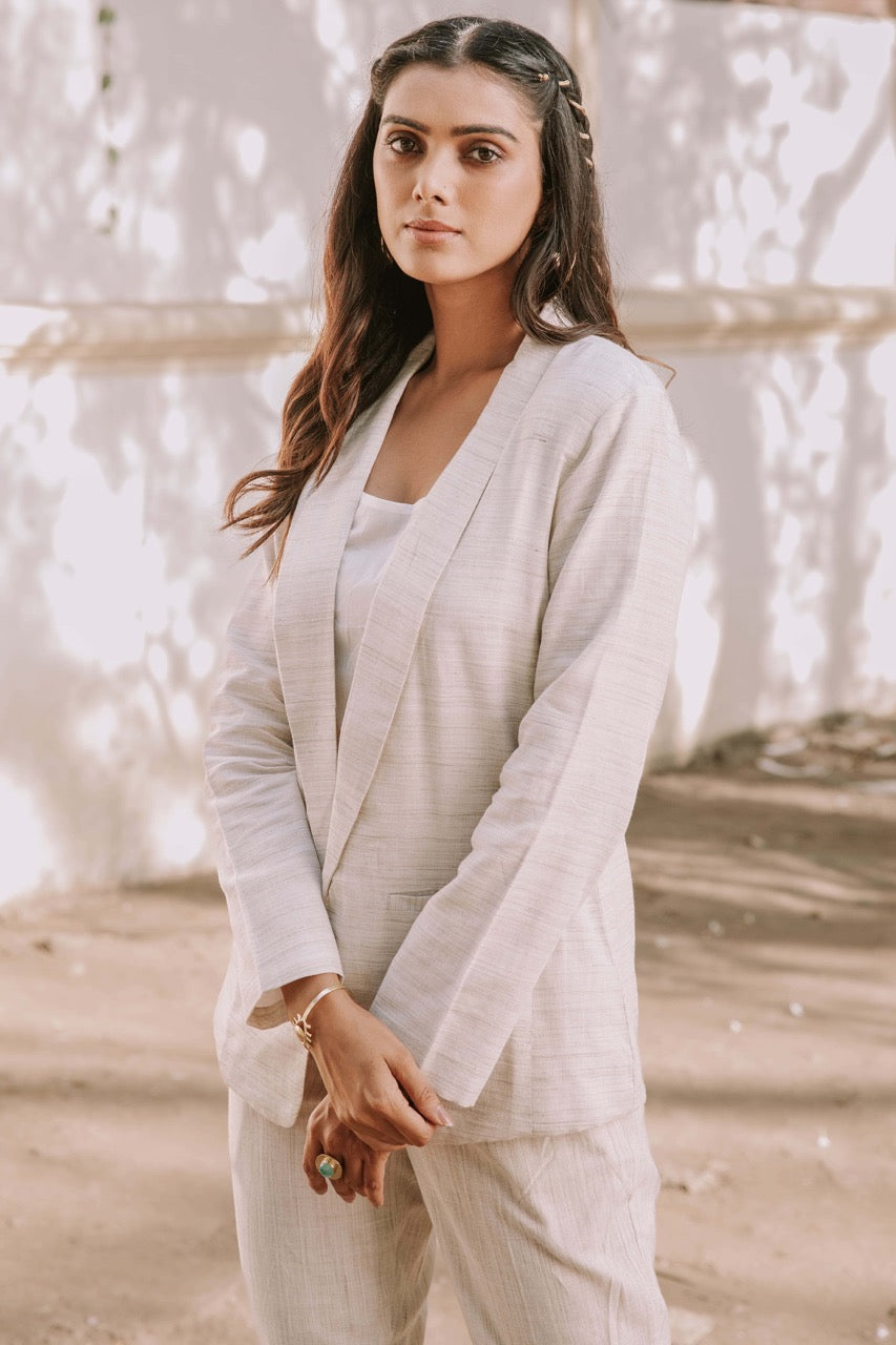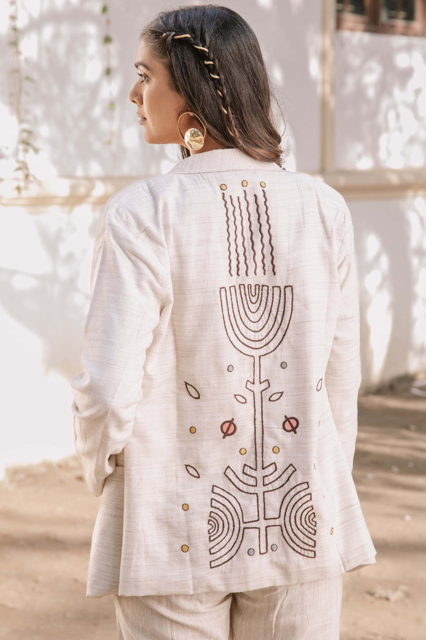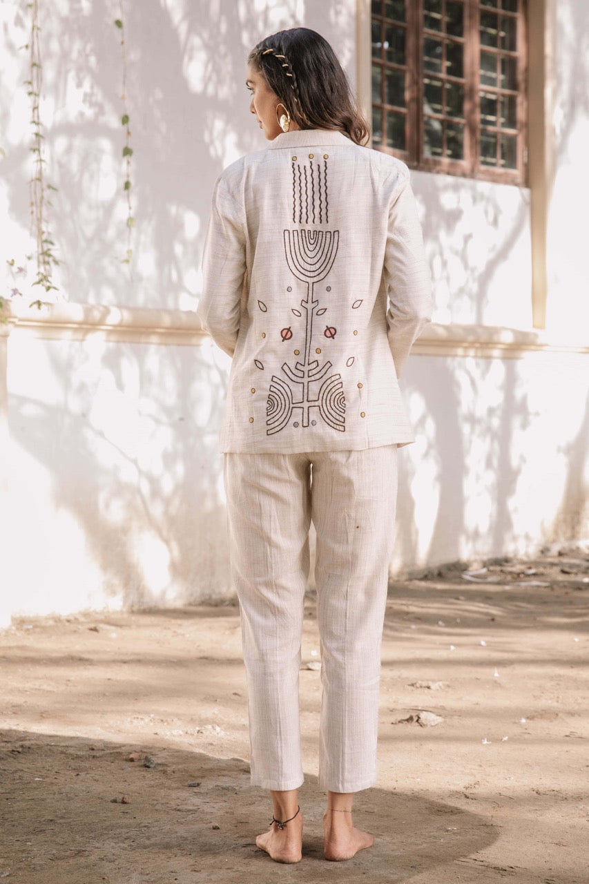 Introducing "Eternal,"a charming ensemble featuring a blazer, pants, and a sleeveless inner. Crafted from natural cotton fabric, the blazer boasts exquisite thread embroidery on the back, exuding a timeless and romantic appeal.