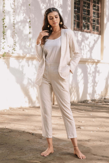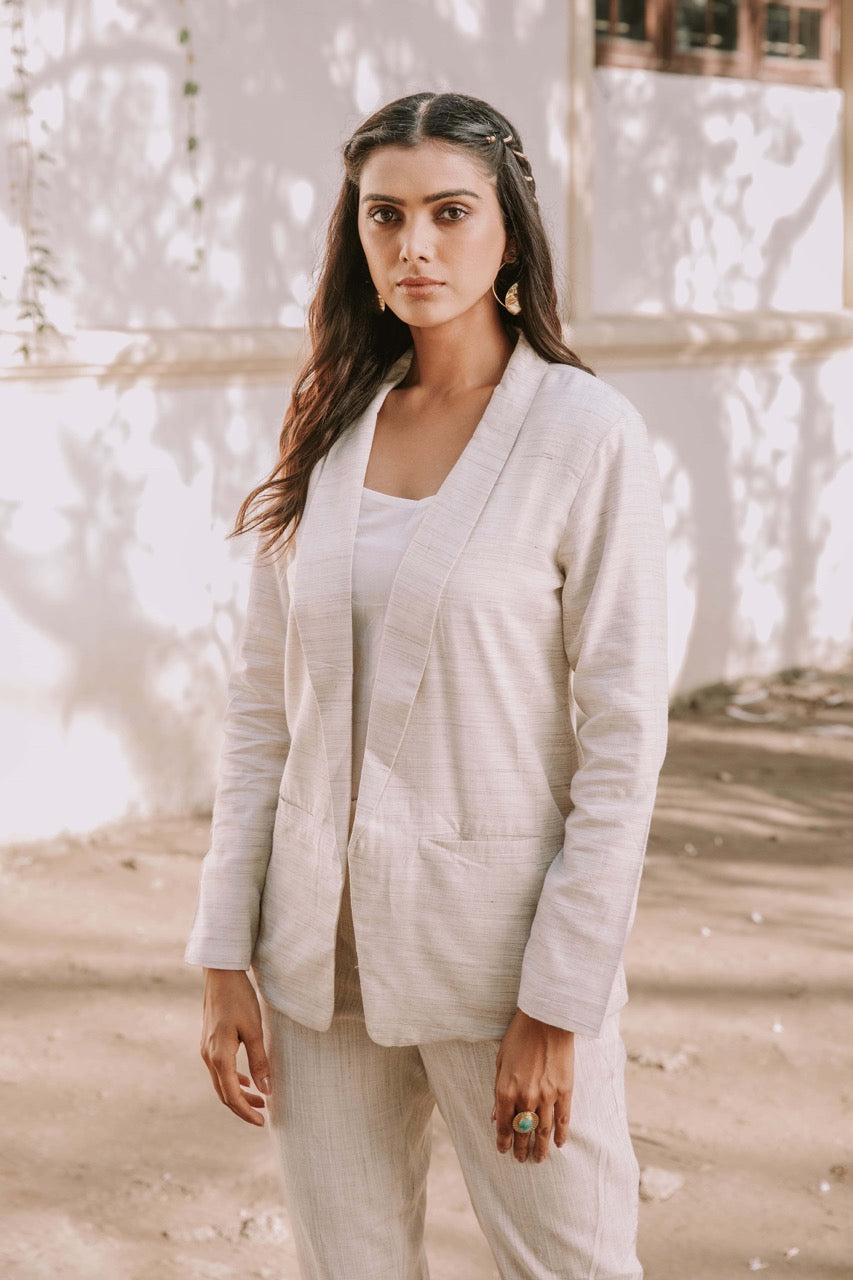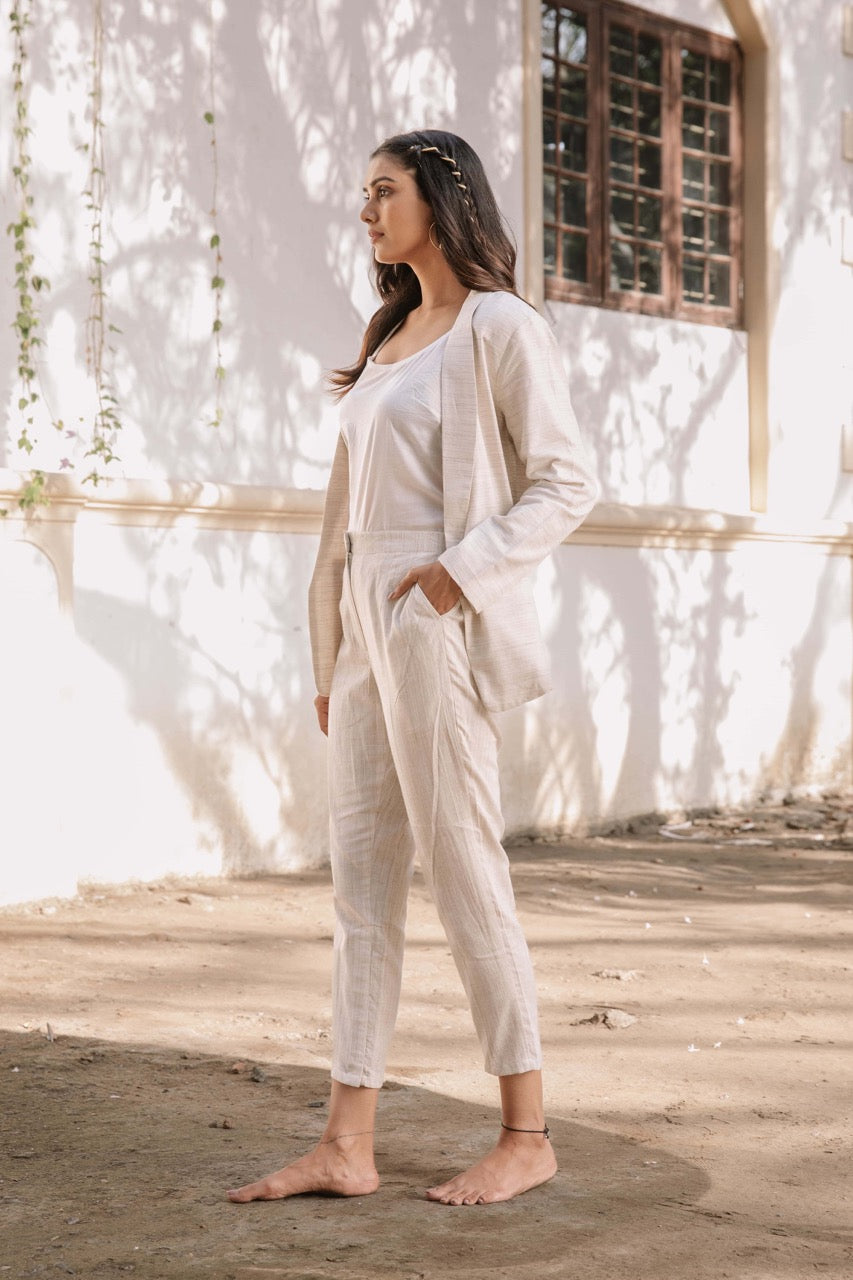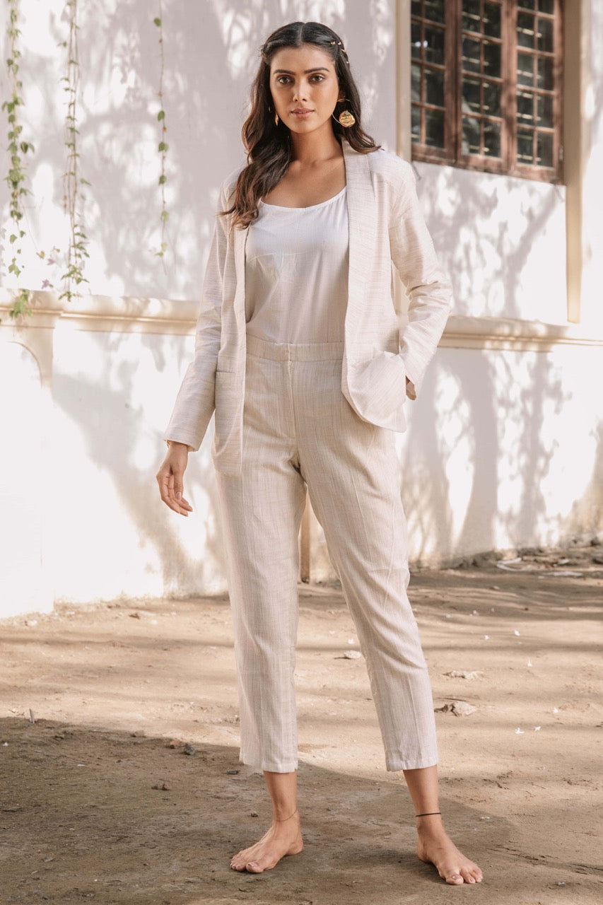 Introducing "Eternal,"a charming ensemble featuring a blazer, pants, and a sleeveless inner. Crafted from natural cotton fabric, the blazer boasts exquisite thread embroidery on the back, exuding a timeless and romantic appeal.