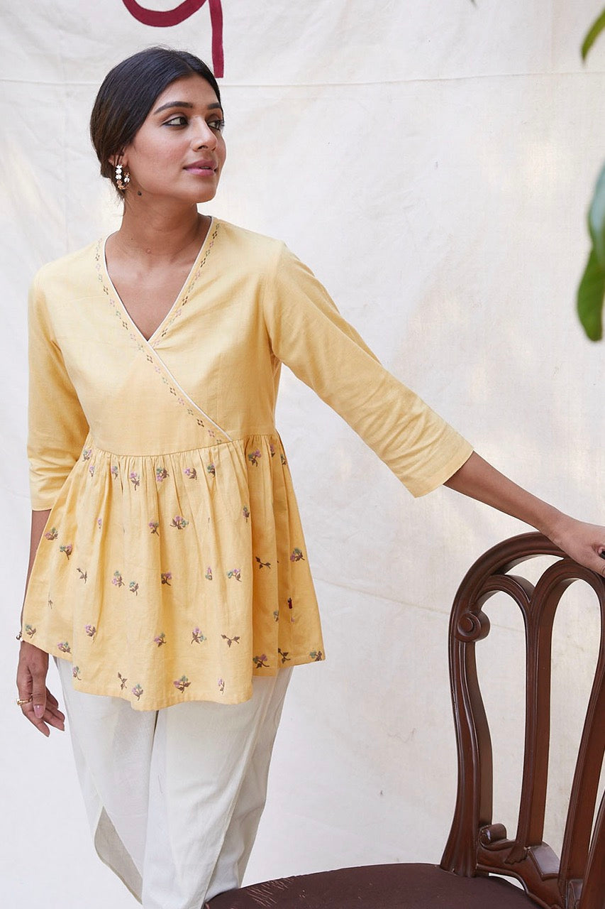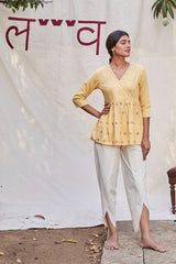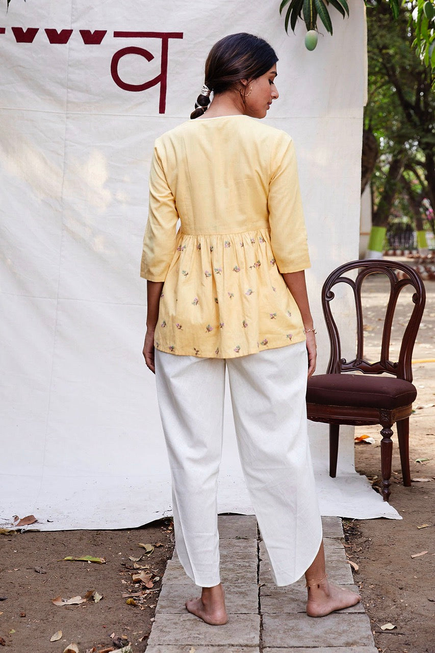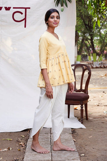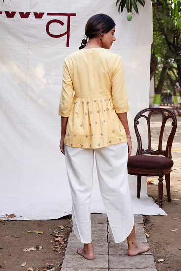 Pale yellow kurta with tulip pants to make ethnic wear fun and stylish.Pair it with your favourite juttis to enhance the look.
