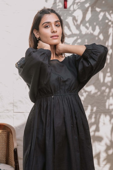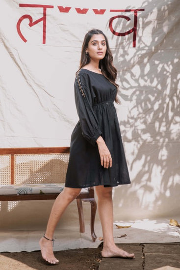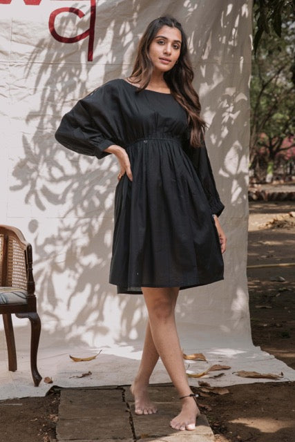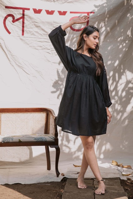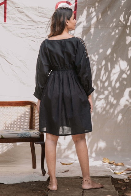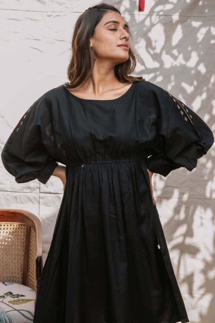 Black short dress with elasticated waist and sleeves are fun style to wear.Wear your favourite picks with it for a day out.Cute thread detailings on shoulder.