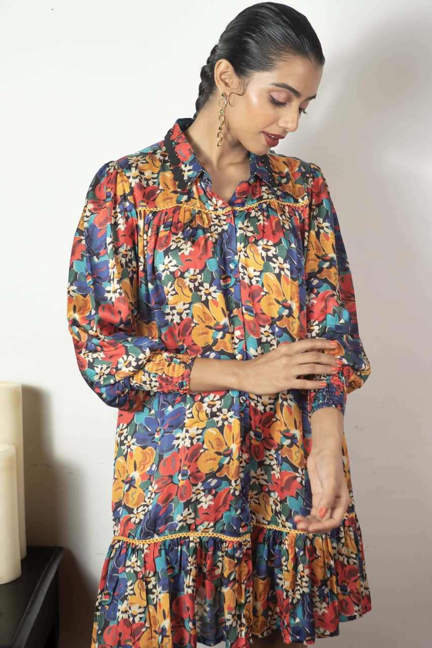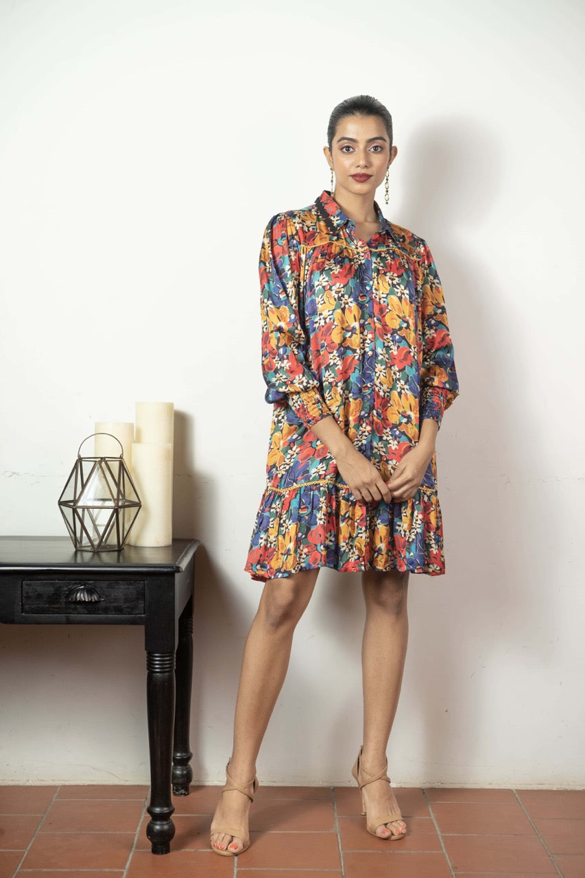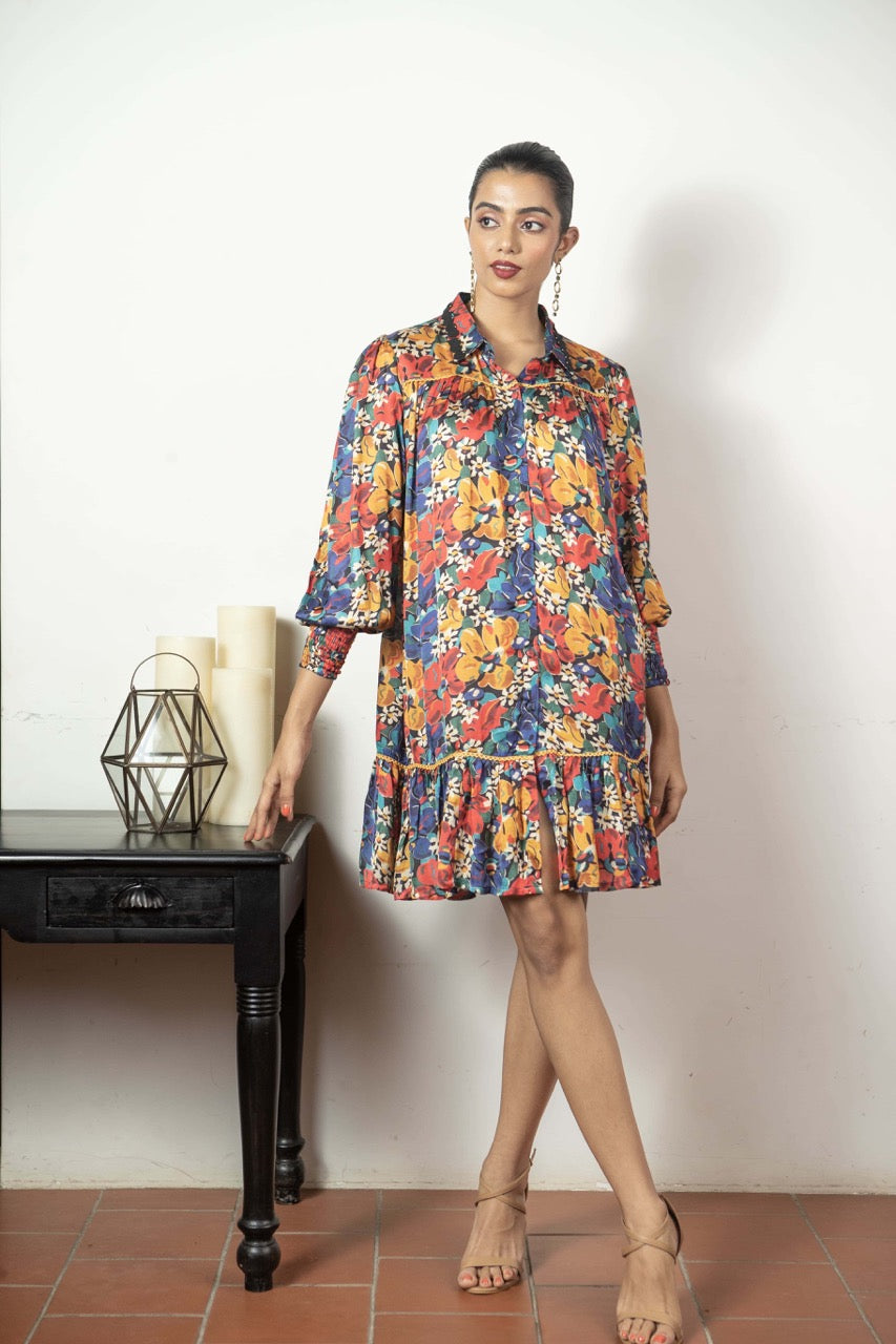Elysian, the captivating print from the Love Letter collection, graces this shirt dress with laser-cut collar detailing and smocked cuffs. Designed as a no-brainer outfit for all body types, it effortlessly suits any occasion, whether it's a casual day out, a party, or brunch. The vibrant print and modal satin fabric combine for a silhouette that's both chic and comfortable.
