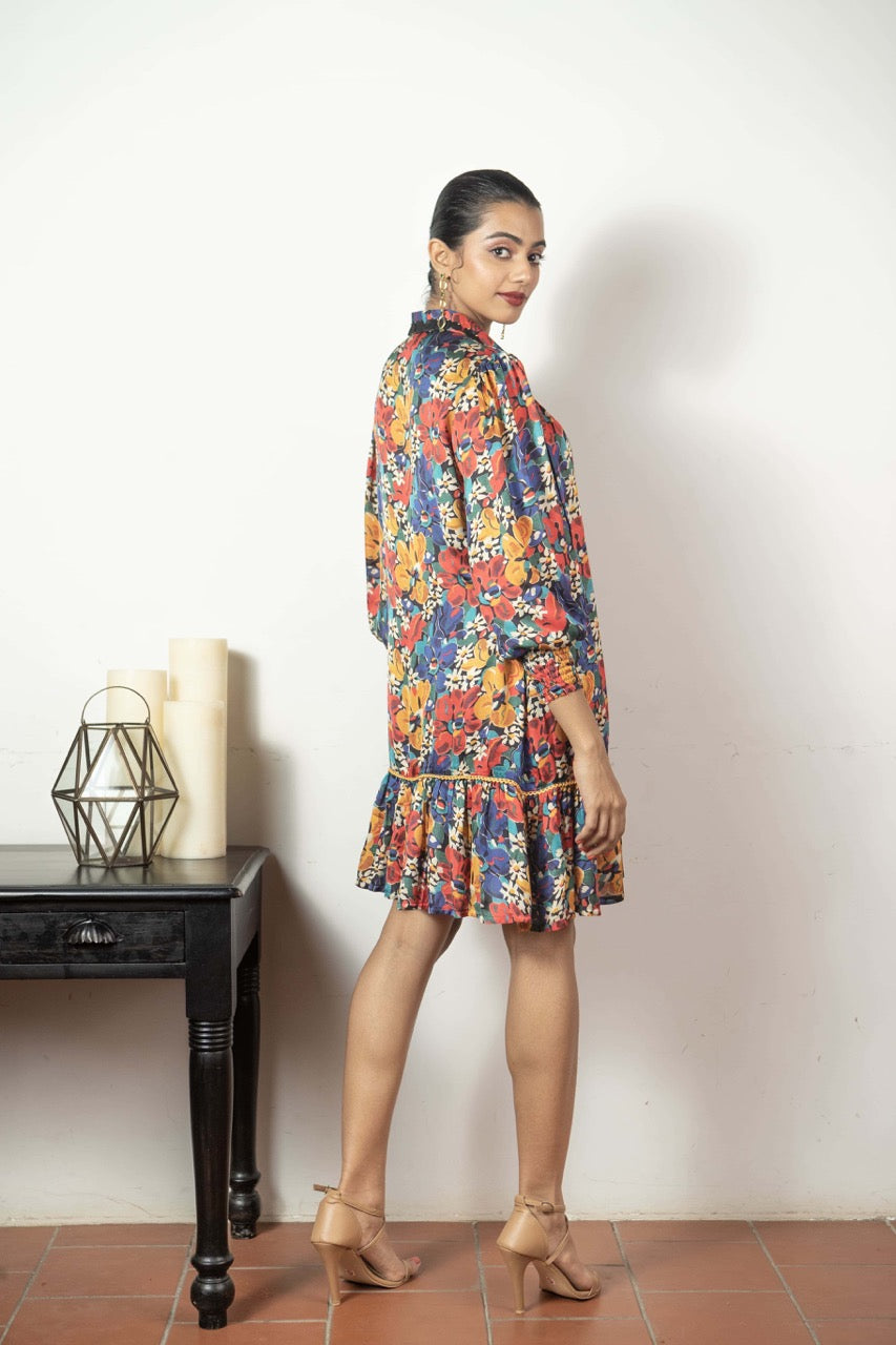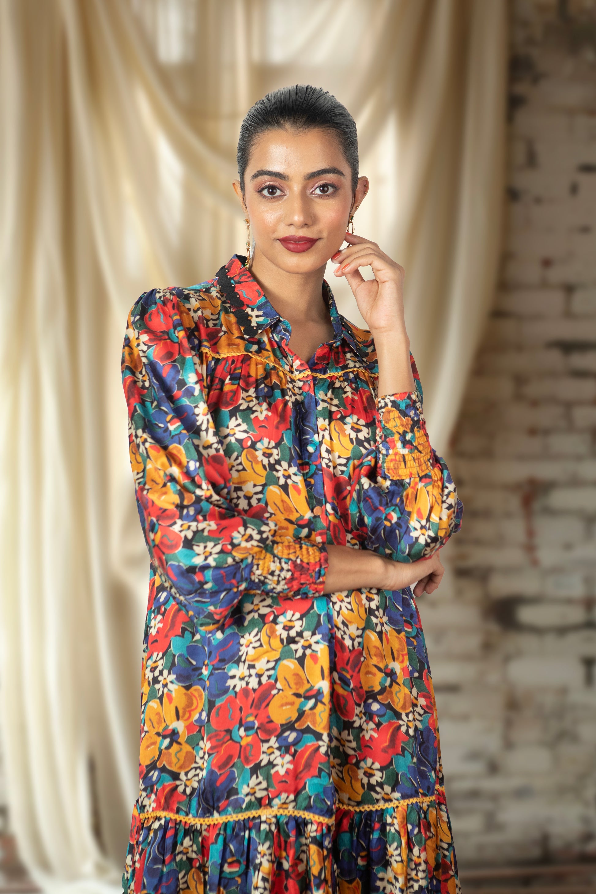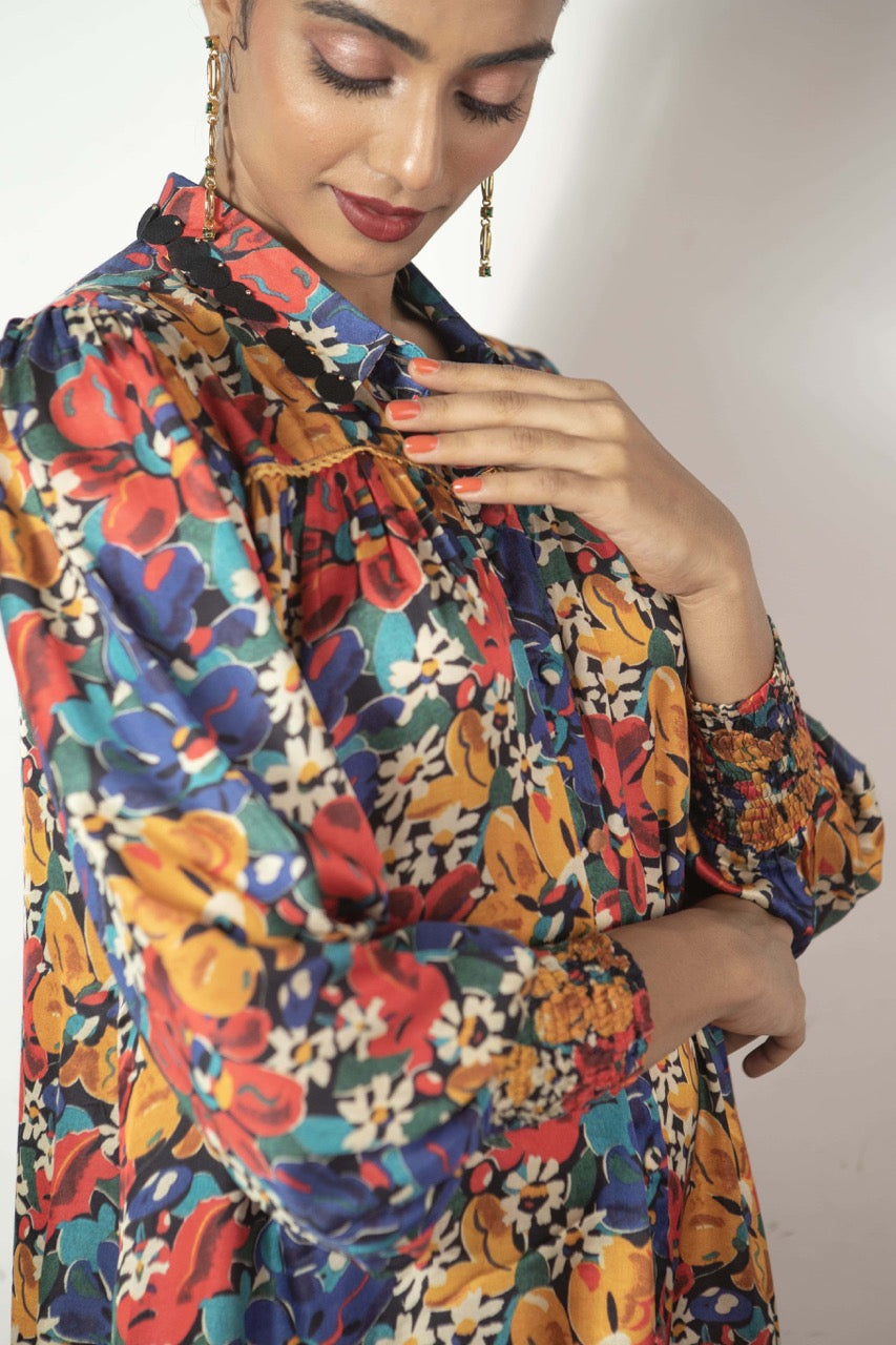 Elysian, the captivating print from the Love Letter collection, graces this shirt dress with laser-cut collar detailing and smocked cuffs. Designed as a no-brainer outfit for all body types, it effortlessly suits any occasion, whether it's a casual day out, a party, or brunch. The vibrant print and modal satin fabric combine for a silhouette that's both chic and comfortable.