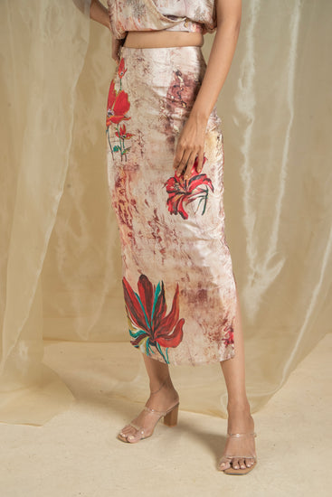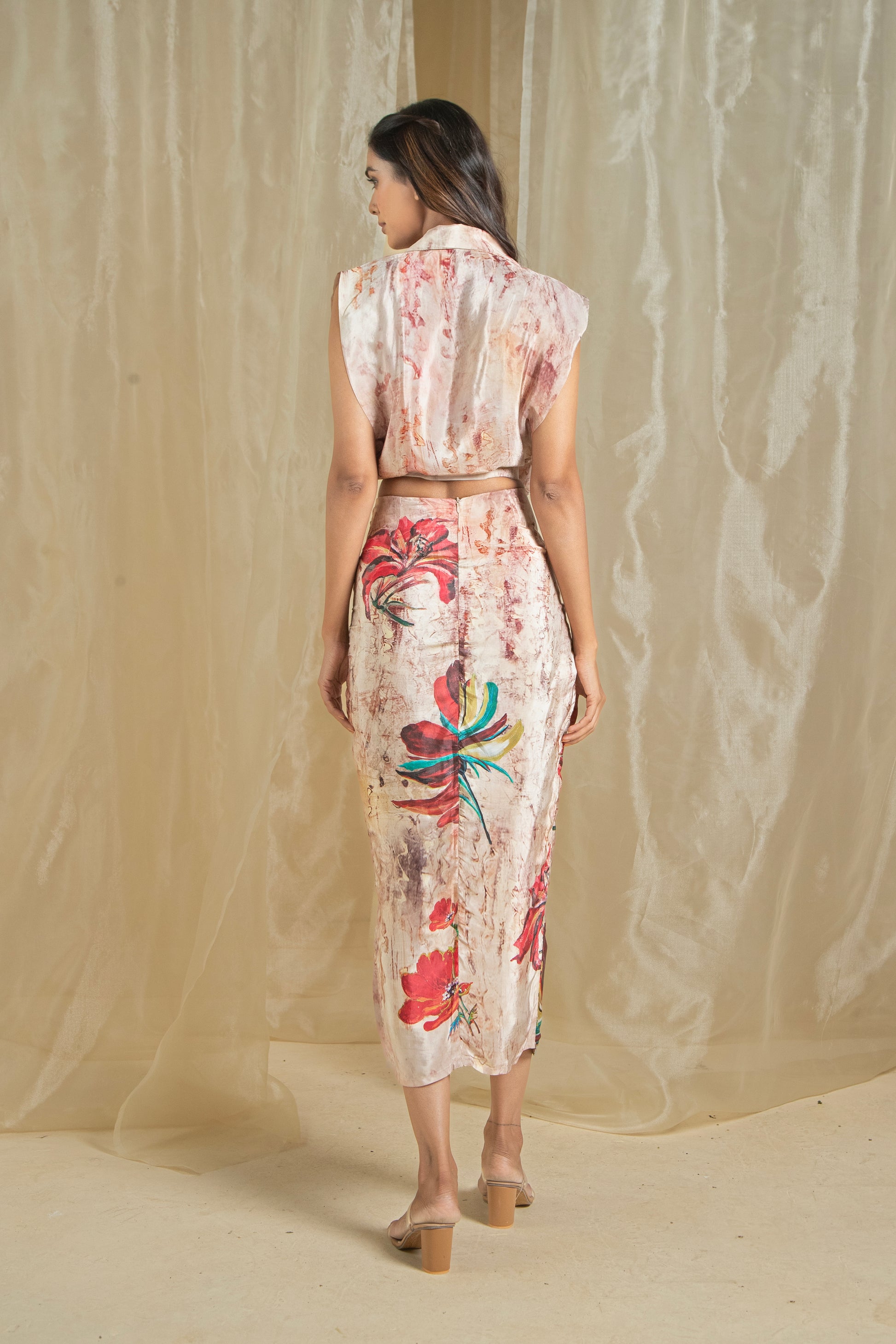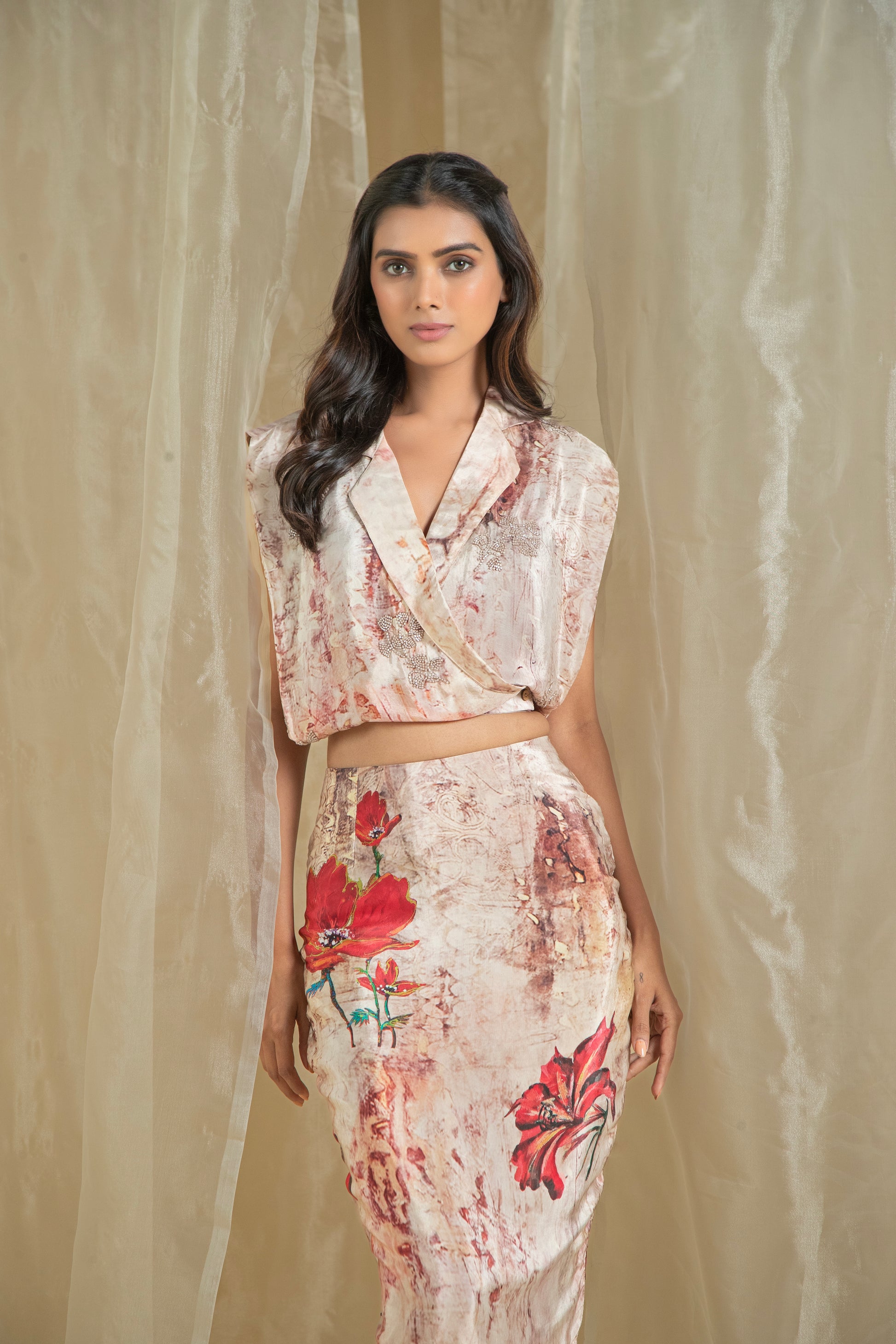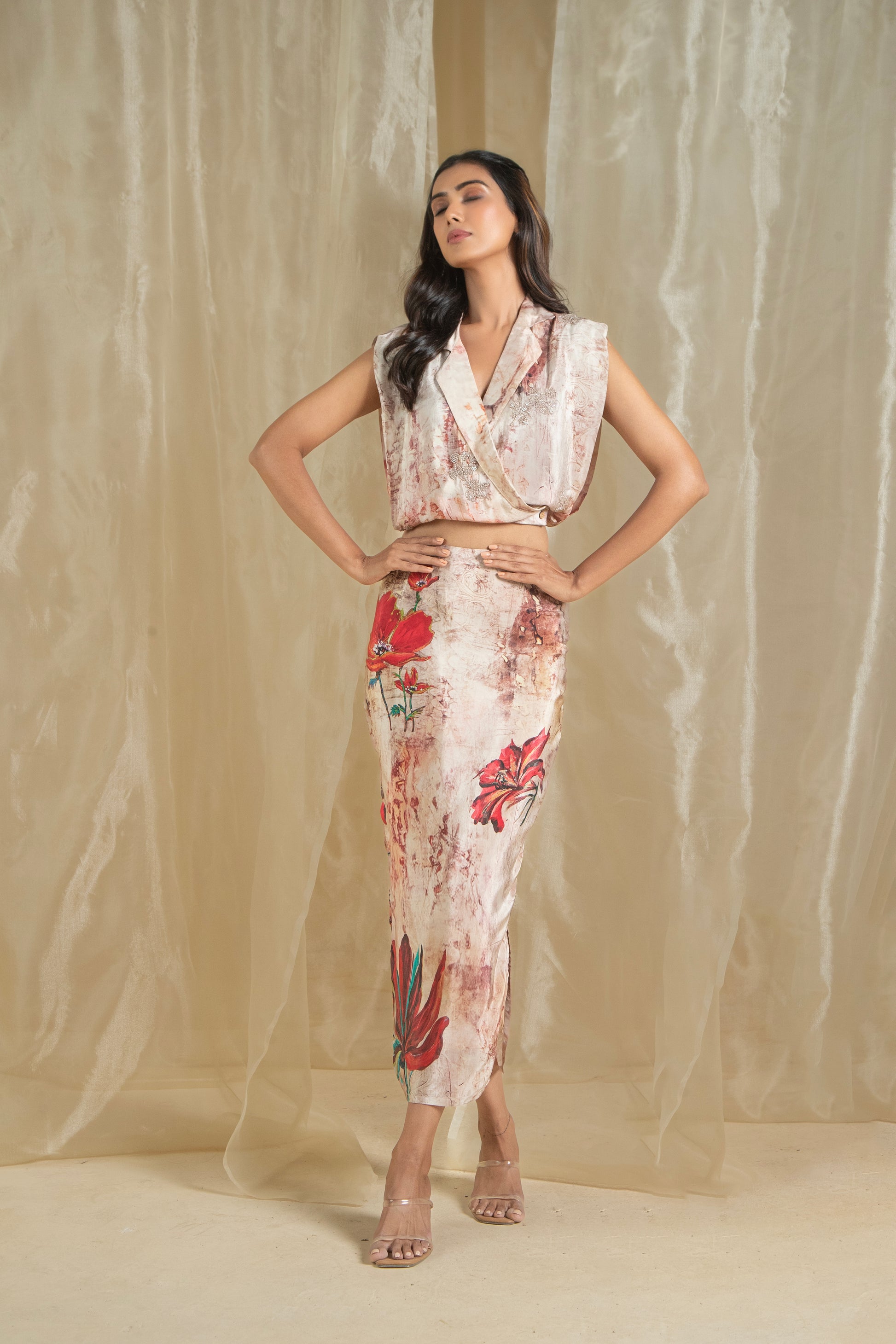 Elevate your style with our Lovescape Floral Pencil Skirt Set, where art meets elegance. This set features a striking floral motif, digitally printed on a background with a rich beige and brown raw texture. The vibrant flowers add a pop of color, making the design stand out beautifully. The top, with its lapel collar and padded shoulders, exudes a formal yet stylish vibe, while the cinched waist creates a flattering silhouette. Hand-embroidered beaded motifs on the top add just the right amount of glam.