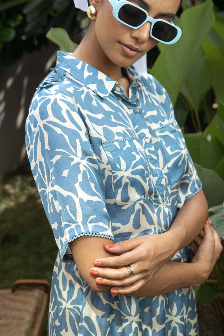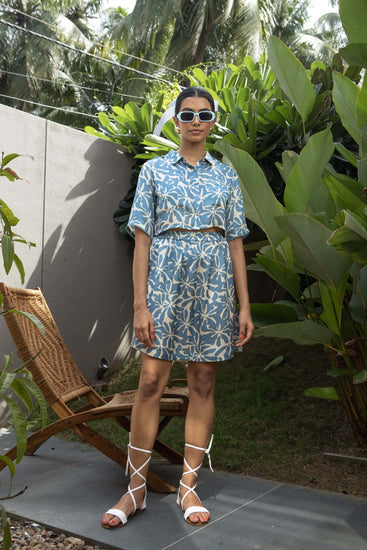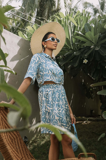 Euphoria, a delightful print from the Love Letter collection, brings a cool and quirky charm to this ensemble. Featuring a cropped shirt with elbow sleeves and an above-the-knee skirt, this versatile set exudes a soothing and happy vibe, perfect for all ages. The cropped shirt can be styled open with a tube top inside, while the skirt pairs seamlessly with various tops or shirts for endless outfit possibilities.