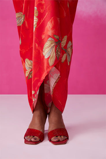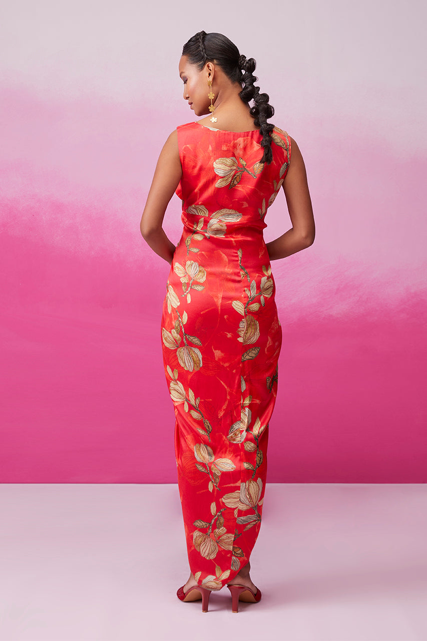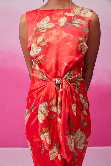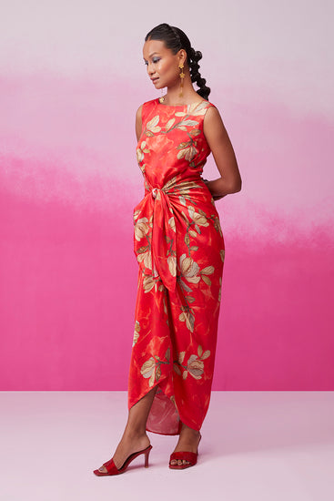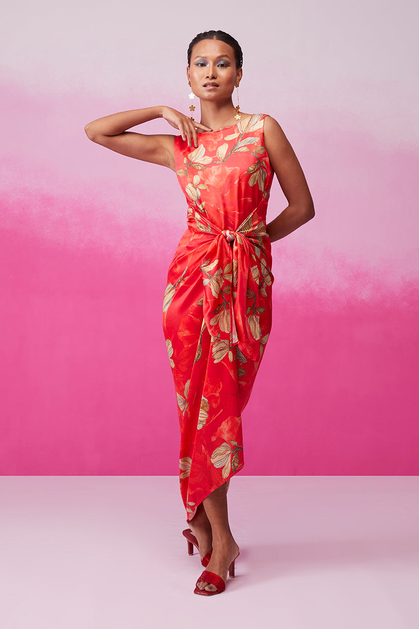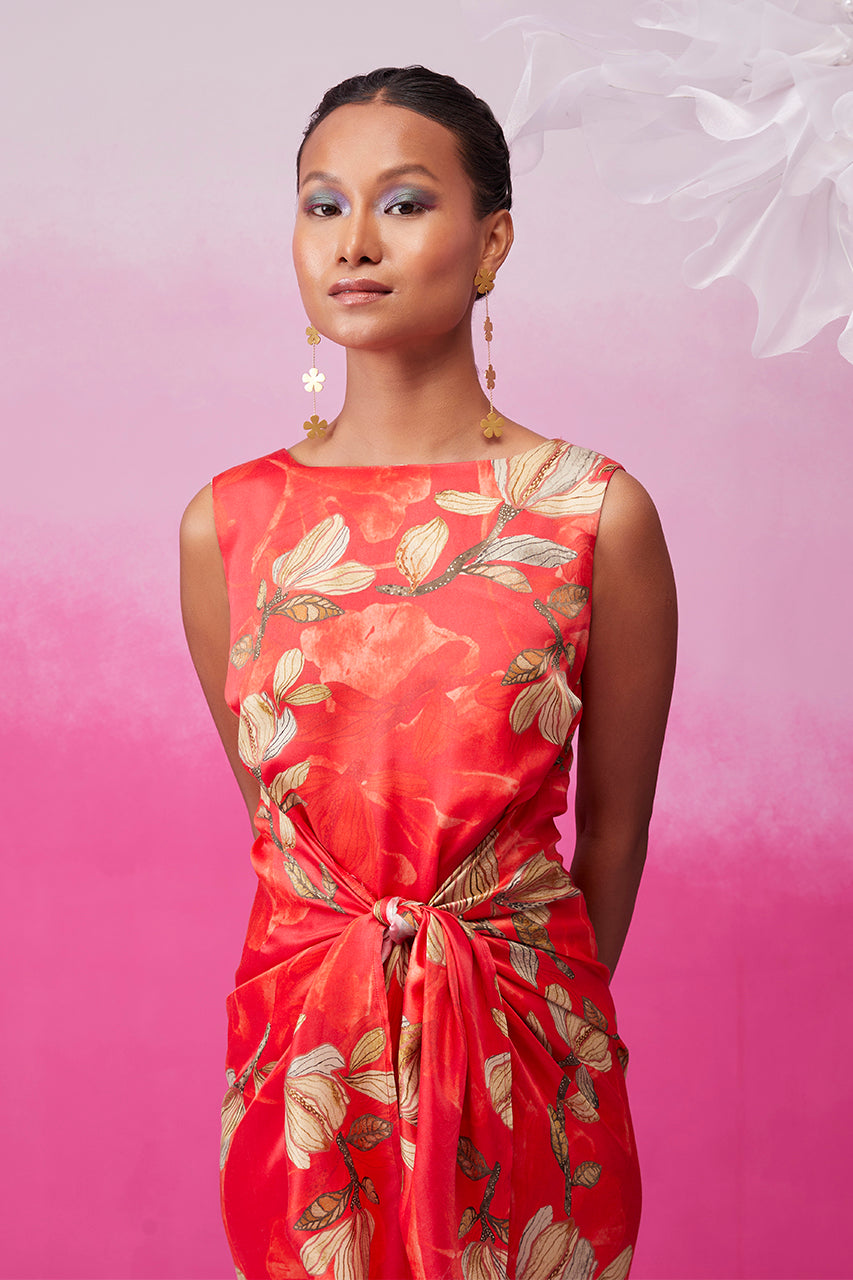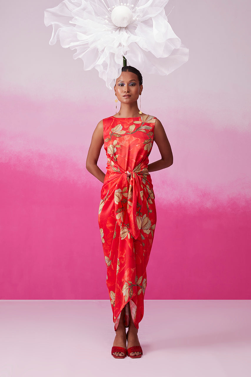 Step into sophistication with "Feminine Fern" by Call it Love. This red floral fern print cocktail dress boasts a tie-up pattern that accentuates your shape. The sleeveless design is a statement on its own, requiring just a pair of earrings to complete the look. The calf length flatters every body type, ensuring an effortlessly chic ensemble.