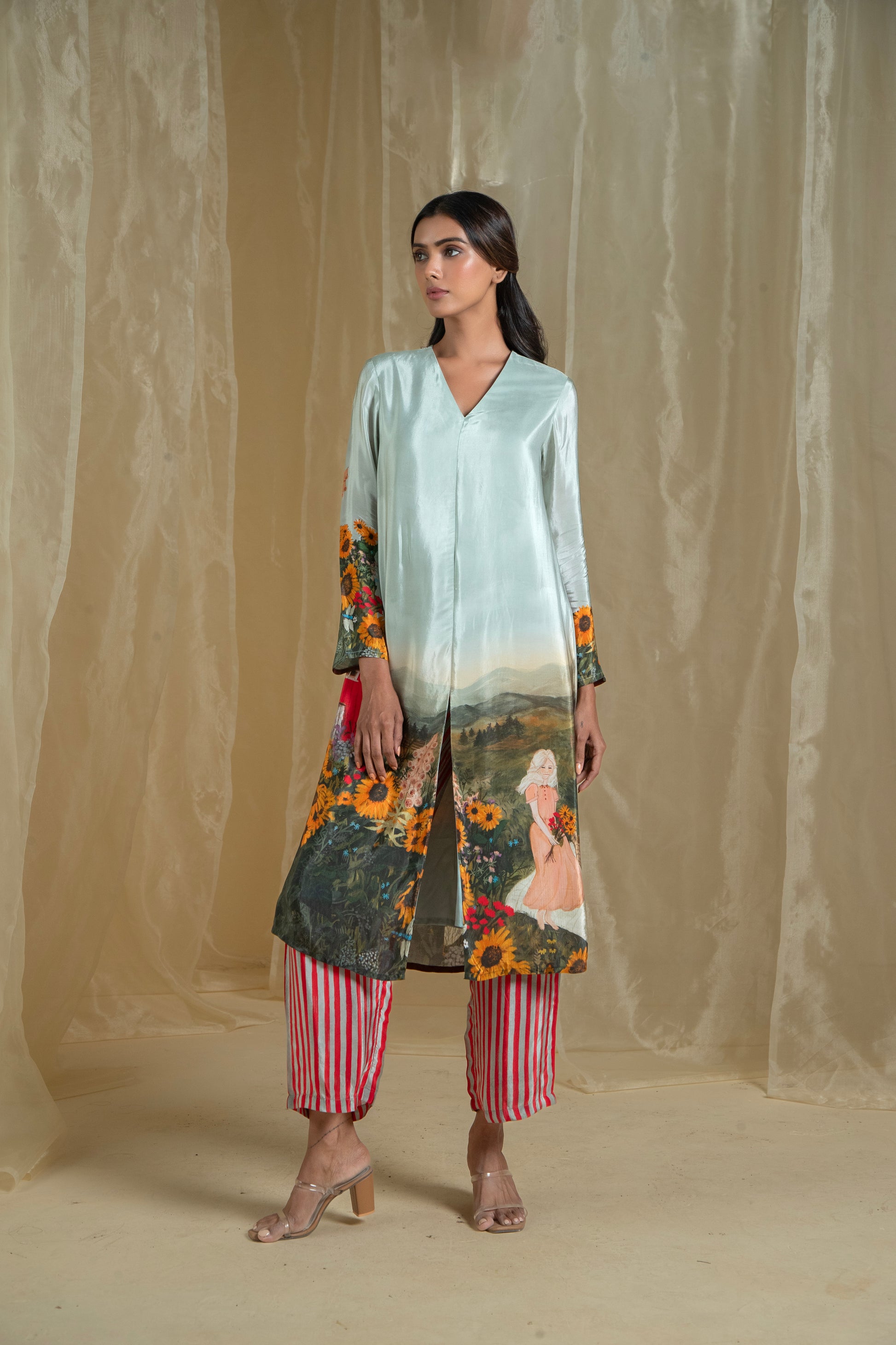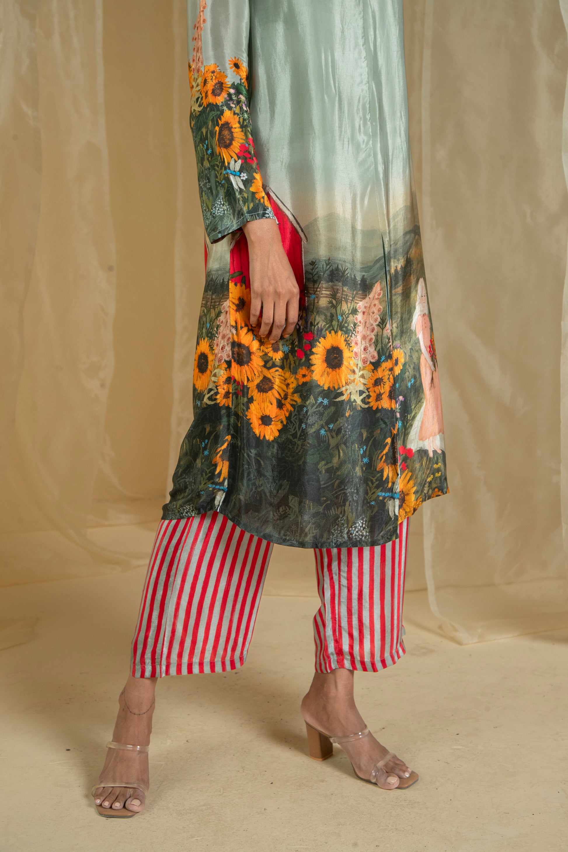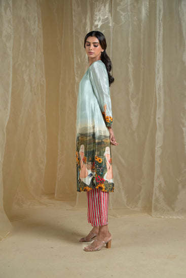 The pants are enhanced with red and tinted blue stripes for a practical and stylish touch. The top’s long length and fusion silhouette offer a flattering fit for all body types, blending elegance with everyday wearability. Made from pure natural crepe, this set combines comfort and style, making it a perfect choice for any occasion.
