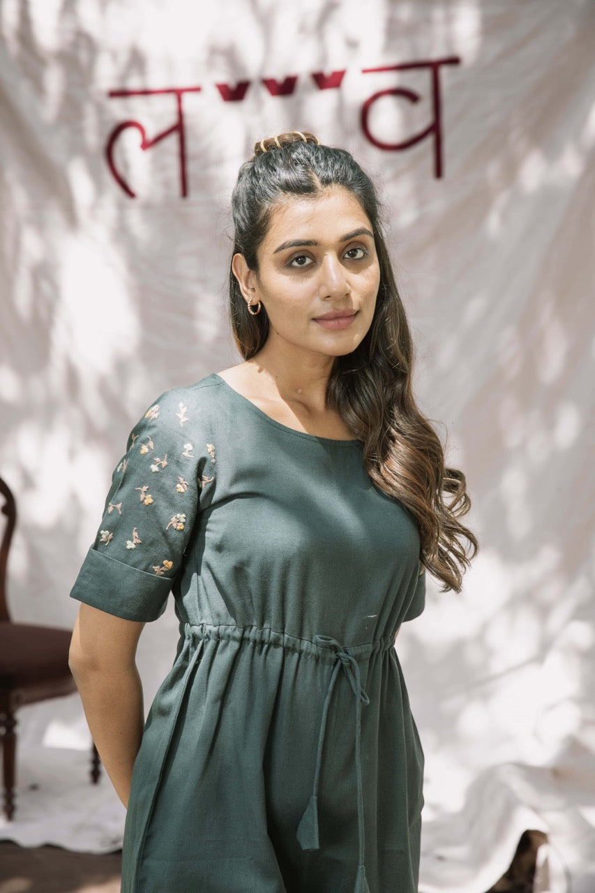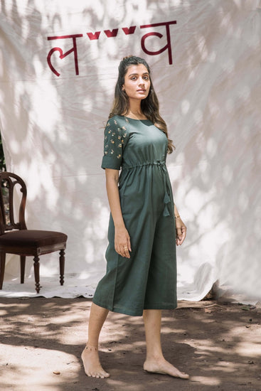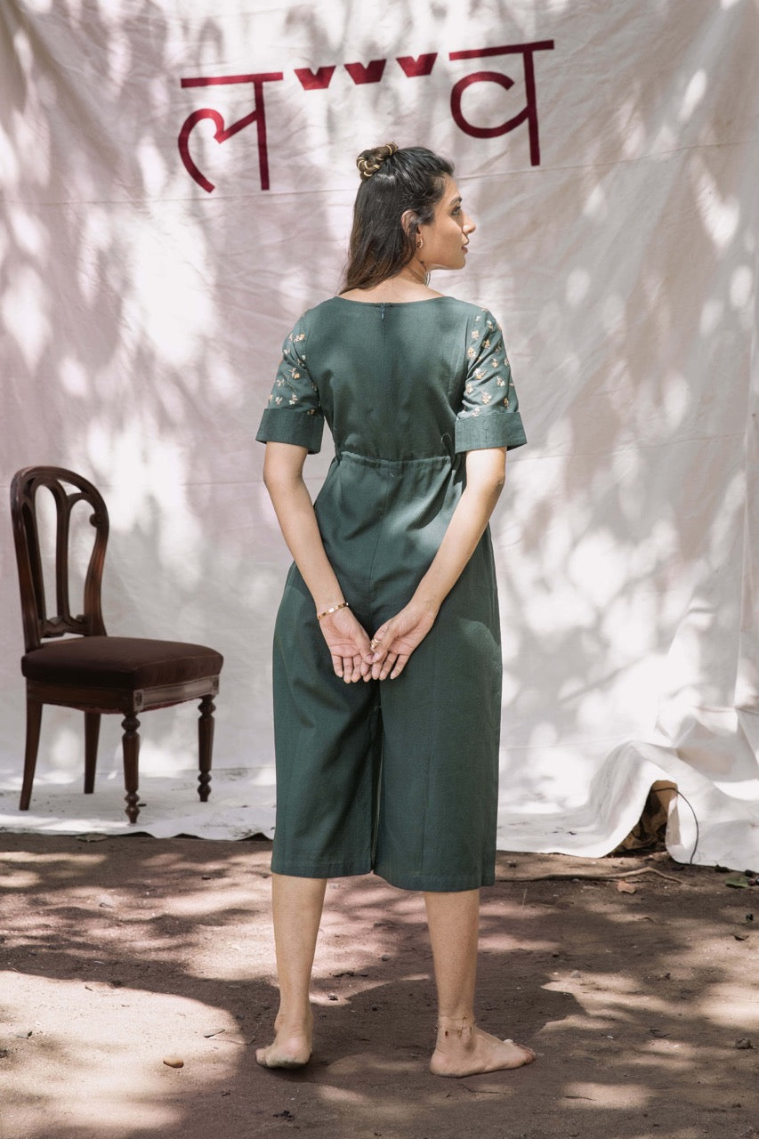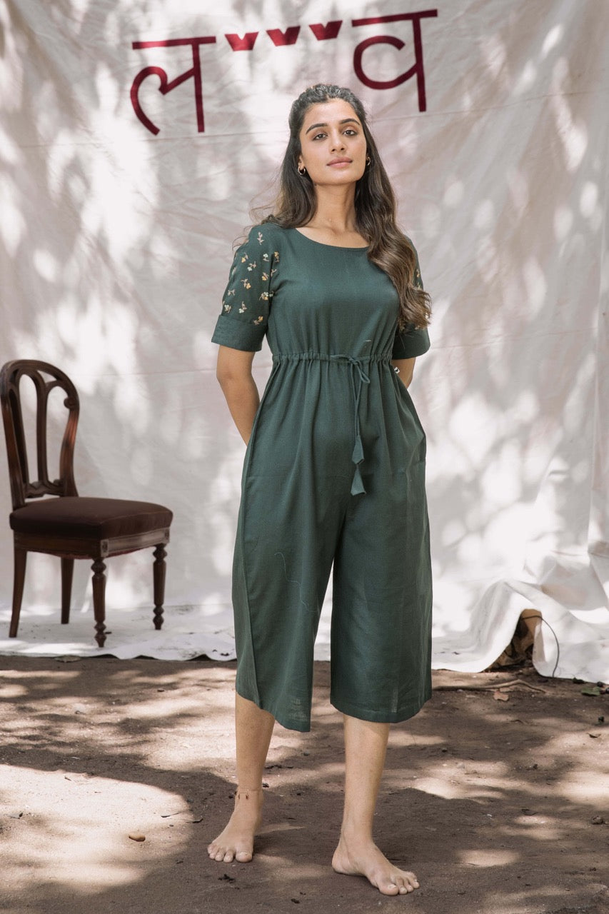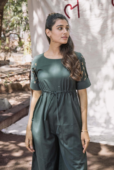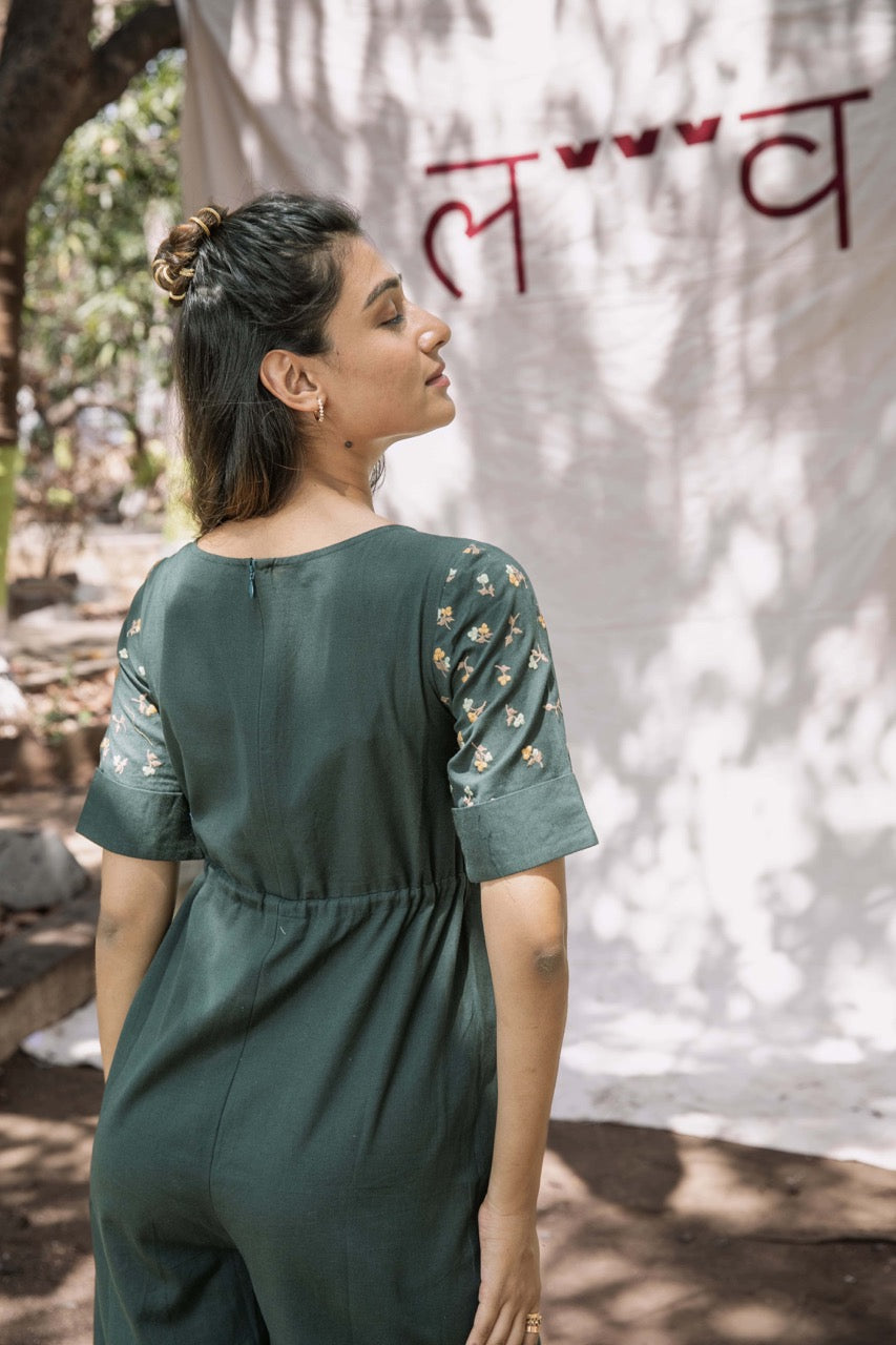 Emrald green jumpsuit with floral thread detailling on sleeves is a perfect style to wear for travel or on holidays.Pair it with your favourite pics and enhance the look.