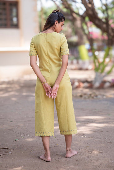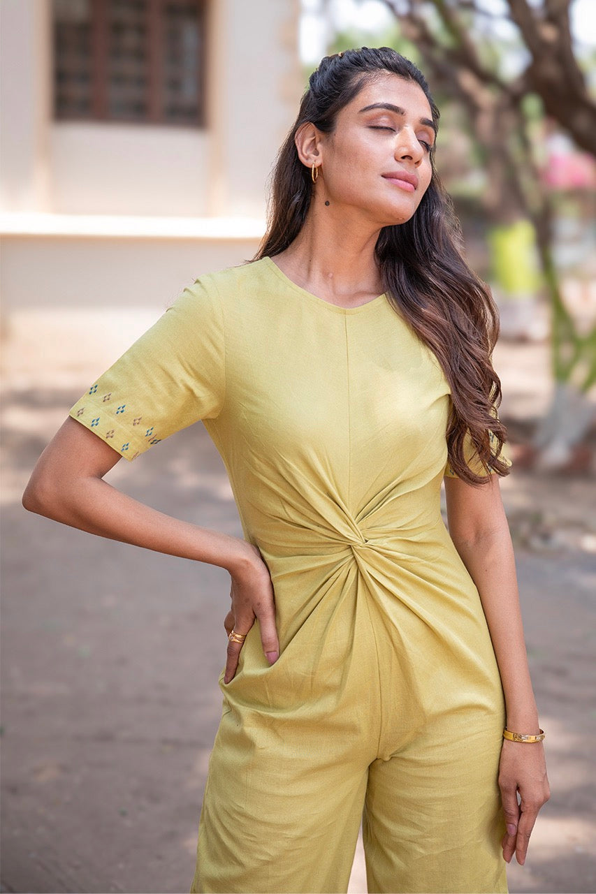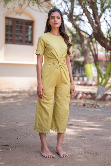 Lemon green center knot jumpsuit gives you a stylish look and has cute detailling on sleeve.Pair with your favourite tote bag and enjoy your day.