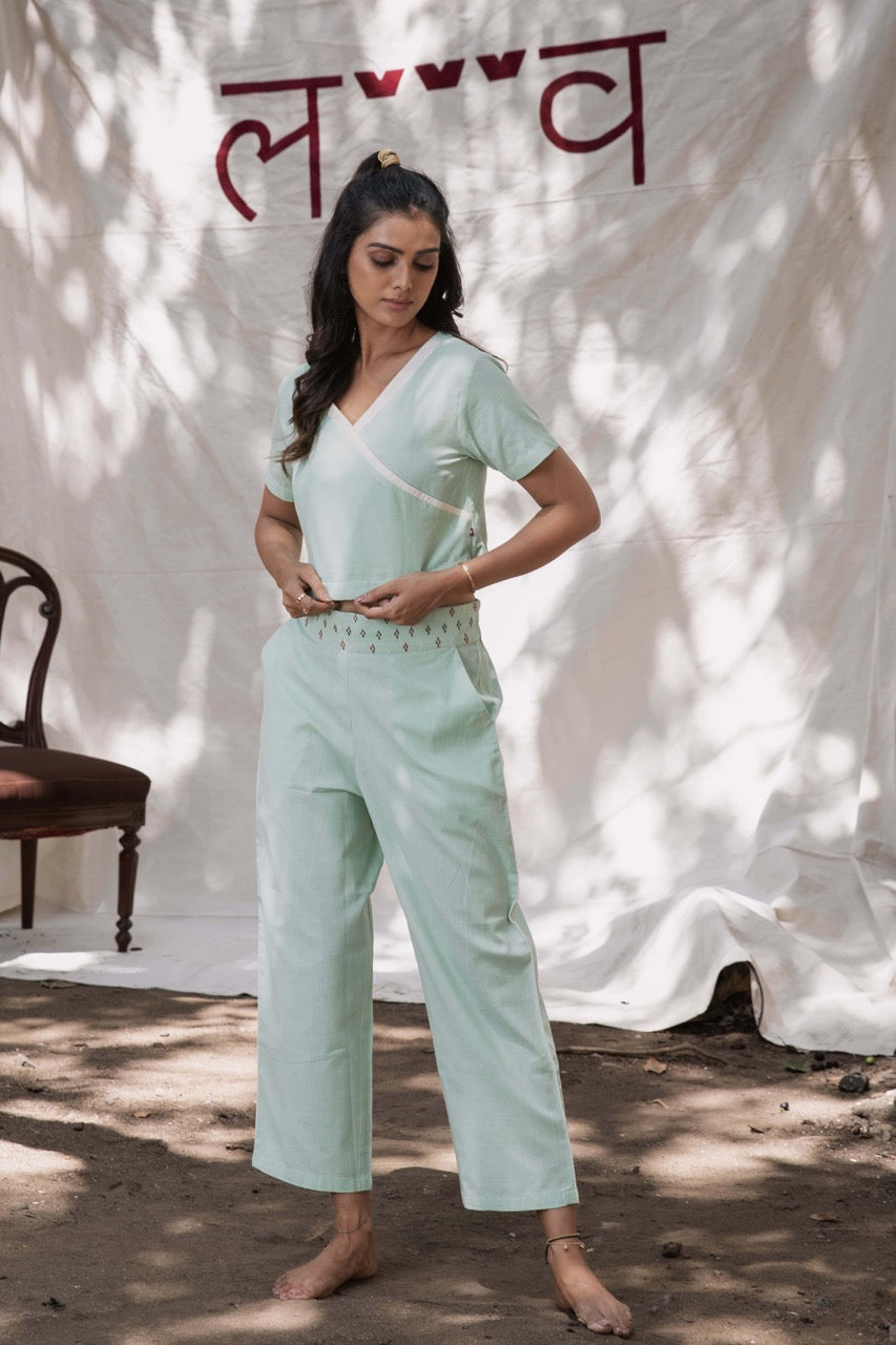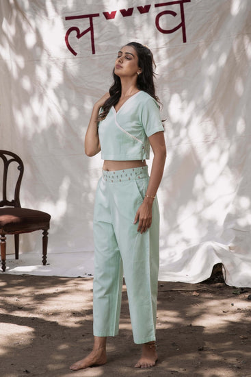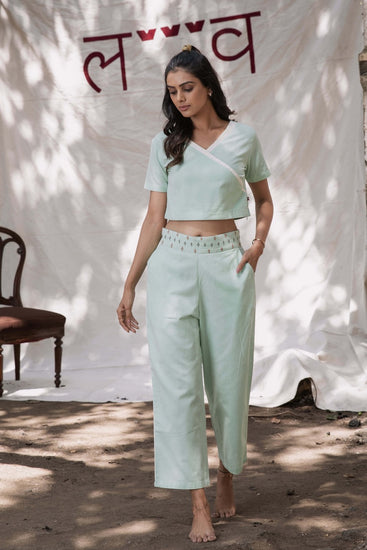 Mint Green coord set with embroidered waist in pants.Flaunt it with a pair of sneakers and you are good to go.