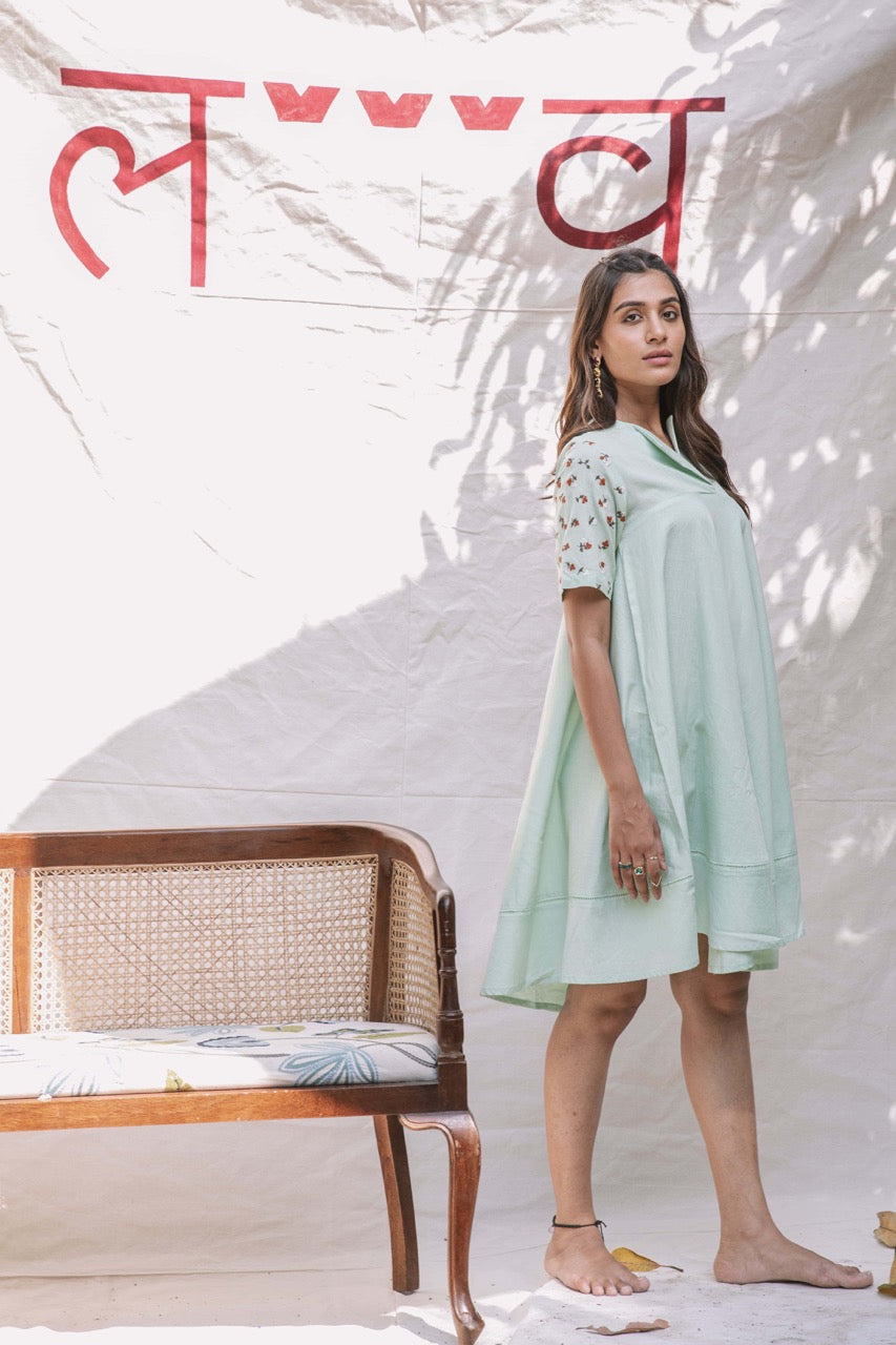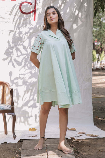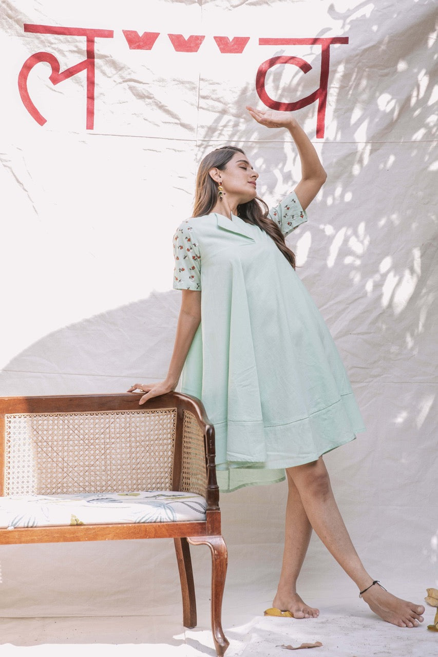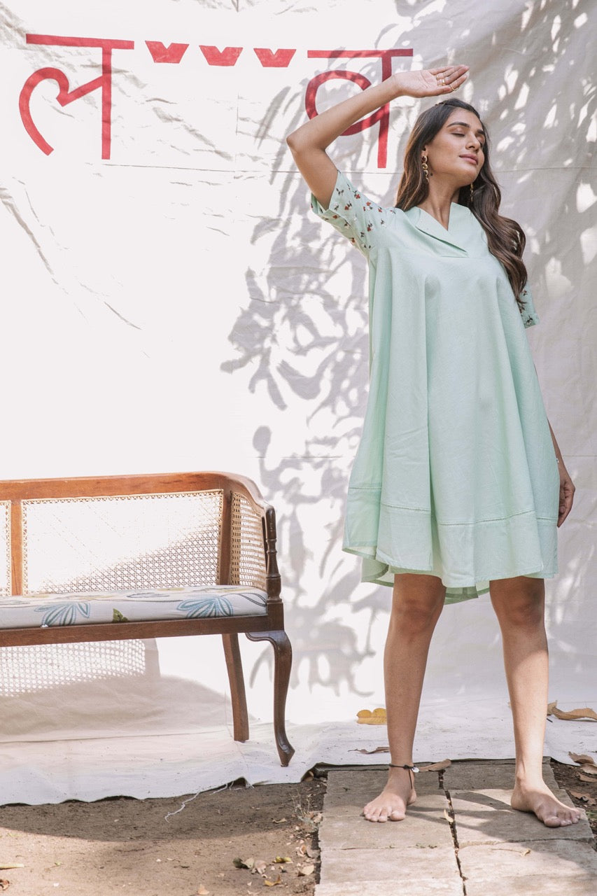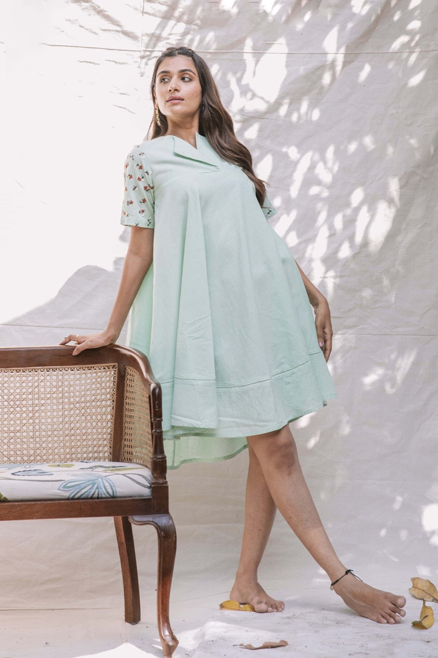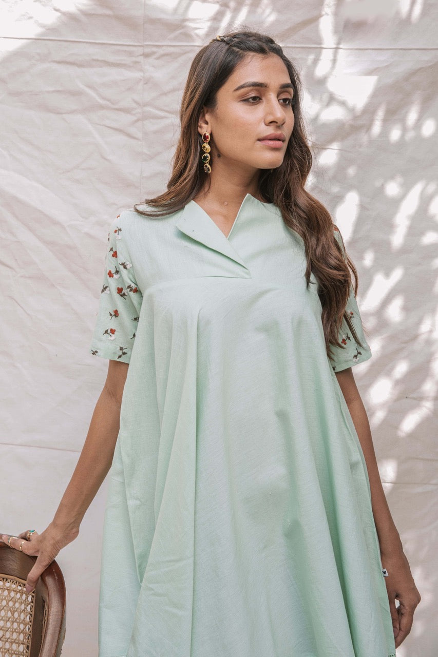 Mint green dress is surely a style to wear on your first date or brunch with friends.There is pretty floral detailling on sleeves.