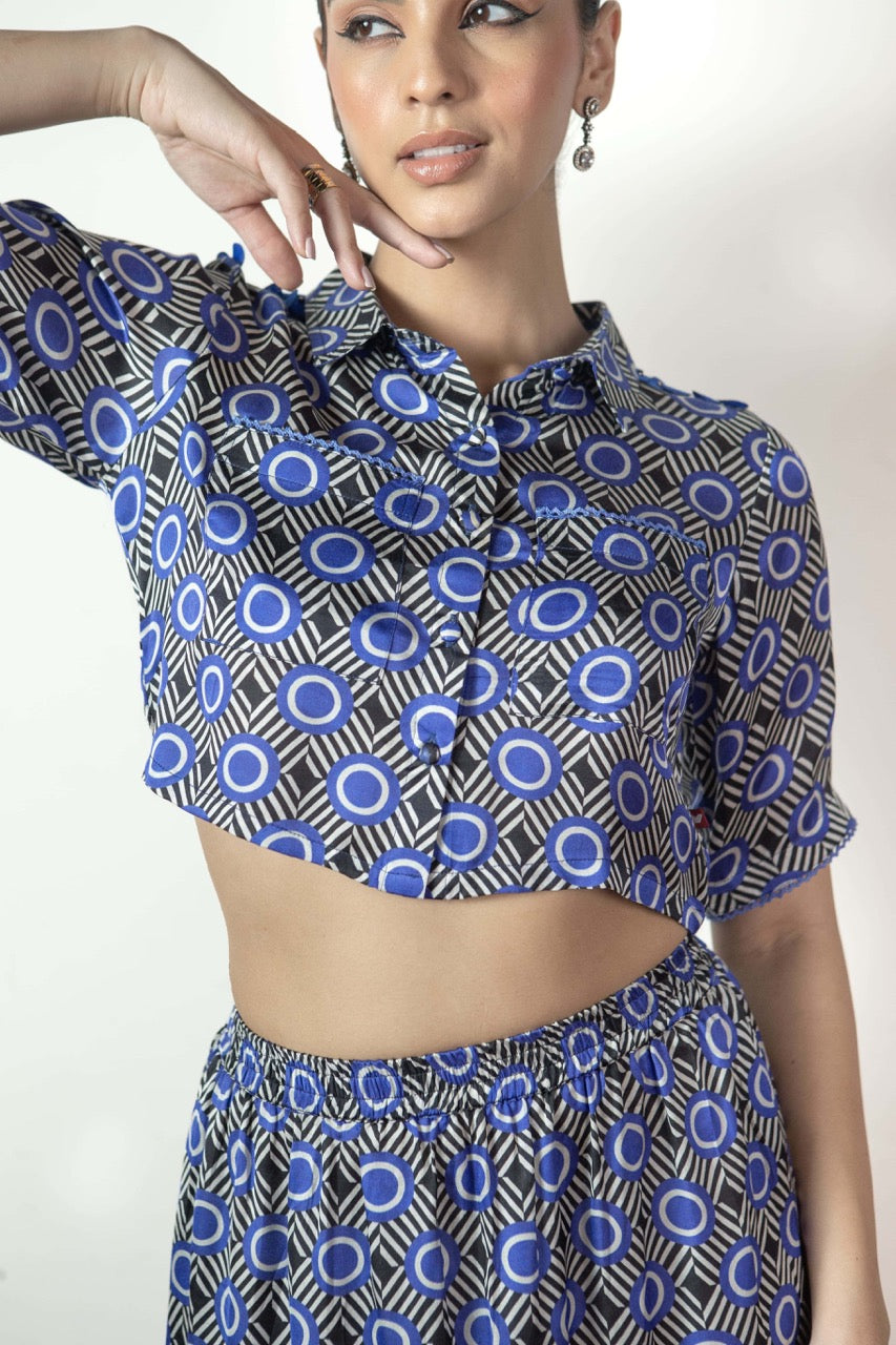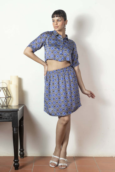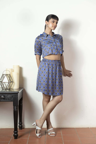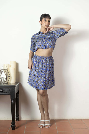 Heartfelt, a quirky print from the Love Letter collection, graces this versatile co-ord set. It includes a cropped shirt with elbow sleeves and a matching above-the-knee skirt, both individually styled in multiple ways for holidays or any occasion. This unique, cool, and comfortable ensemble adds a touch of quirkiness to your wardrobe.