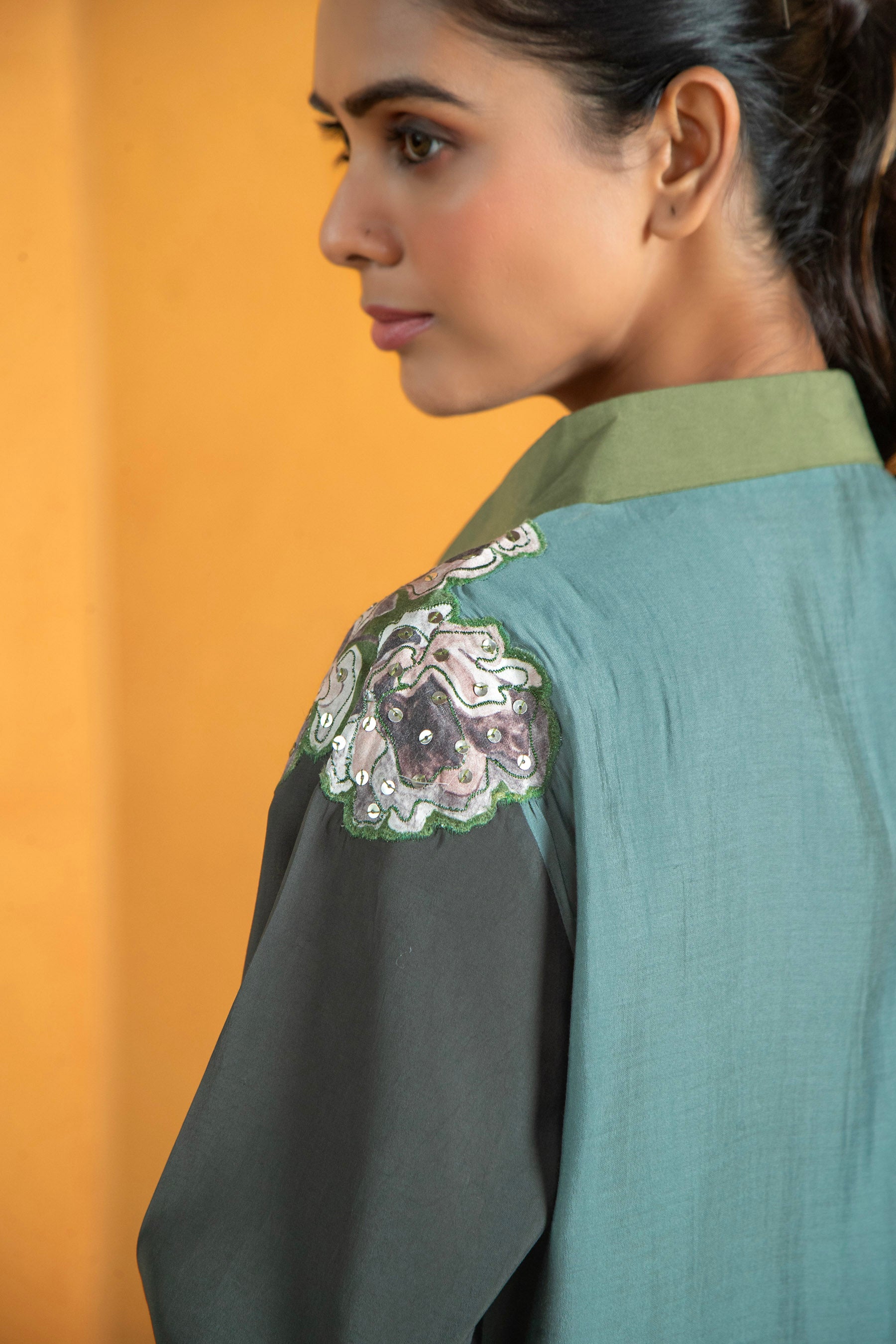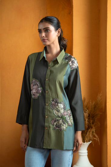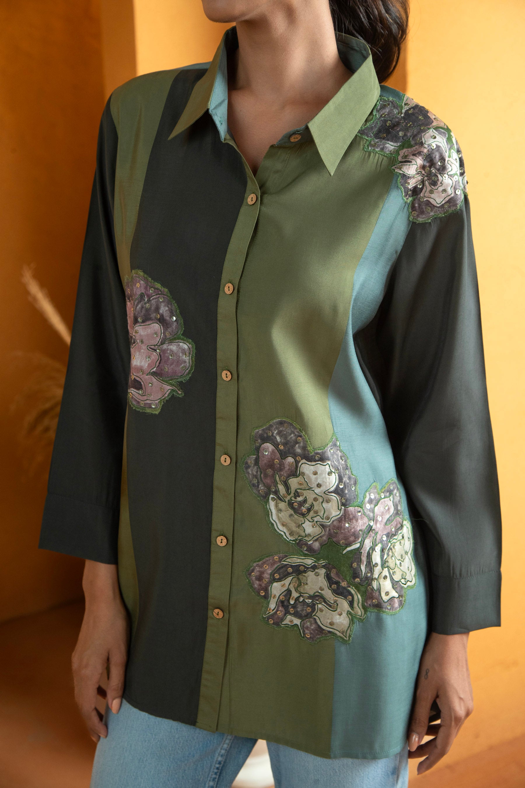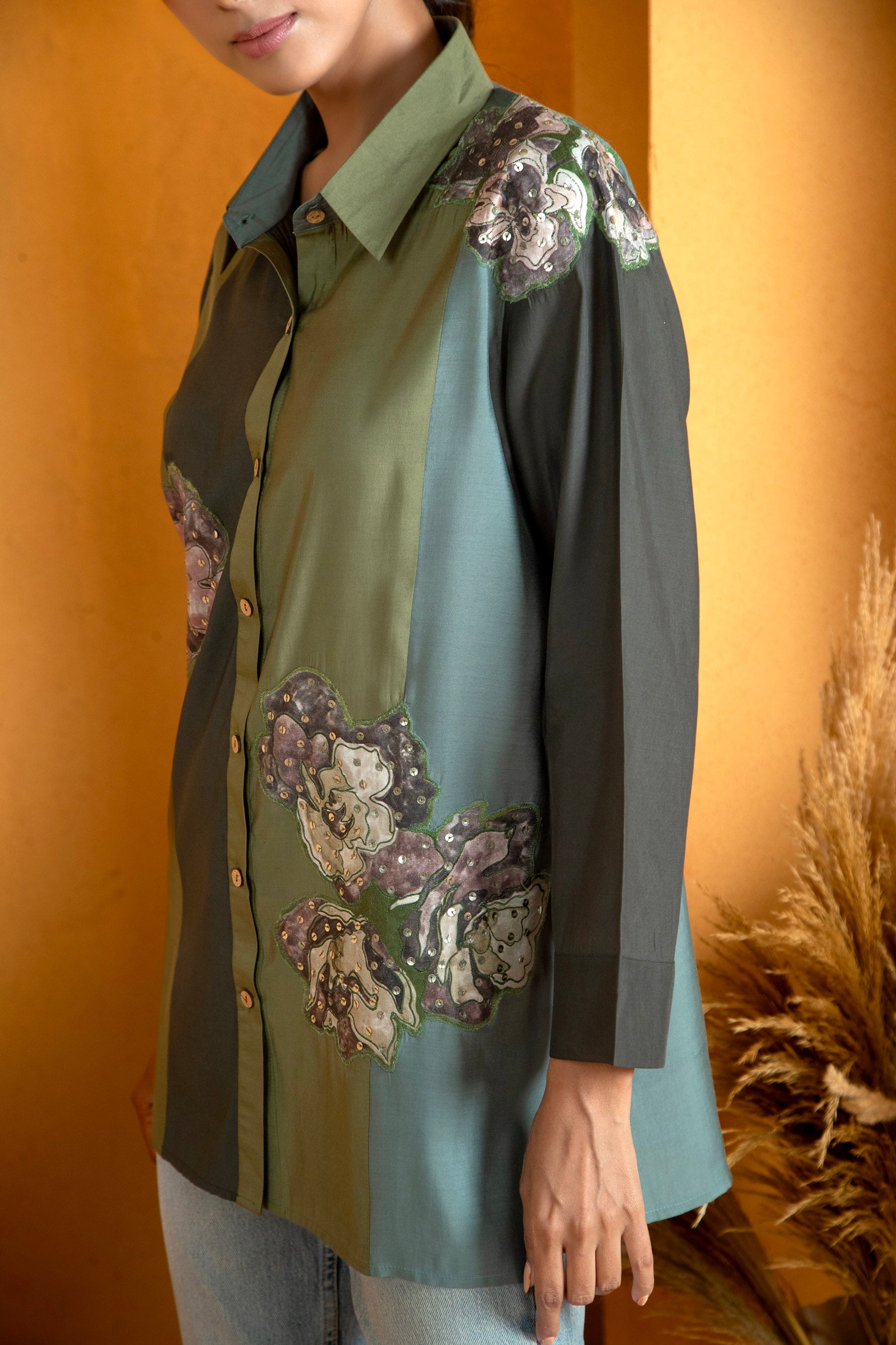 This multi panelled shirt literally brings joy once you wear it. The mix of colors, the printed patch with hand detailings, gives you a mood lift on an instant. Who doesn’t love colors?