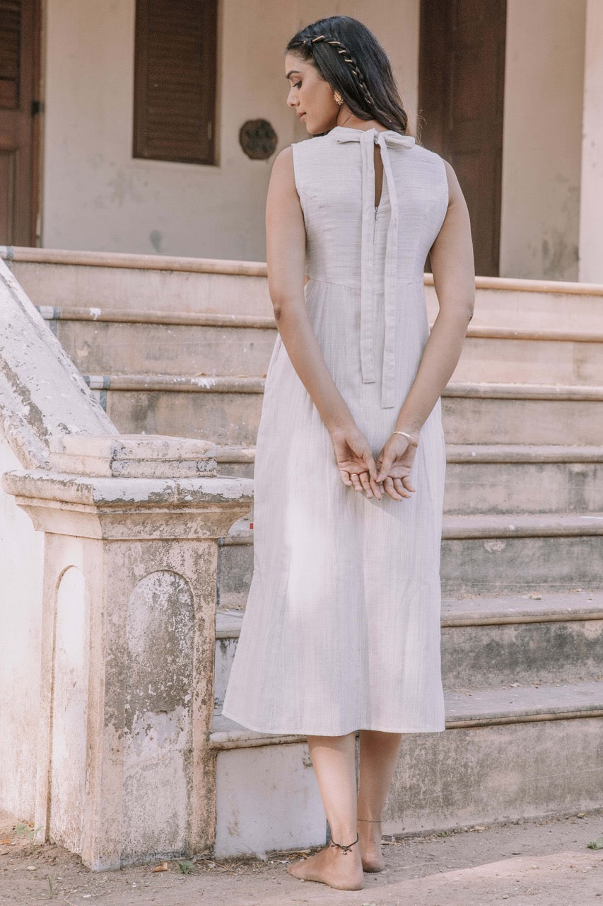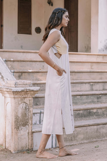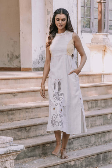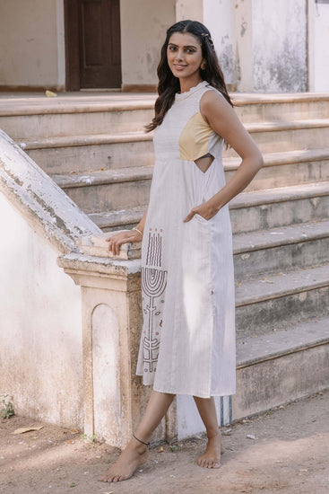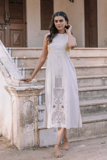 Introducing "Love's Embrace," a captivating sleeveless dress in natural cotton fabric. With a princess cut and contrasting color patch, it exudes charm. The dress features exquisite thread embroidery in the center, while its calf length adds a touch of elegance.