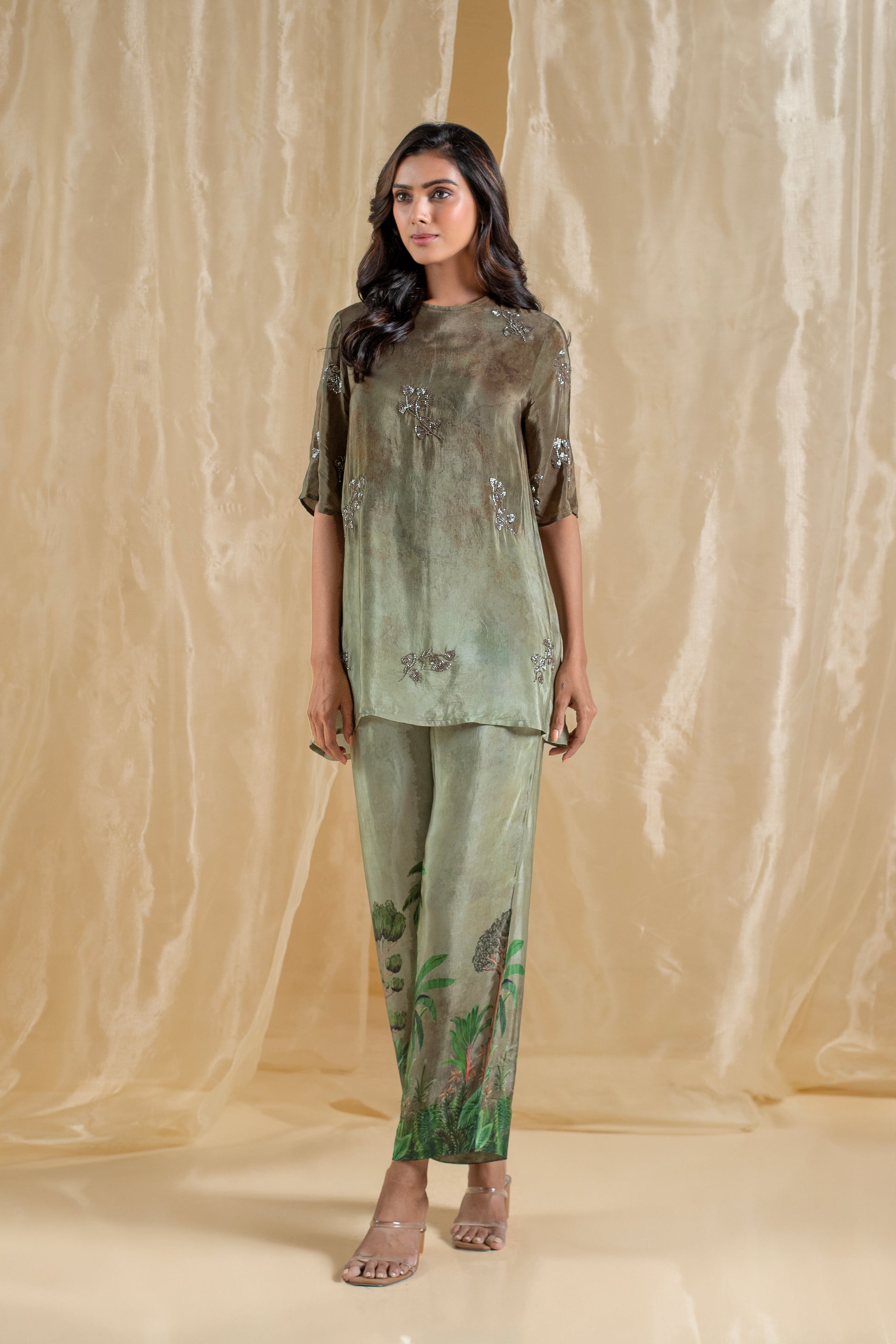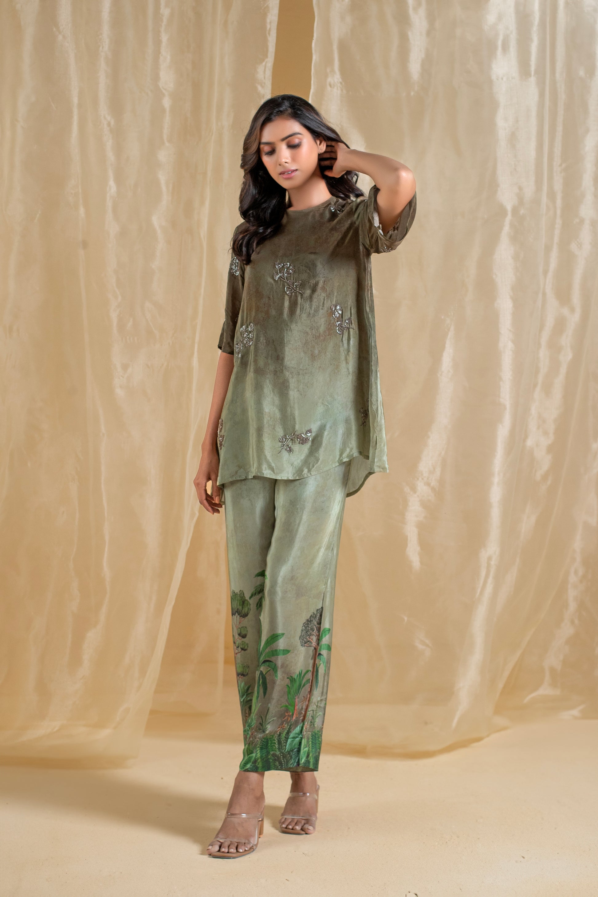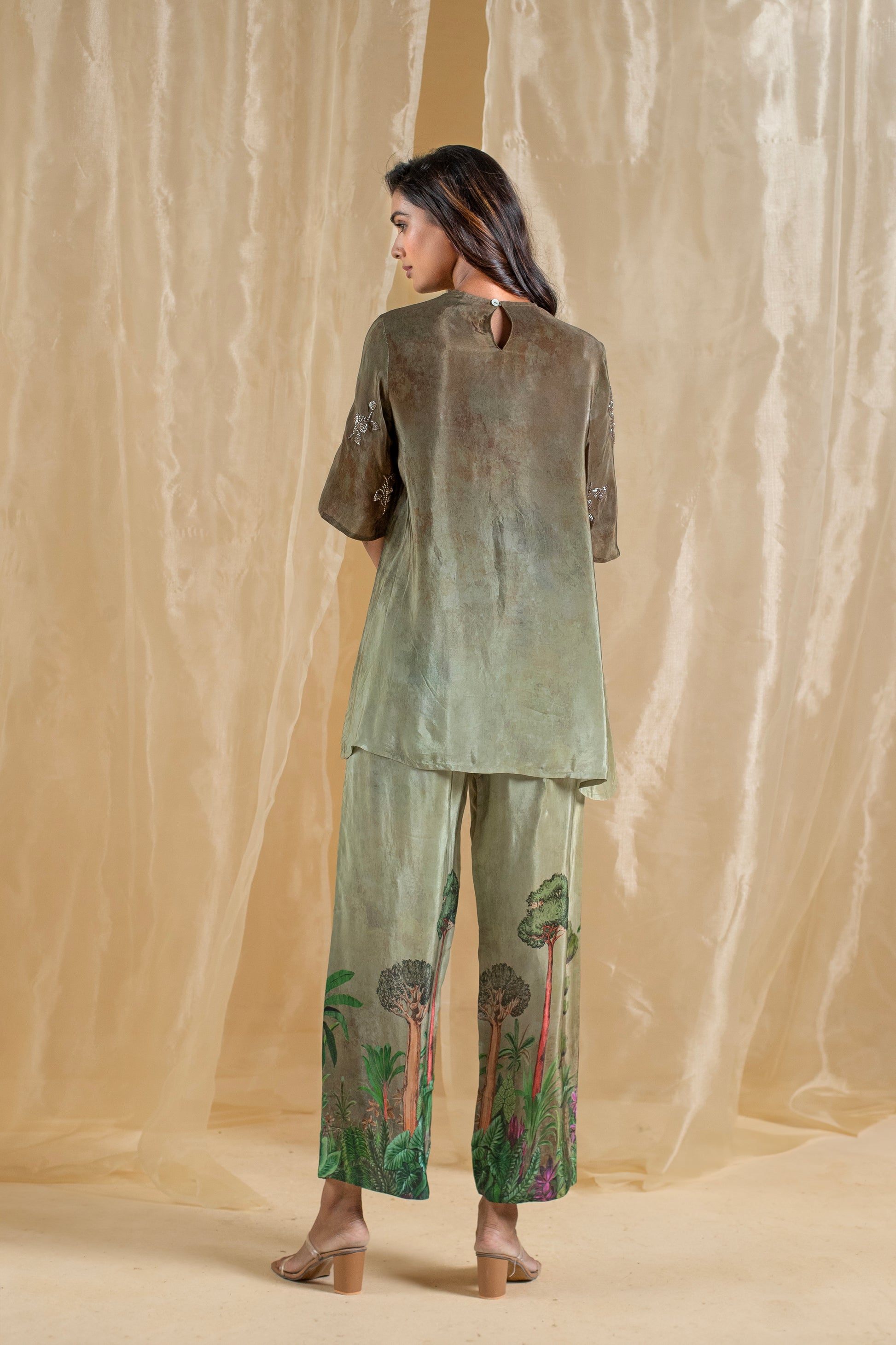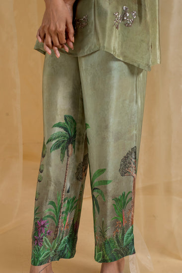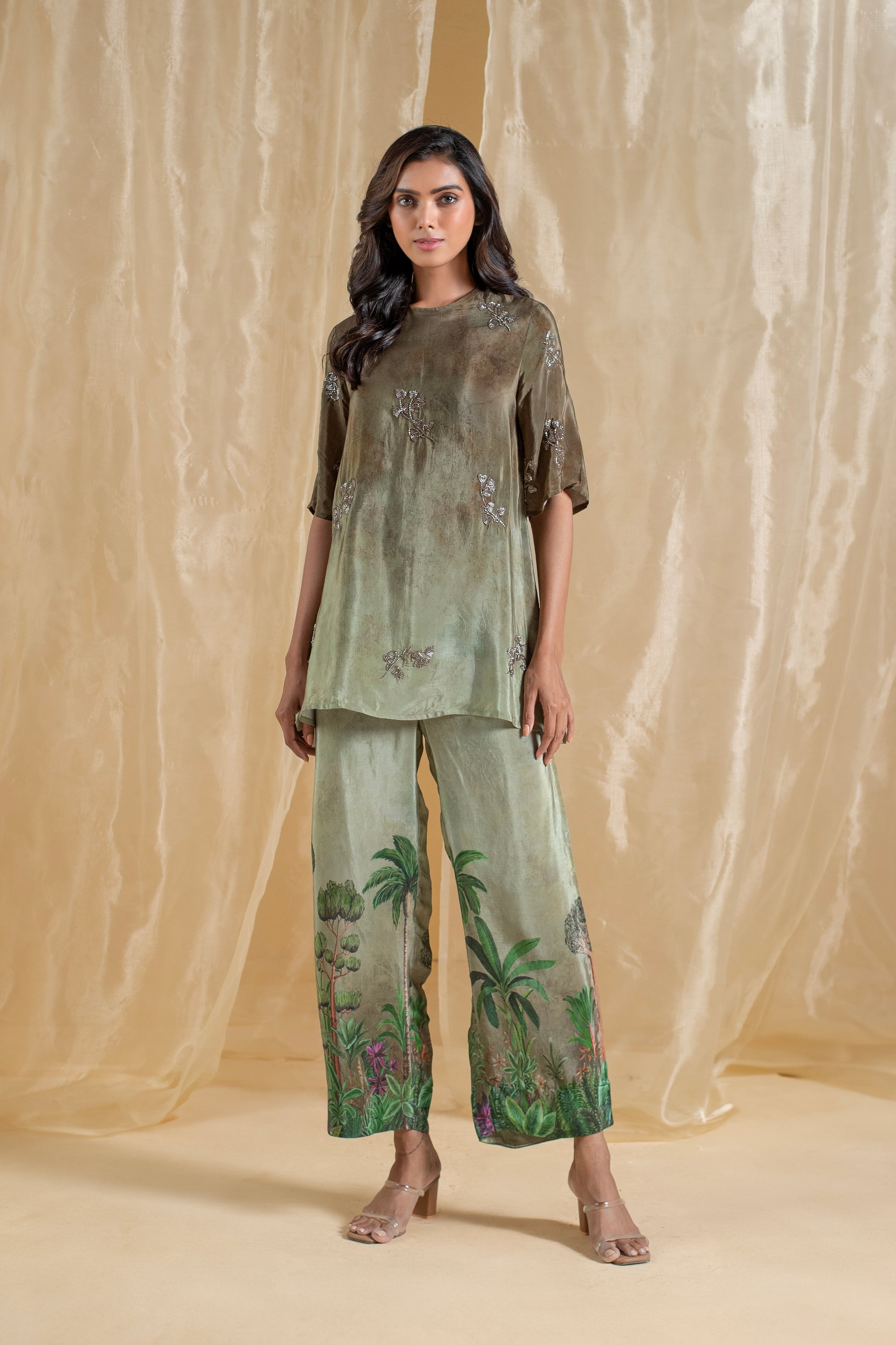 The pants, featuring a serene coconut grove print against a light green background, perfectly complement the ombre top. This combination offers a refined look that is ideal for both day and evening wear, making it a versatile choice for various occasions. The breathable crepe fabric enhances comfort while maintaining a sleek and polished appearance.