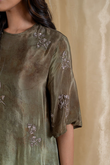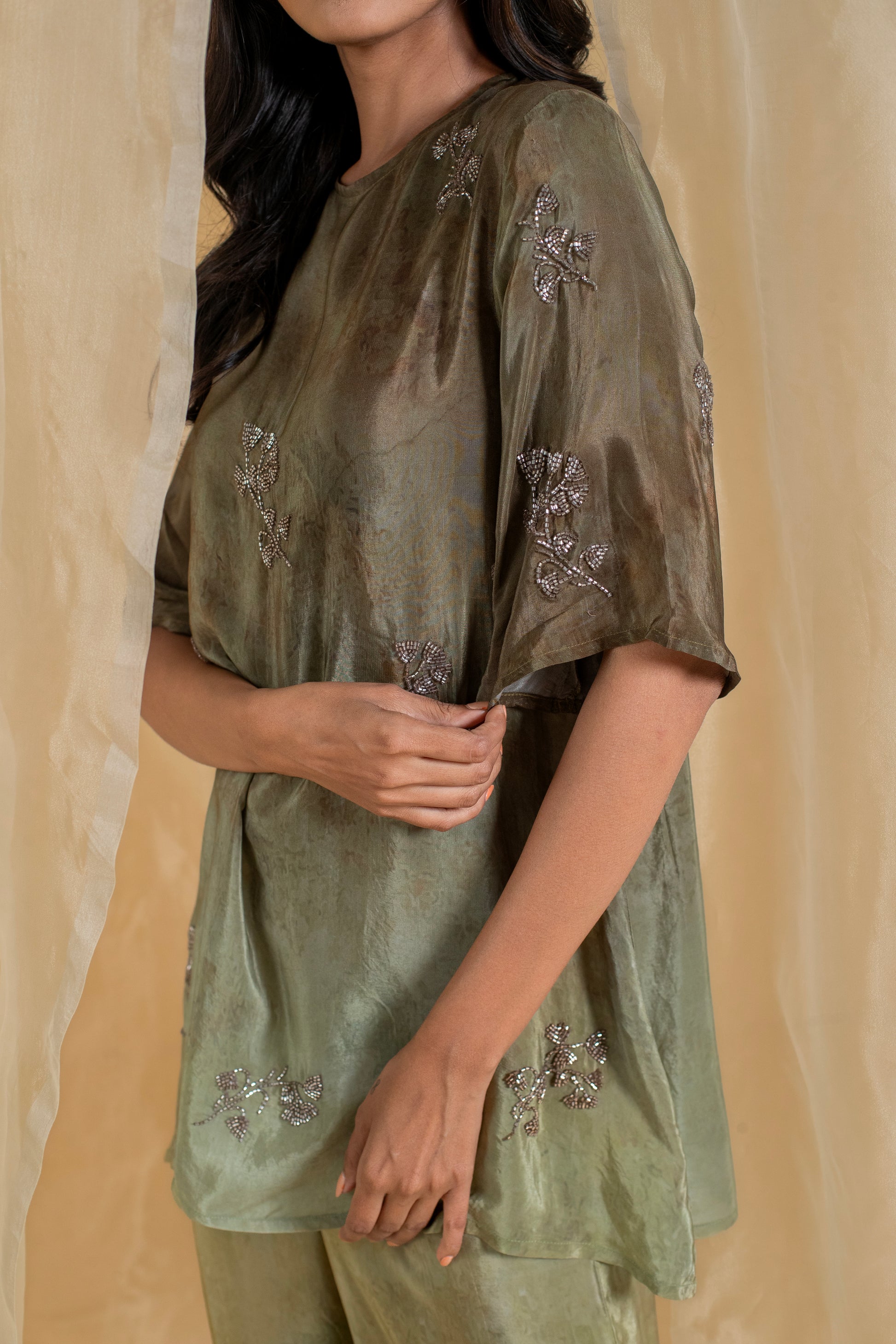 Our Lovescape Coconut Grove Co-Ord Set is a celebration of nature's elegance, designed with love and crafted to perfection. This set features a harmonious blend of light green and olive tones that transition beautifully from dark to light in an ombre effect on the top. The top is adorned with metallic dark gold beaded hand embroidery motifs, adding a subtle yet striking touch of sophistication. The high neckline and elbow-length sleeves create a flattering silhouette that complements all body types.