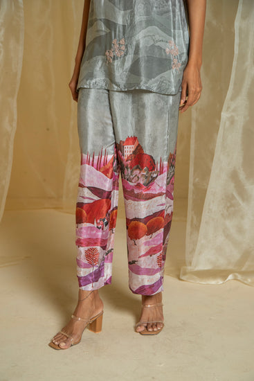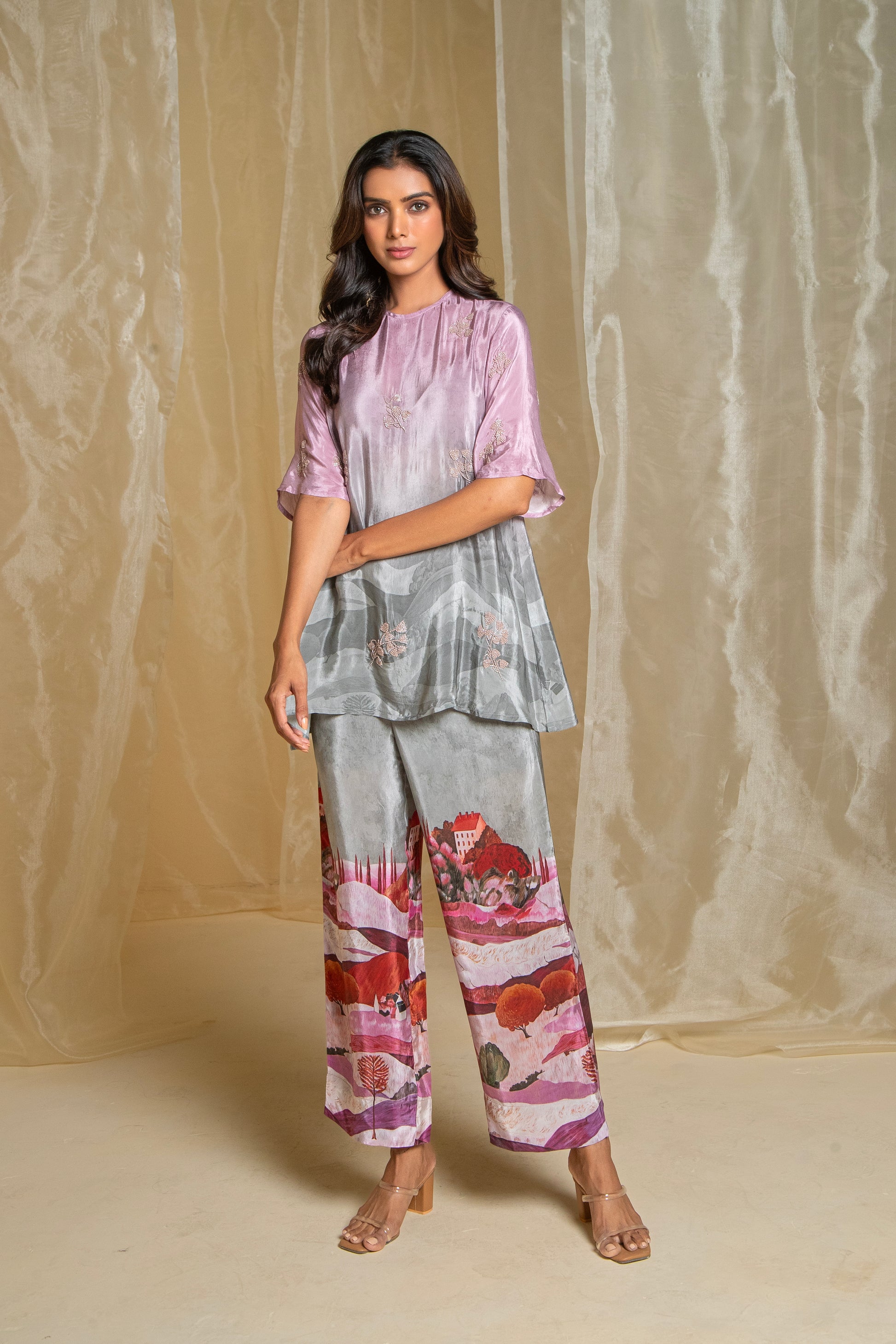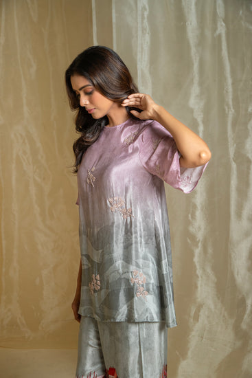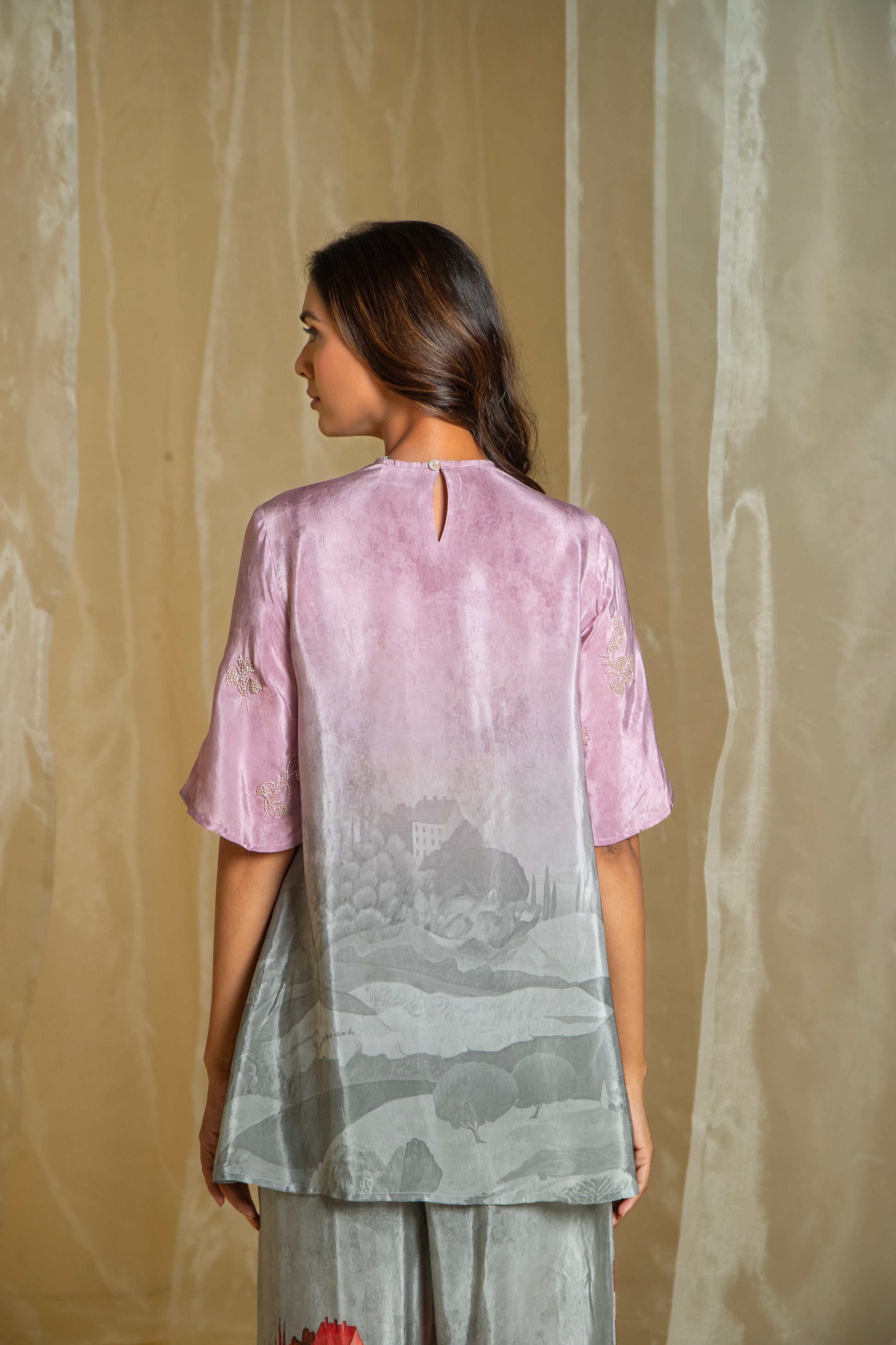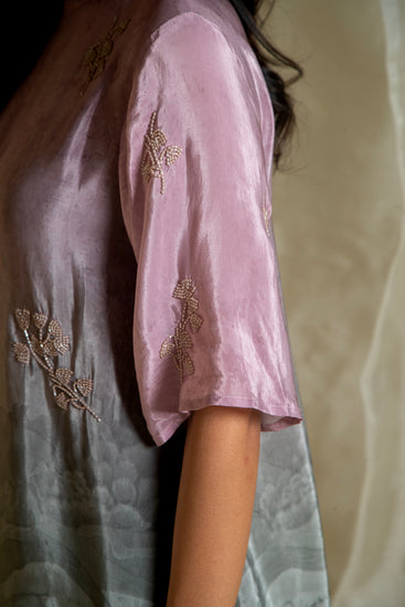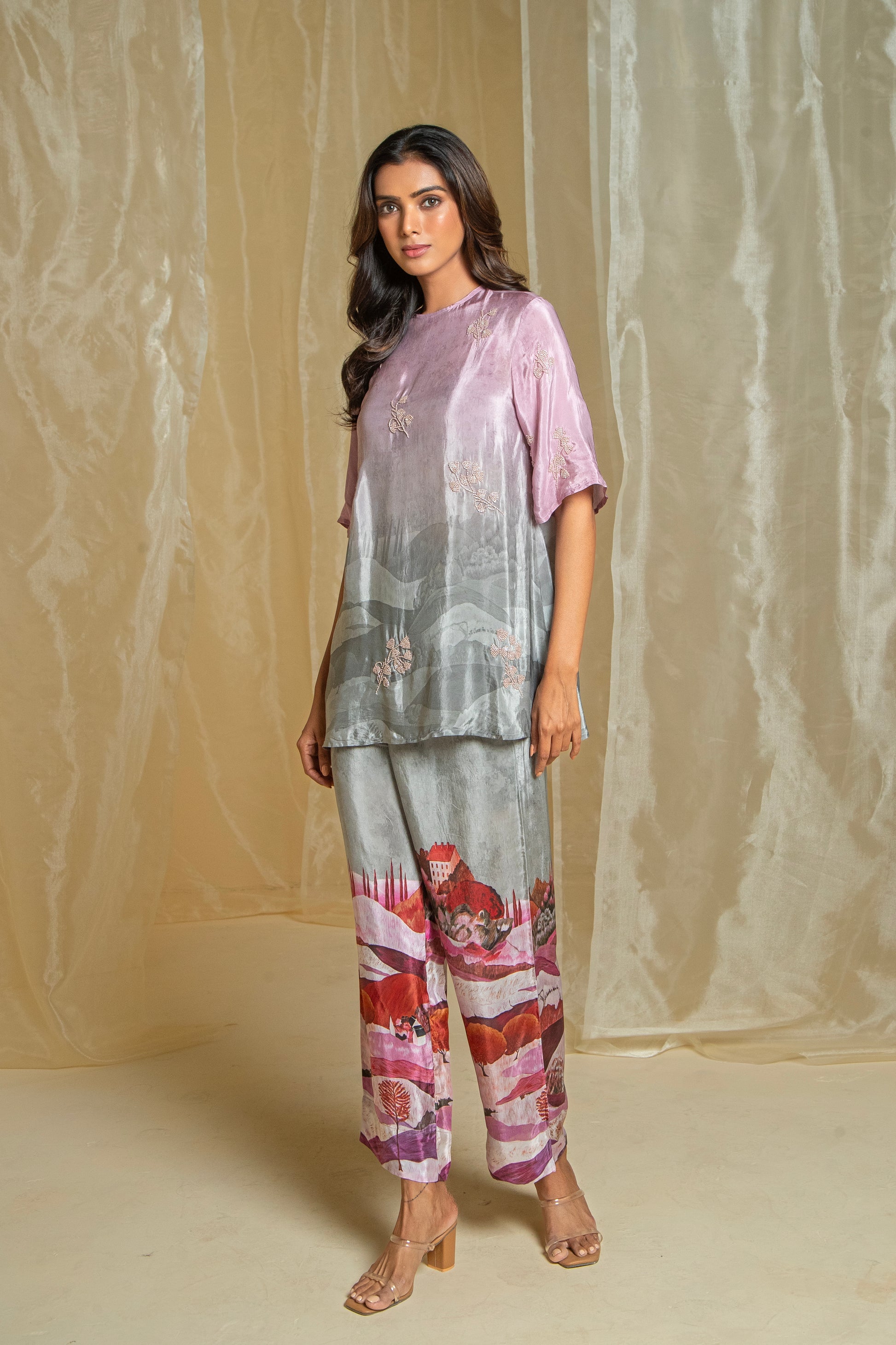 Crafted with love and attention to detail, our Lovescape Pink & Grey Ombre Co-Ord Set is a versatile piece that effortlessly combines elegance with artistic flair. The top features a stunning ombre effect, transitioning from pink to grey, with subtle negative prints that add depth and dimension. The high neckline and elbow-length sleeves create a flattering silhouette that suits all body types, while the beaded hand embroidery motifs add a touch of shine without overpowering the design. The pants, with their unique mountain print in a harmonious pink and grey combination, perfectly complement the top. Together, they create a sophisticated look that’s ideal for evening wear or any special occasion. Each element of this set is designed to celebrate the beauty of nature and the art of subtlety, making it a piece you’ll reach for again and again. Made with love, this co-ord set is a true testament to the art of fashion.