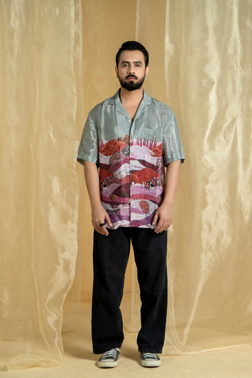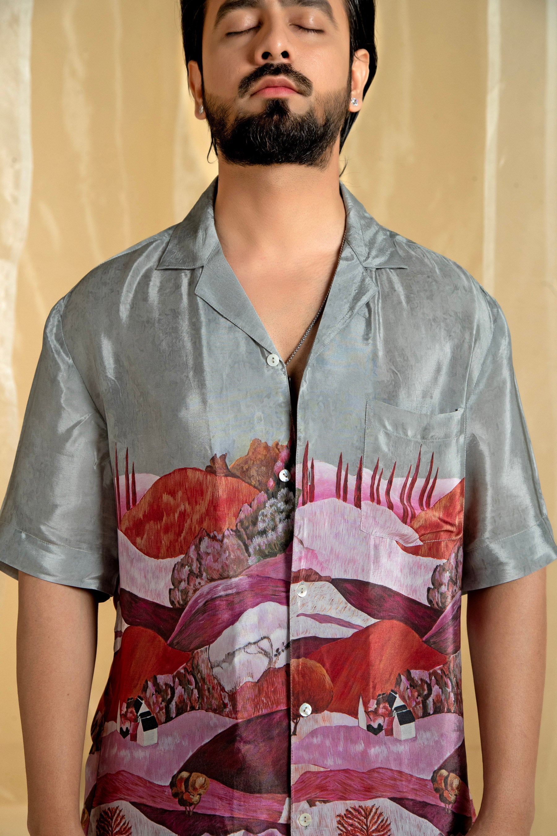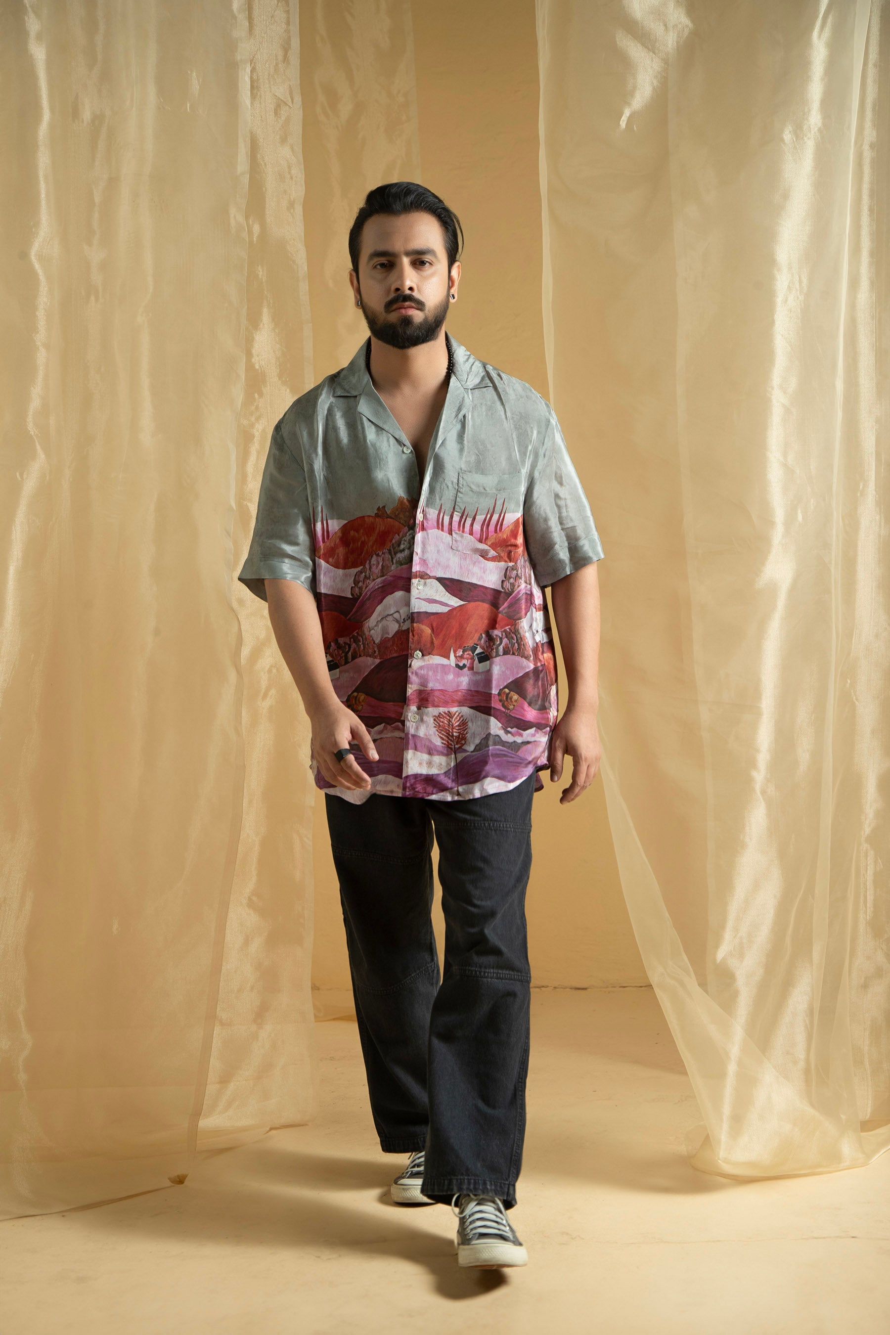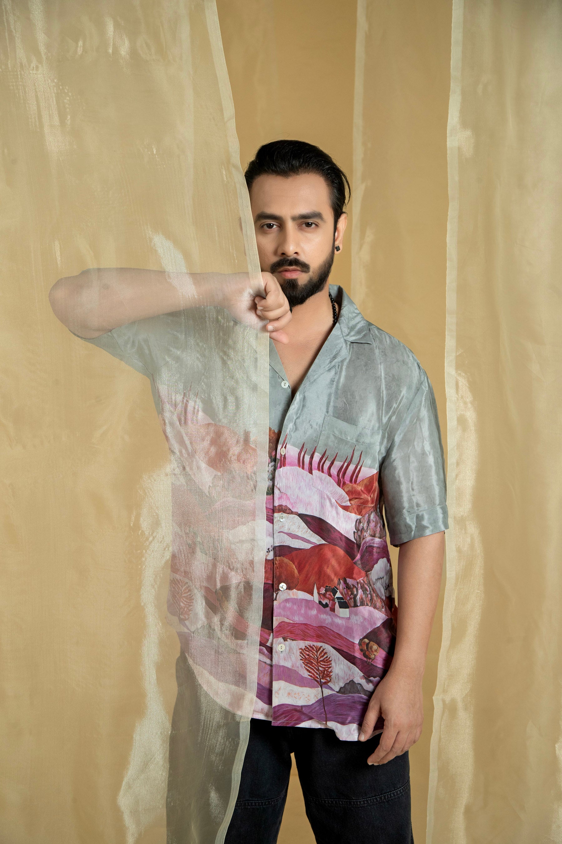 Elevate your wardrobe with our Lovescape Mountain Print Men's Shirt. Featuring a striking mountain print in shades of blue and green, this shirt captures the essence of natural beauty. The design showcases a layered, textured pattern with intricate details that add a touch of sophistication.