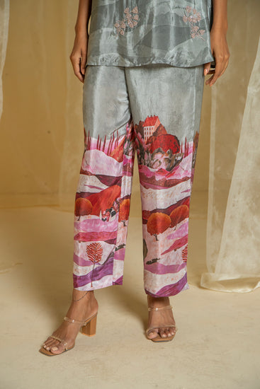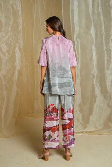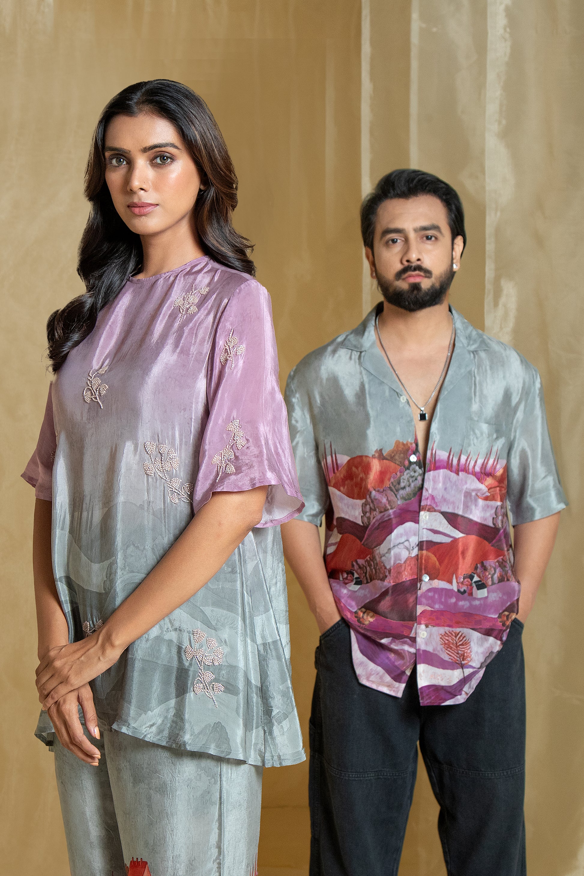 For women, the Lovescape Pink & Grey Ombre Co-Ord Set features a mesmerizing transition from pink to grey, creating an ombre effect that’s both elegant and eye-catching. The top, with its high neckline and elbow-length sleeves, offers a flattering silhouette for all body types. Delicate beaded hand embroidery adds a touch of sparkle, while the unique negative prints bring depth and dimension. Paired with pants that showcase a harmonious mountain print in pink and grey, this set is perfect for evening wear or any special occasion.