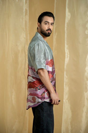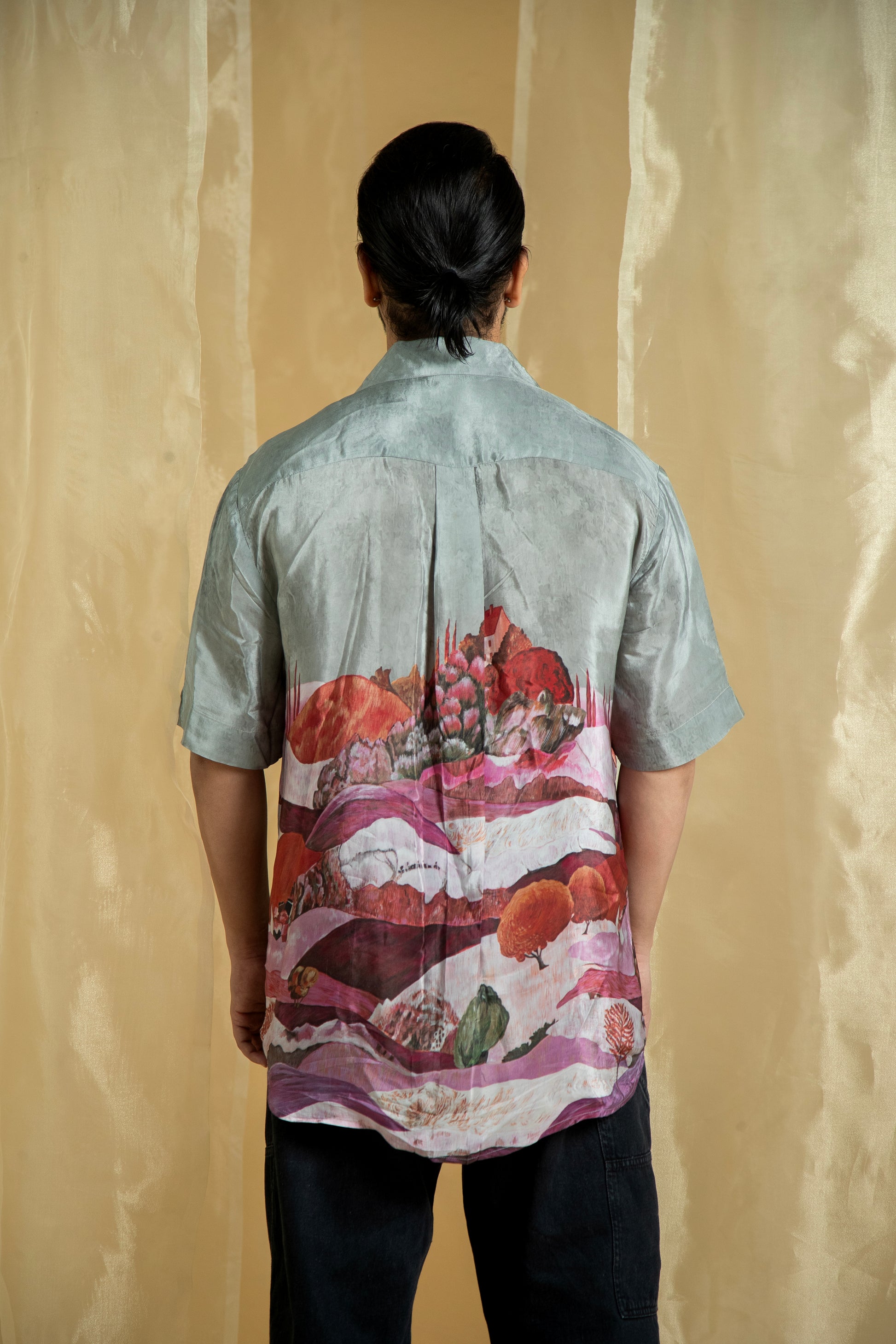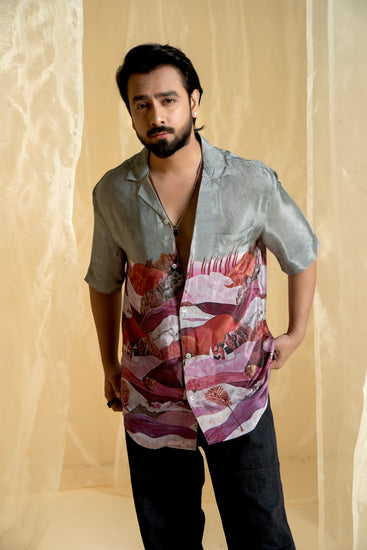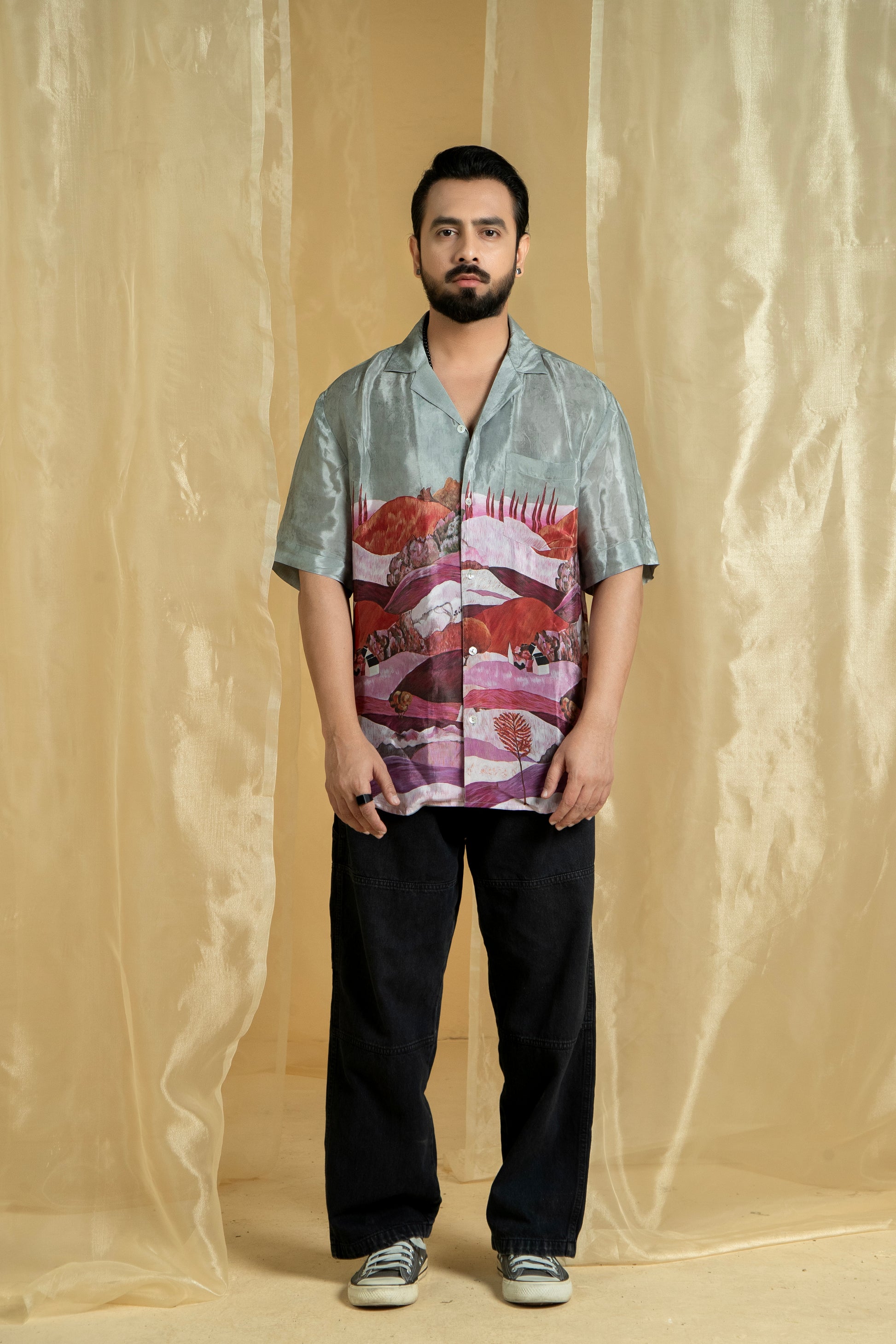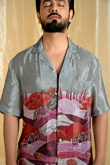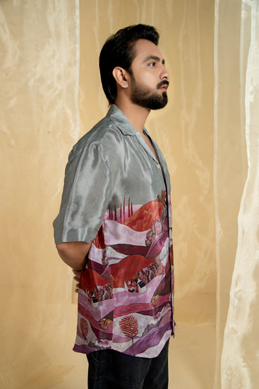 For men, the Lovescape Pink & Grey Mountain Print Shirt offers a sophisticated take on nature-inspired elegance. The distinctive mountain print in matching pink and grey tones adds a refined touch to your wardrobe. Made from pure natural crepe, this lightweight and breathable shirt is designed for both comfort and style, making it ideal for casual and semi-formal settings alike.