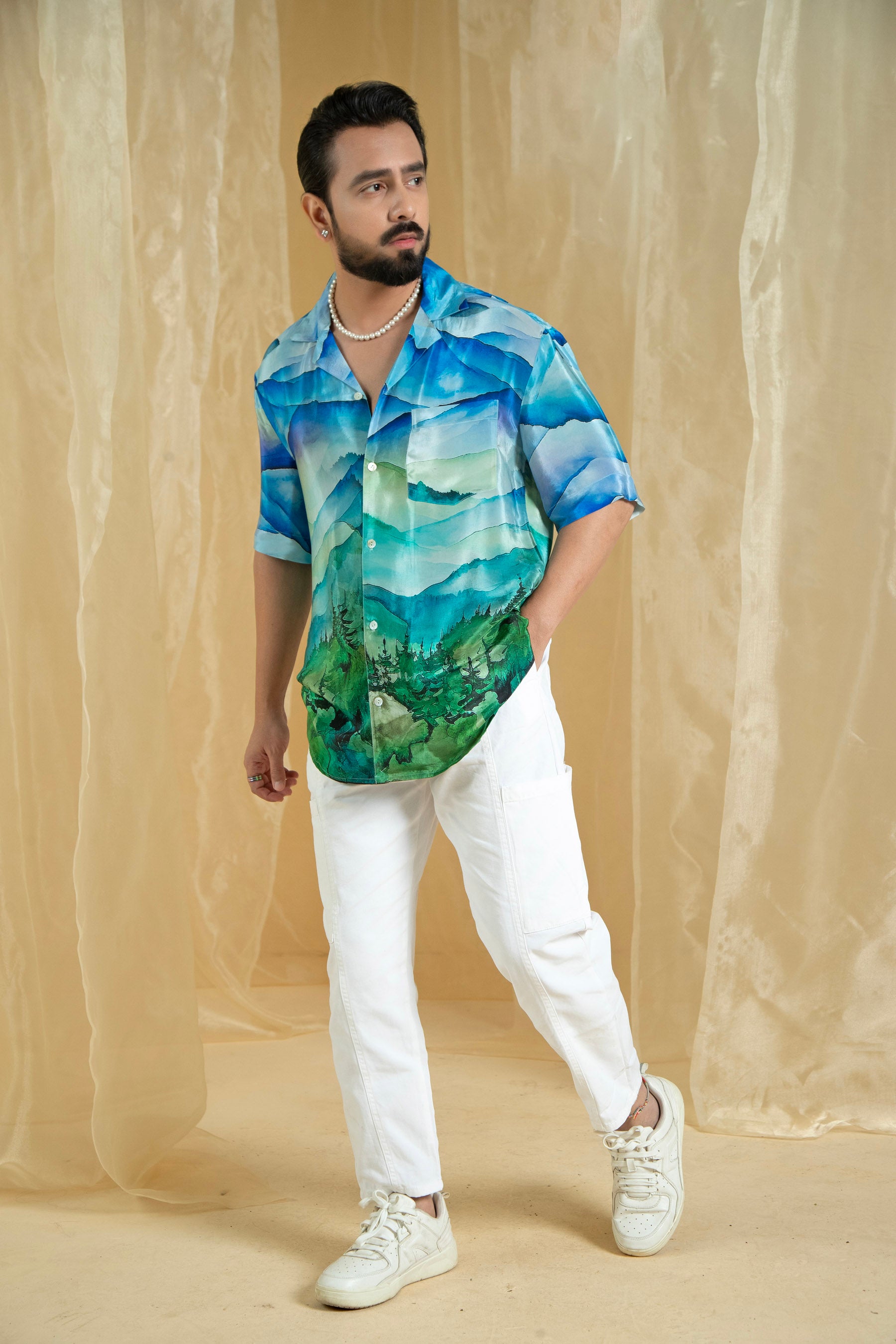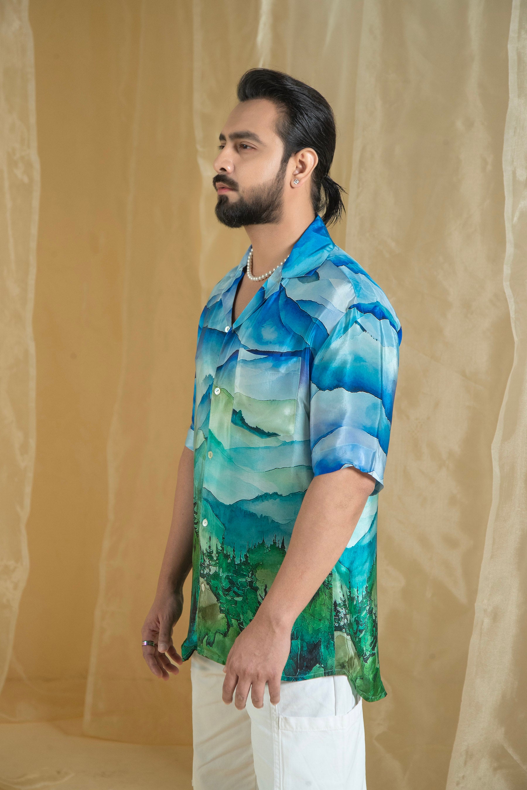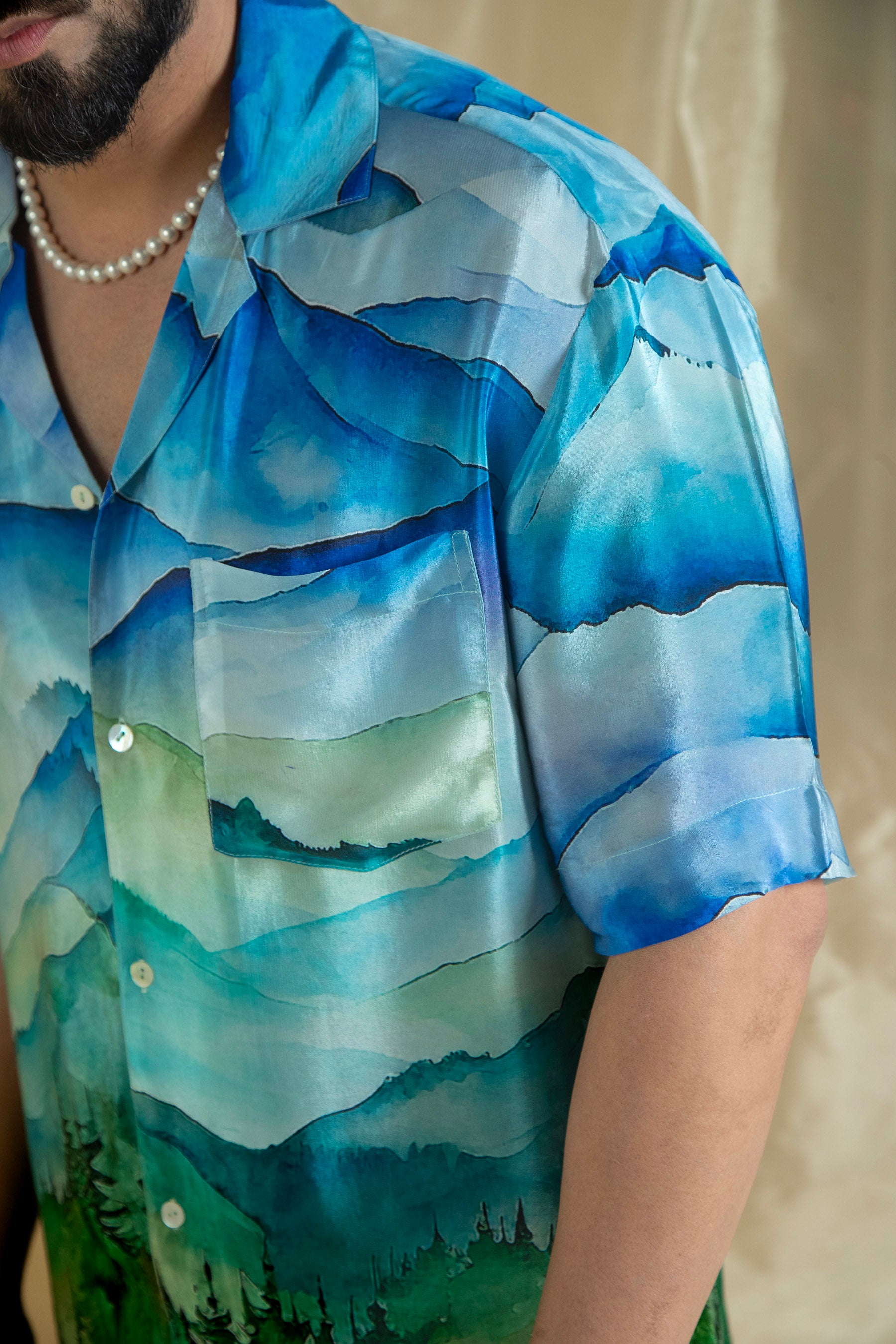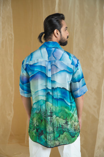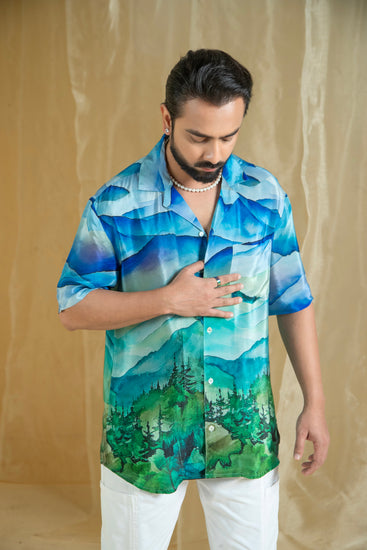Elevate your wardrobe with our Lovescape Mountain Print Men's Shirt. Featuring a striking mountain print in shades of blue and green, this shirt captures the essence of natural beauty. The design showcases a layered, textured pattern with intricate details that add a touch of sophistication.