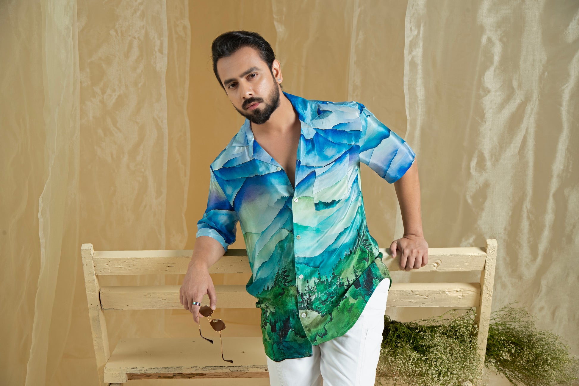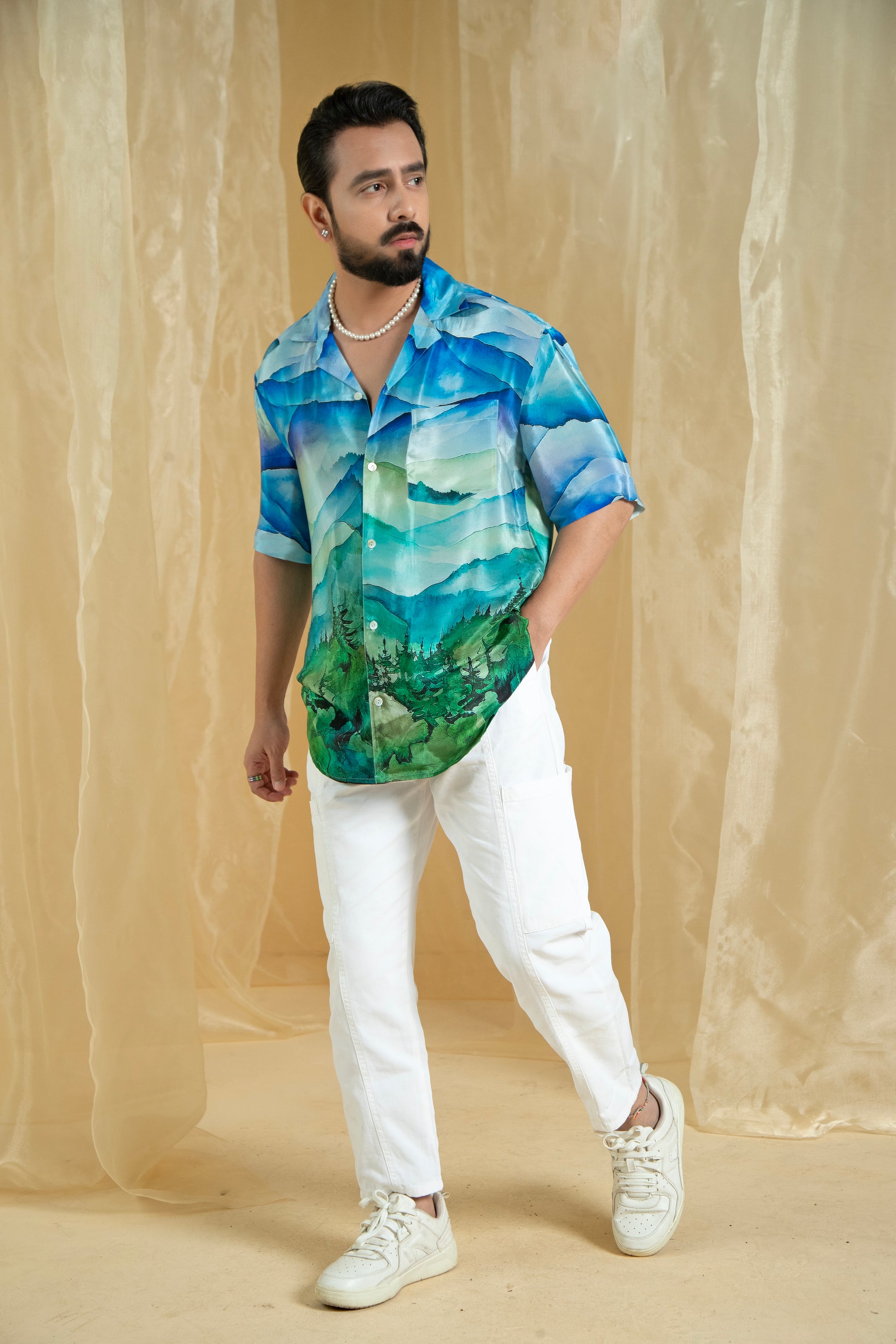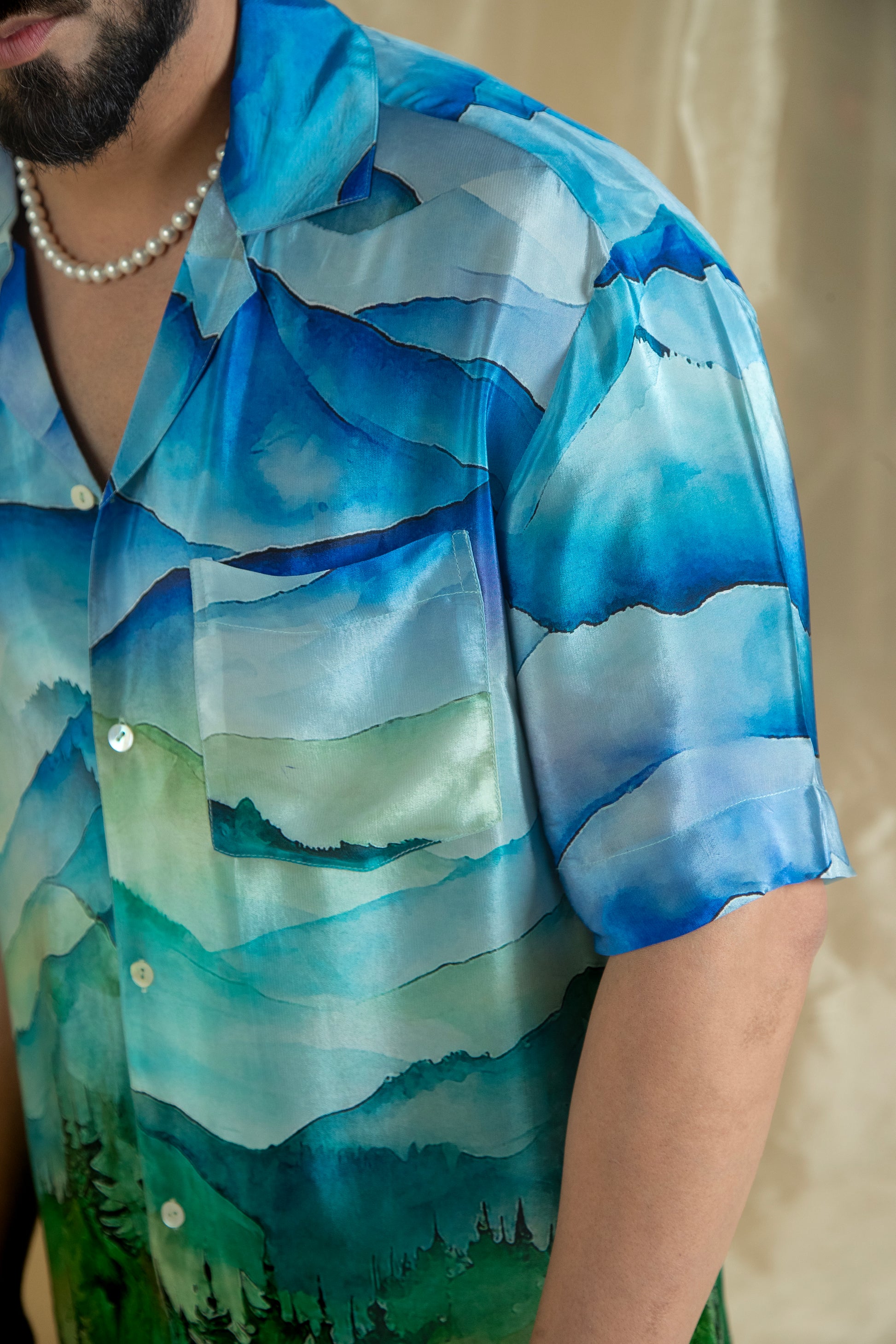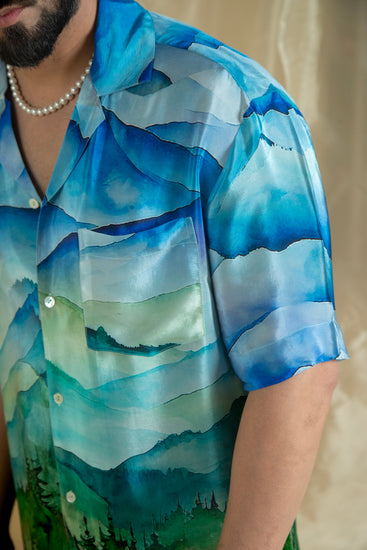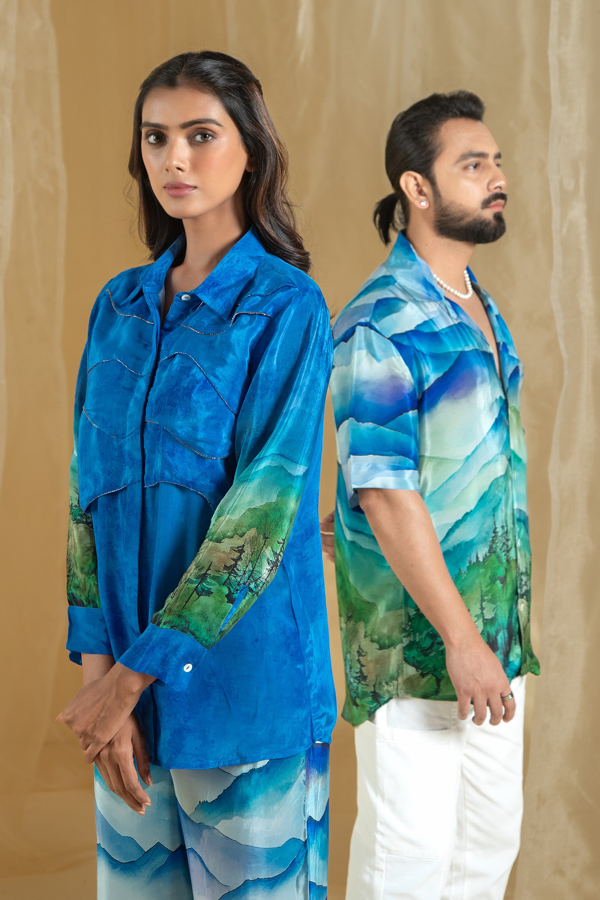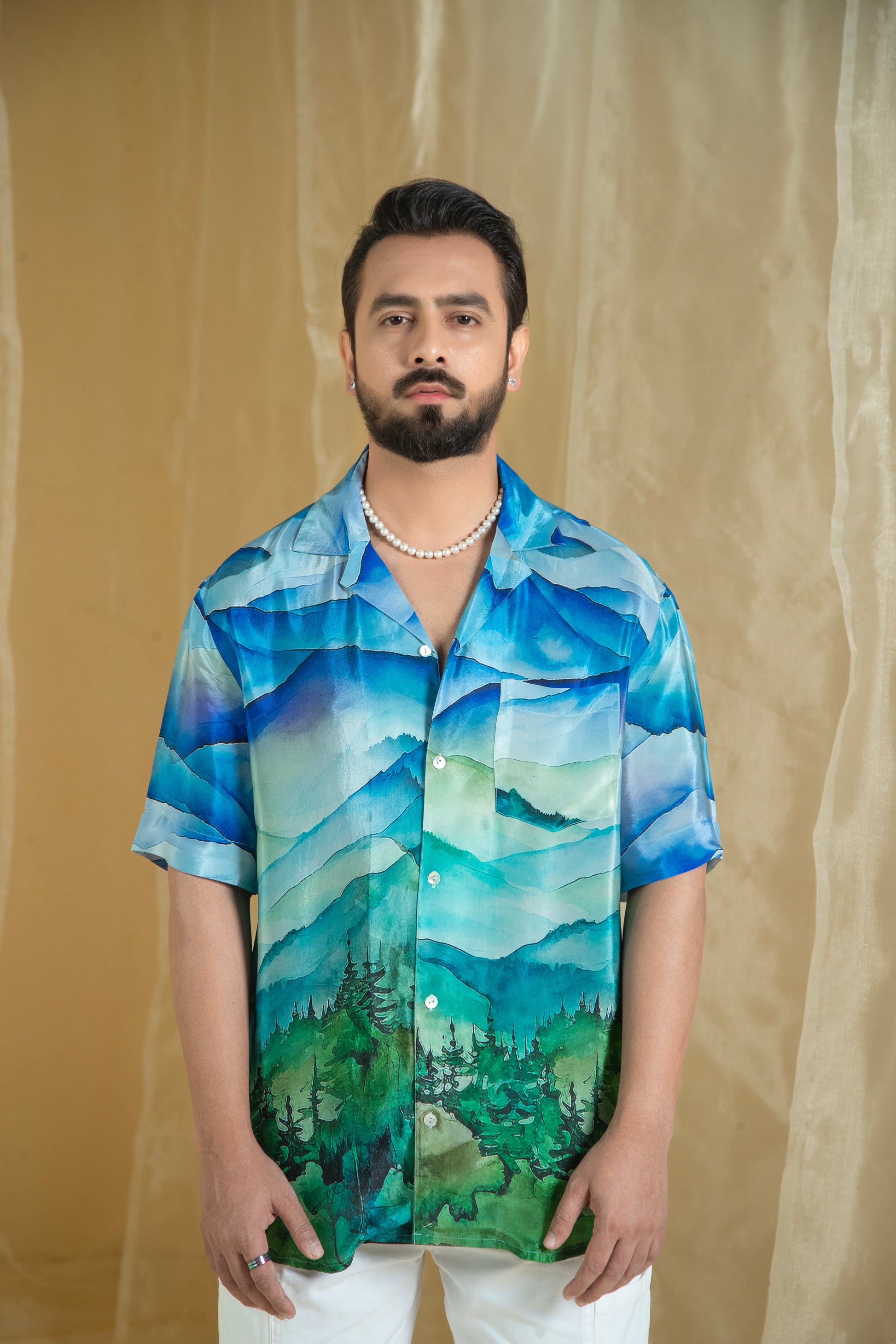 For men, the Lovescape Mountain Print Shirt is a masterpiece in shades of blue and green, capturing the essence of natural beauty through its layered, textured pattern. Crafted from pure crepe, this shirt offers both comfort and sophistication, making it perfect for special events or elevating your everyday wardrobe.