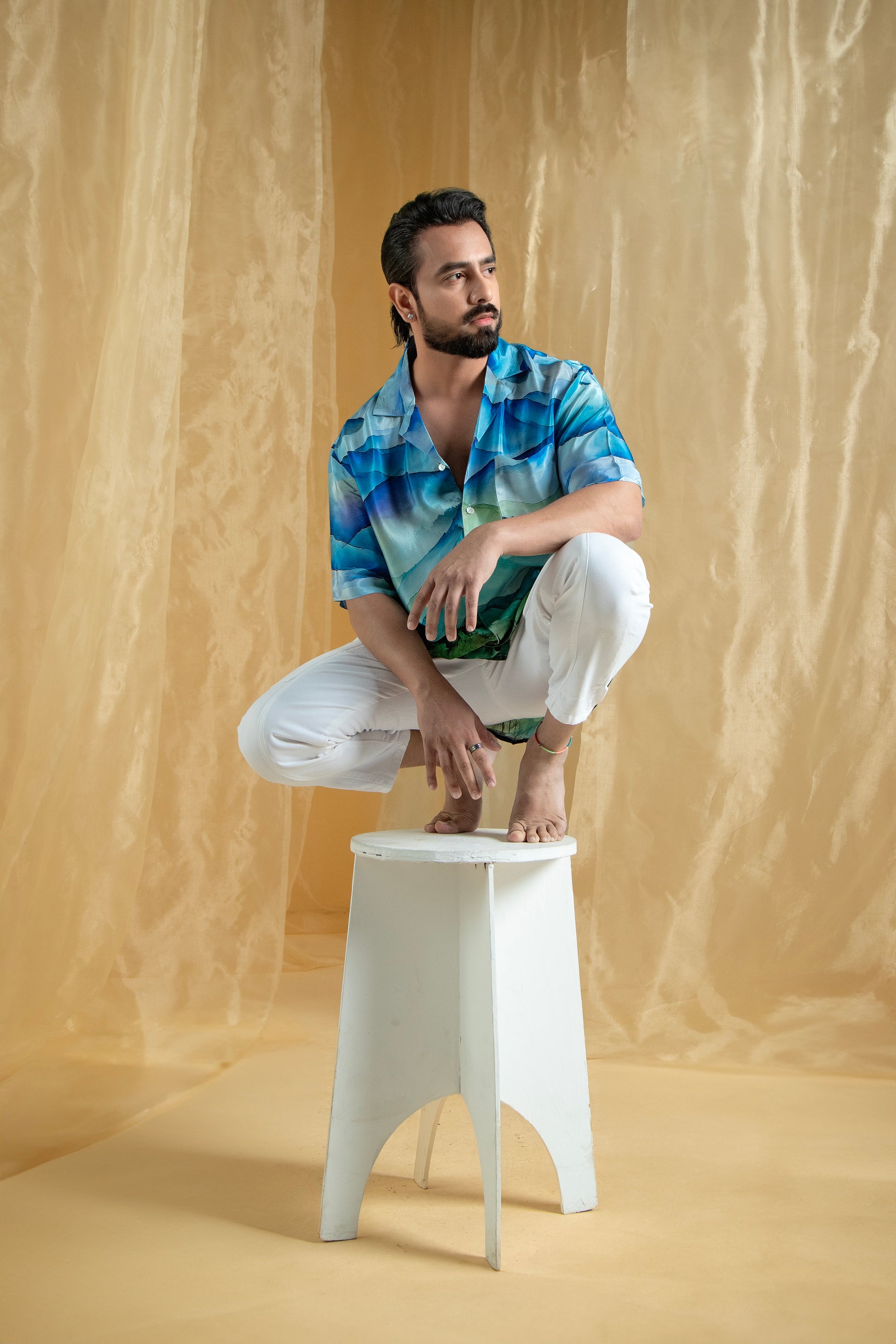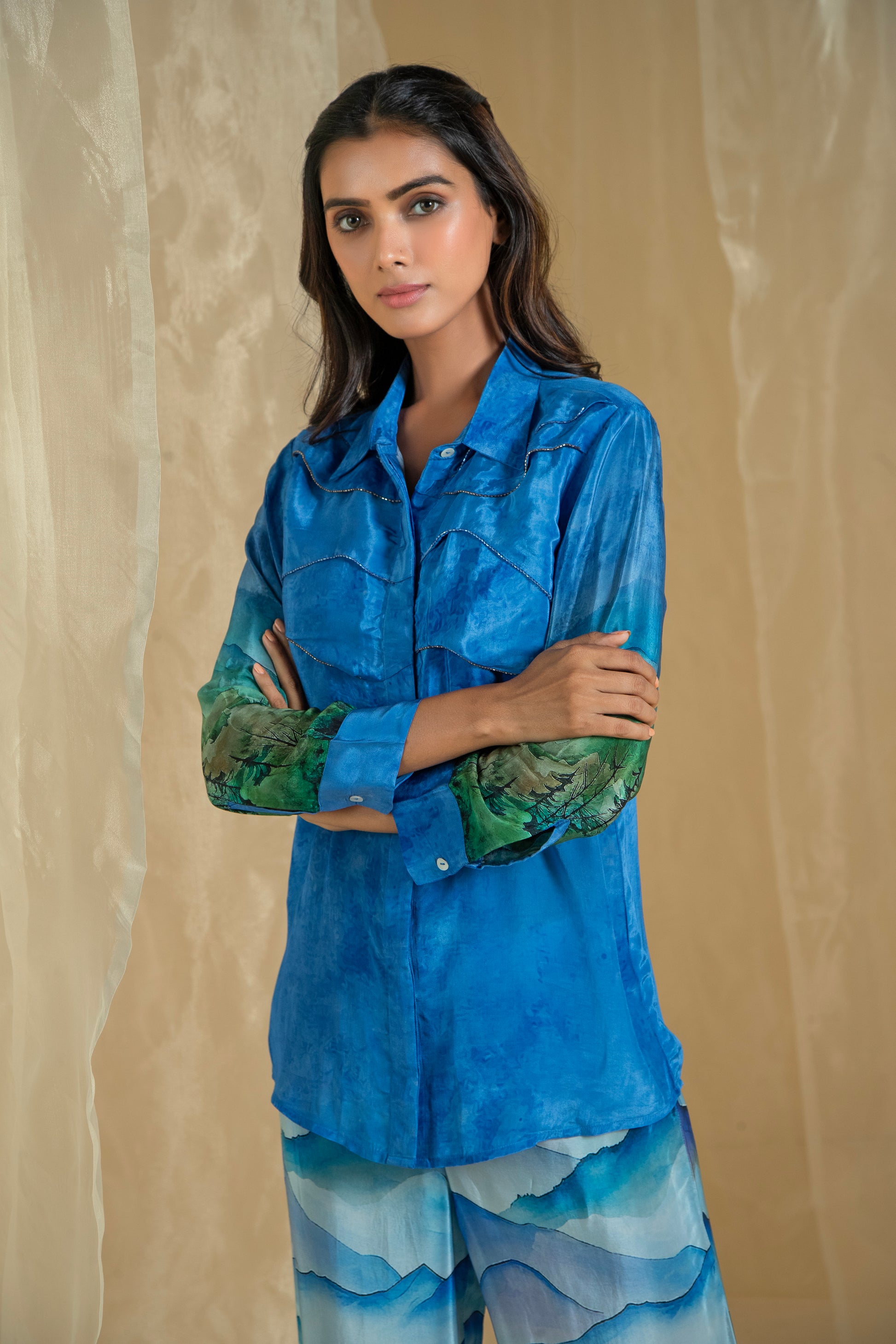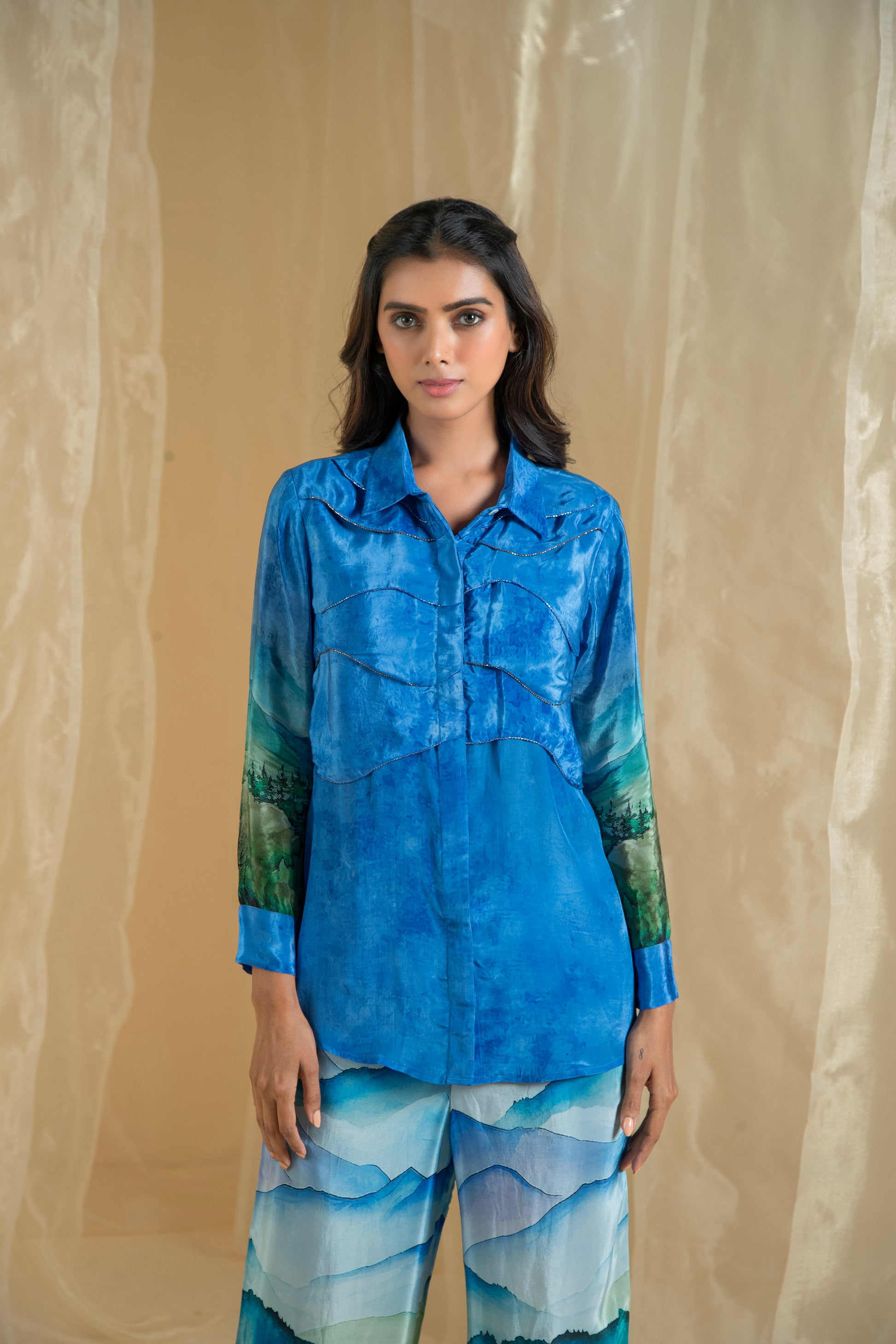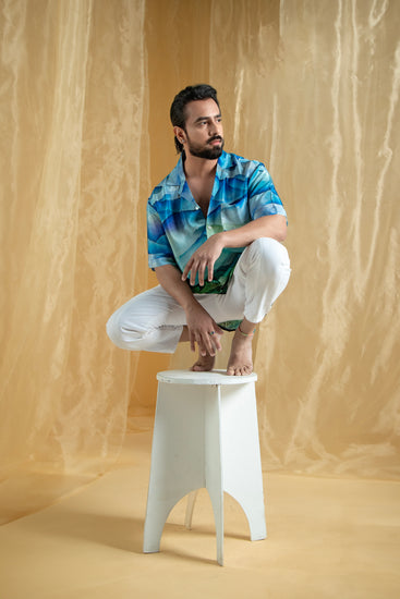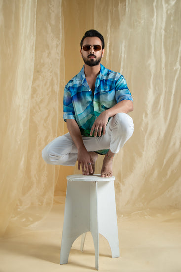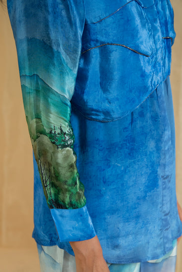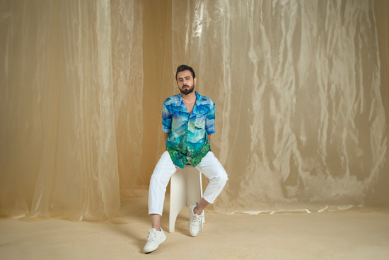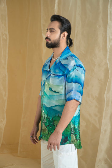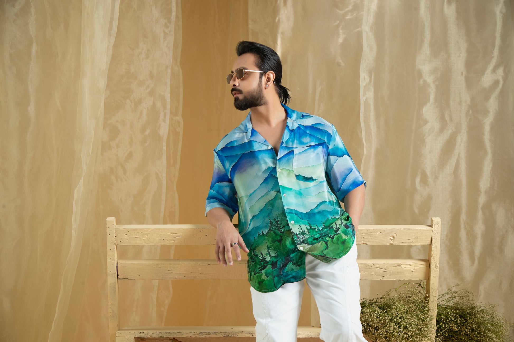 For men, the Lovescape Mountain Print Shirt is a masterpiece in shades of blue and green, capturing the essence of natural beauty through its layered, textured pattern. Crafted from pure crepe, this shirt offers both comfort and sophistication, making it perfect for special events or elevating your everyday wardrobe.
