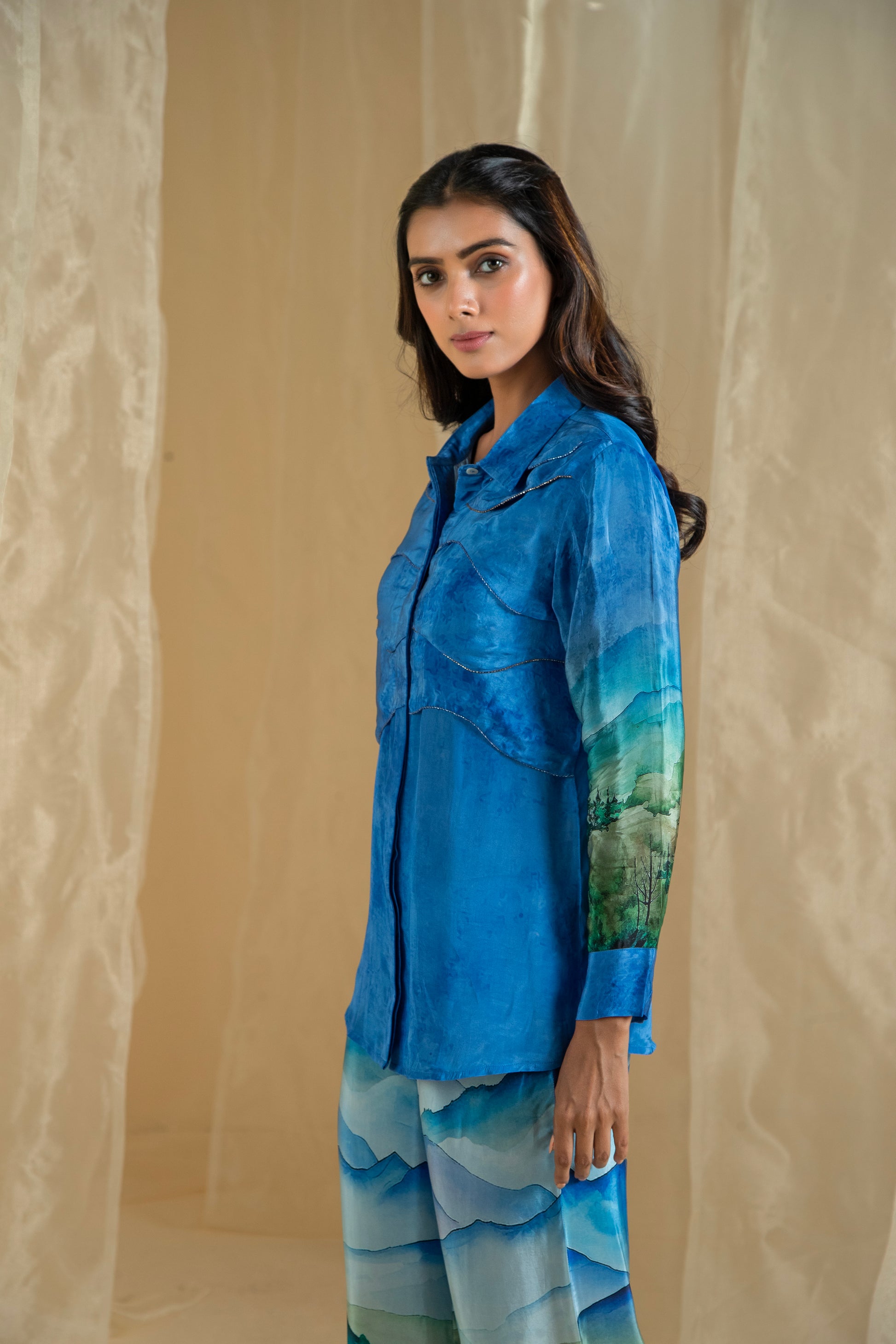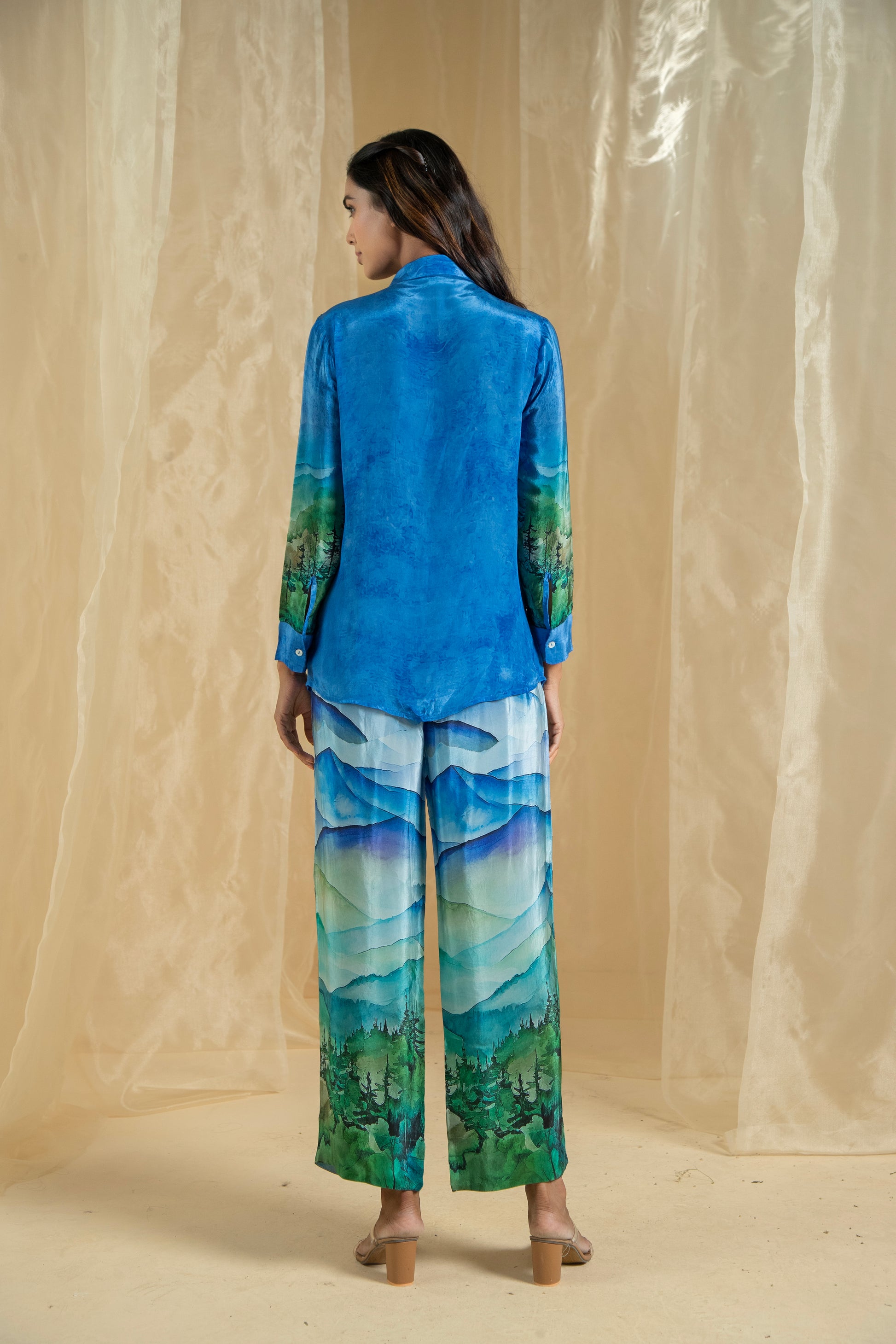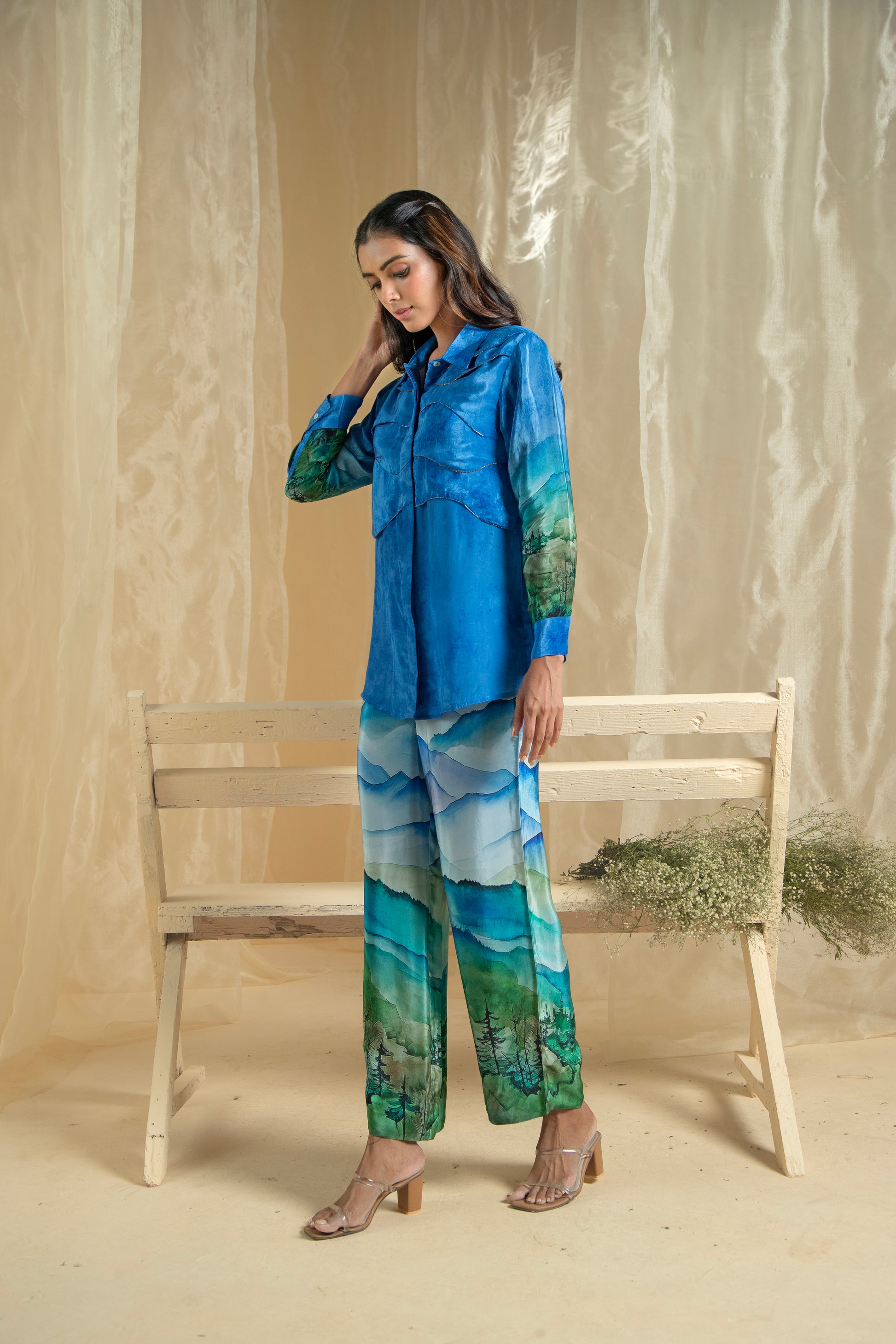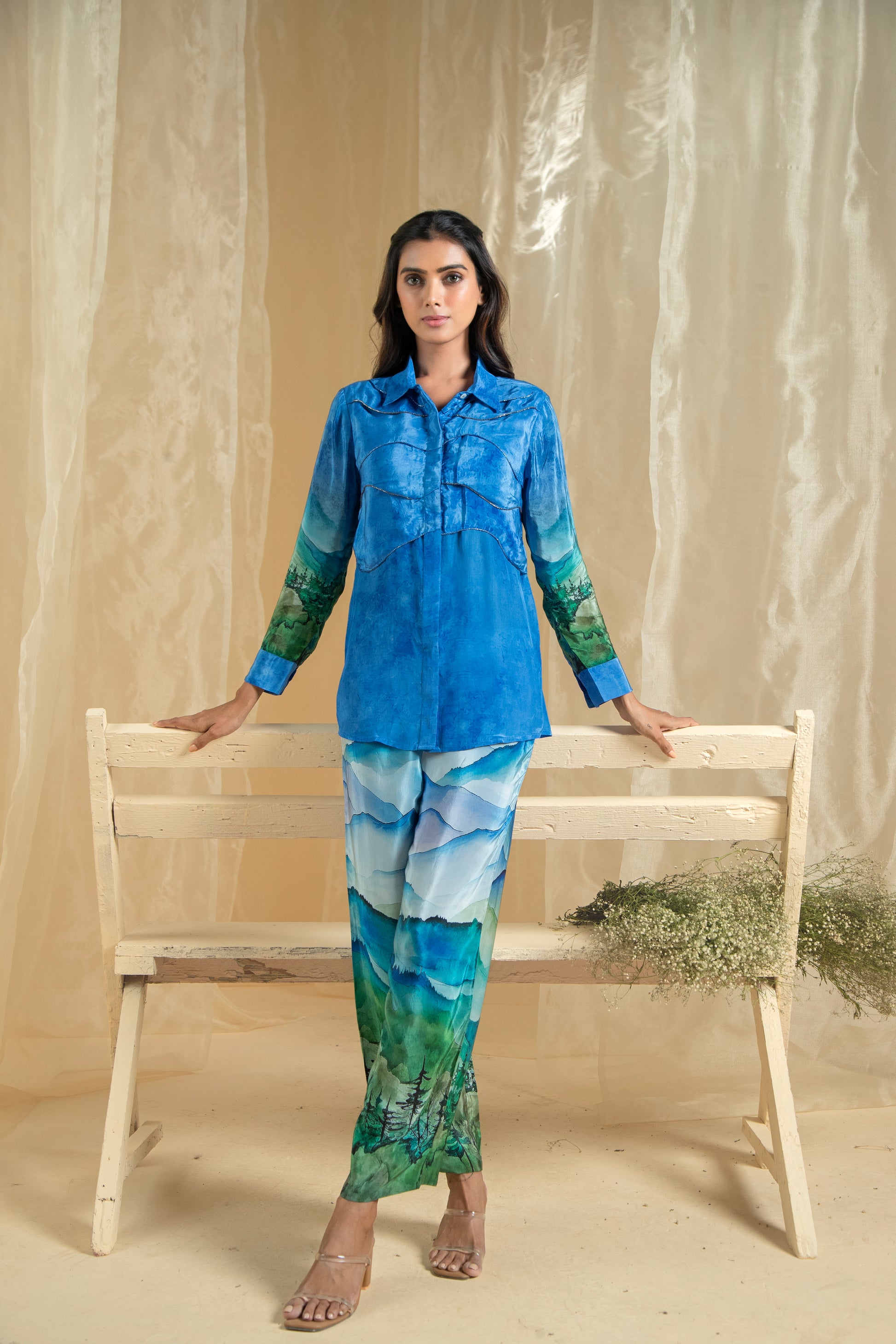 For women, the Lovescape Mountain Print Co-Ord Set is designed to celebrate nature’s elegance. The pants feature a unique, textured mountain print in the same harmonious tones, while the top is adorned with a layered scalloped pattern, each intricately embroidered with metallic beads. This versatile set allows you to style the pieces together for a coordinated look or separately to suit any occasion.