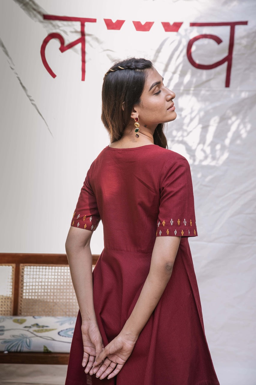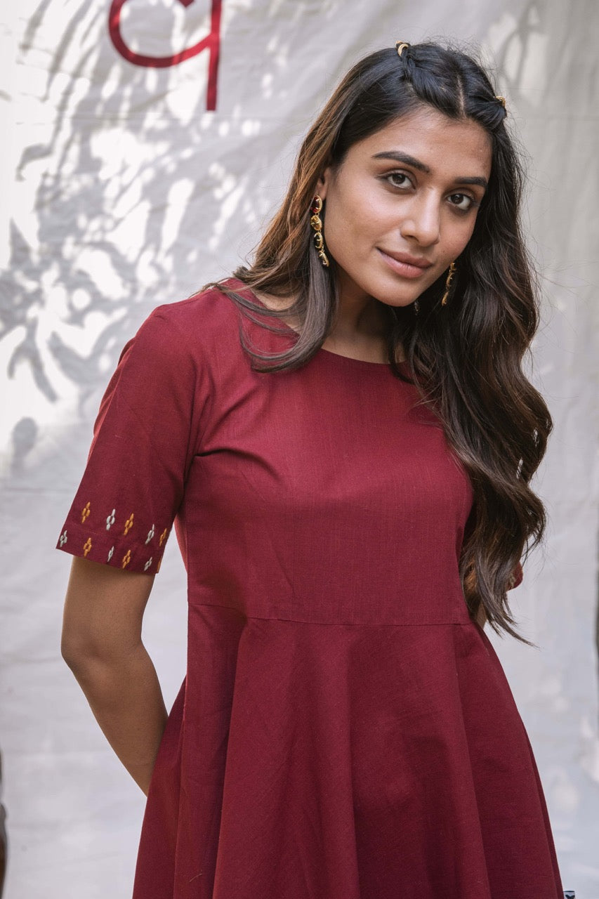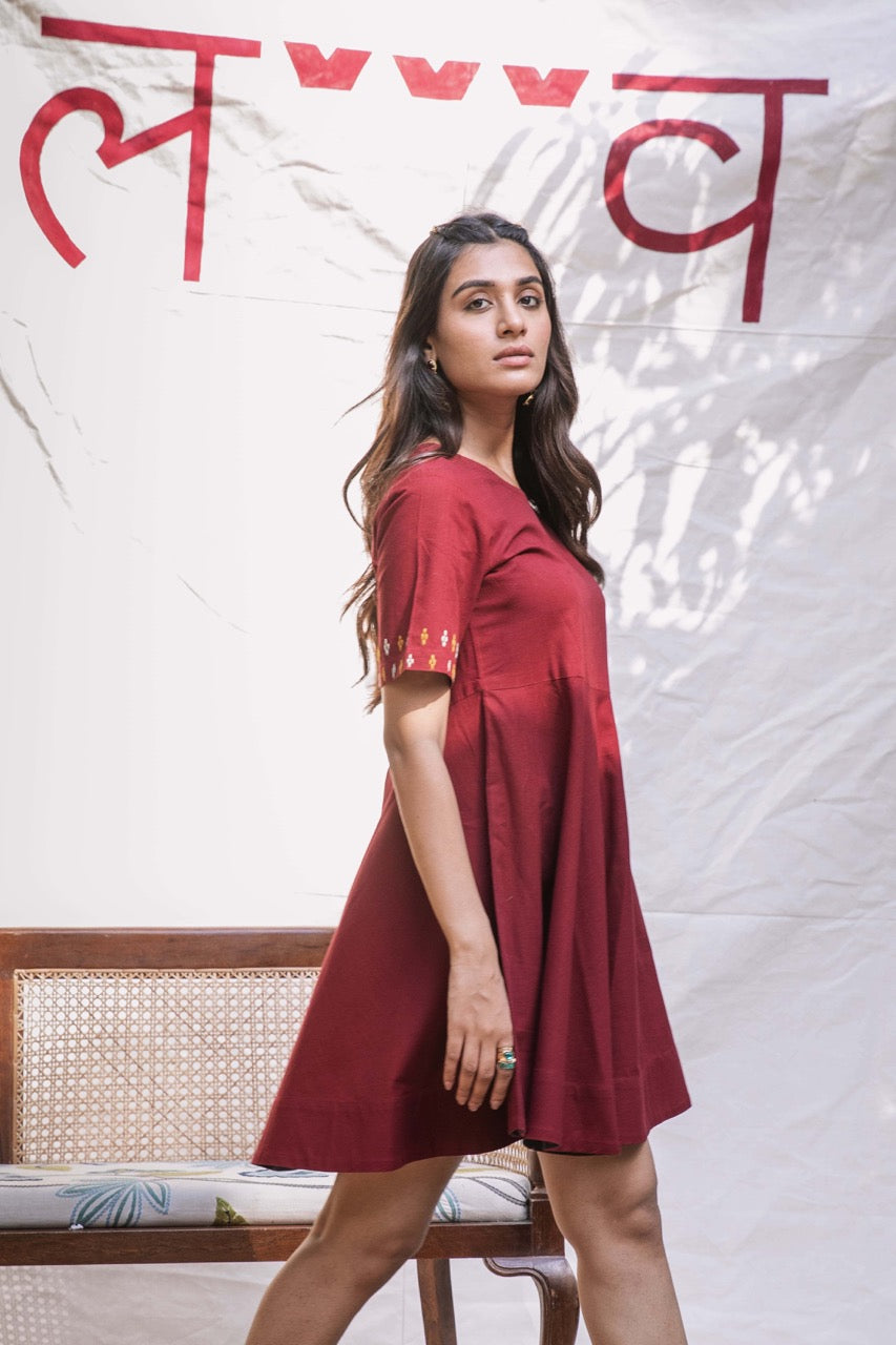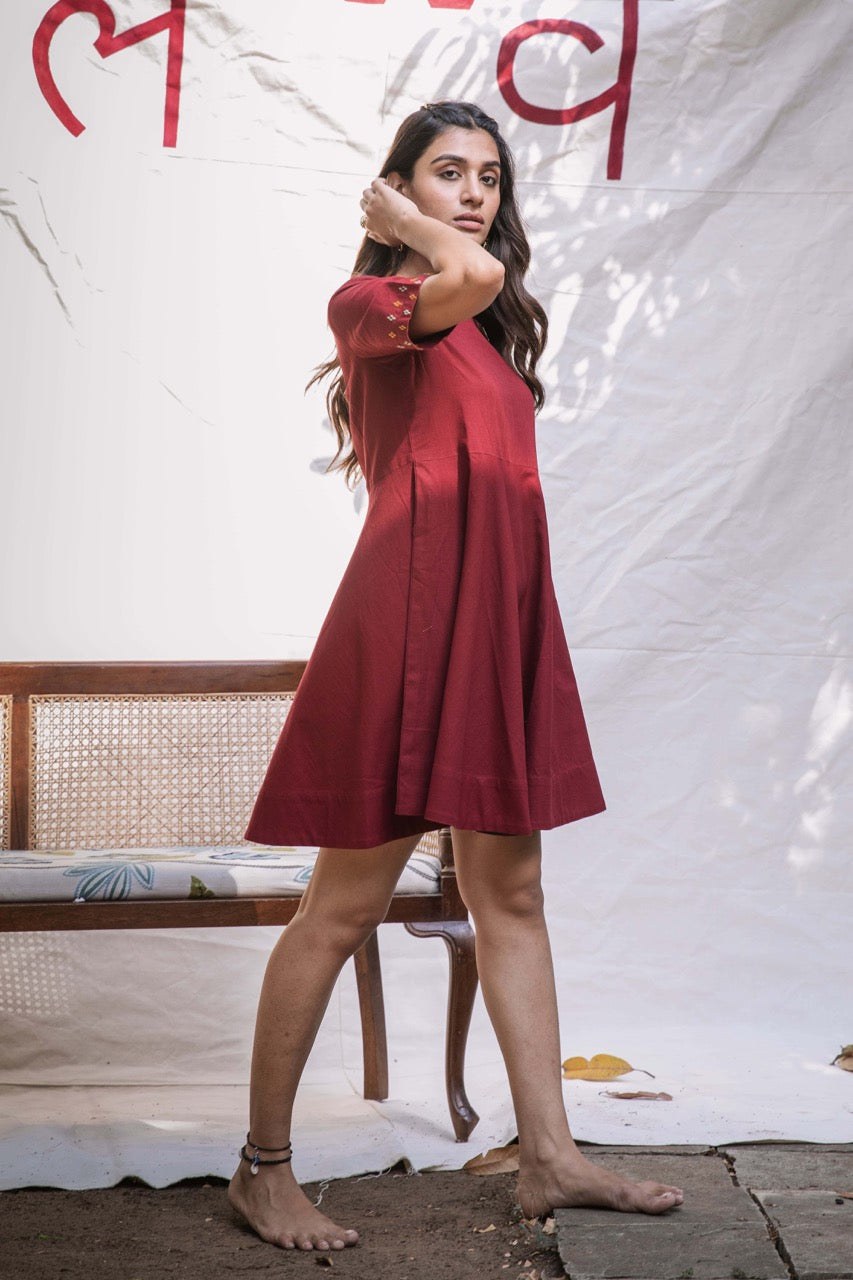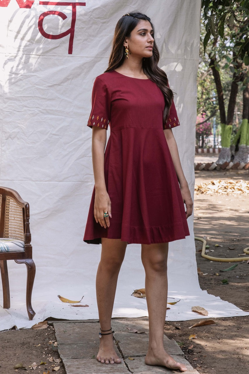 Deep Cherry Red short dress with a defined empireline,thread detailing on sleeve,giving a structure to the upperbody,is a perfect style to wear to a dine out. Pair your favourite sling bag with it.