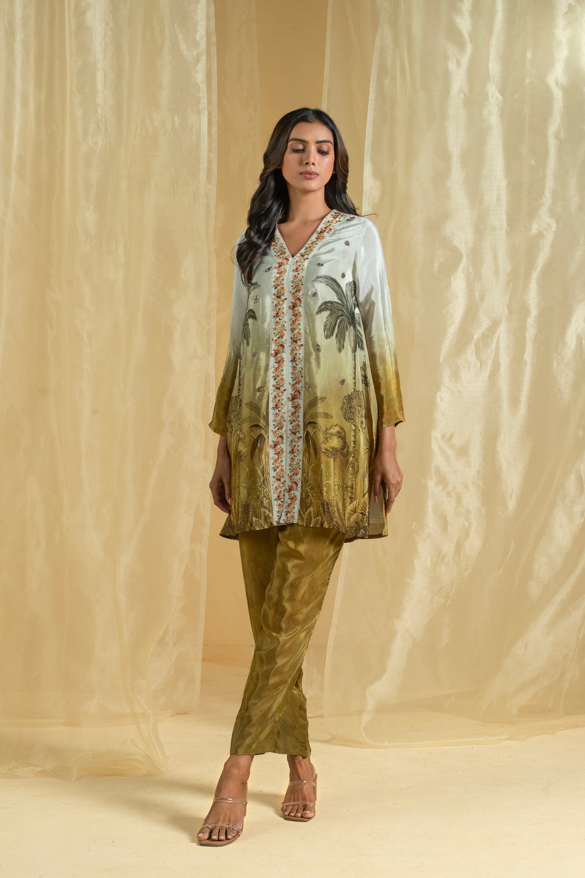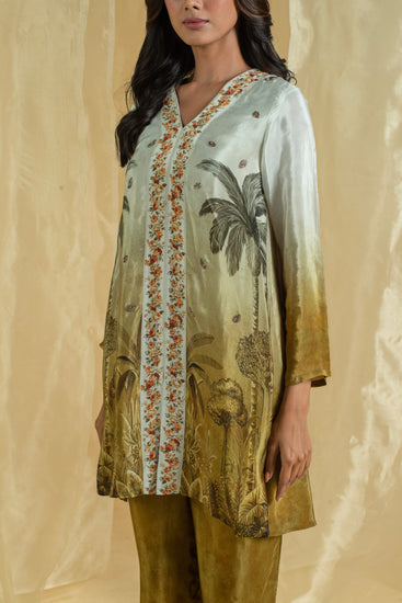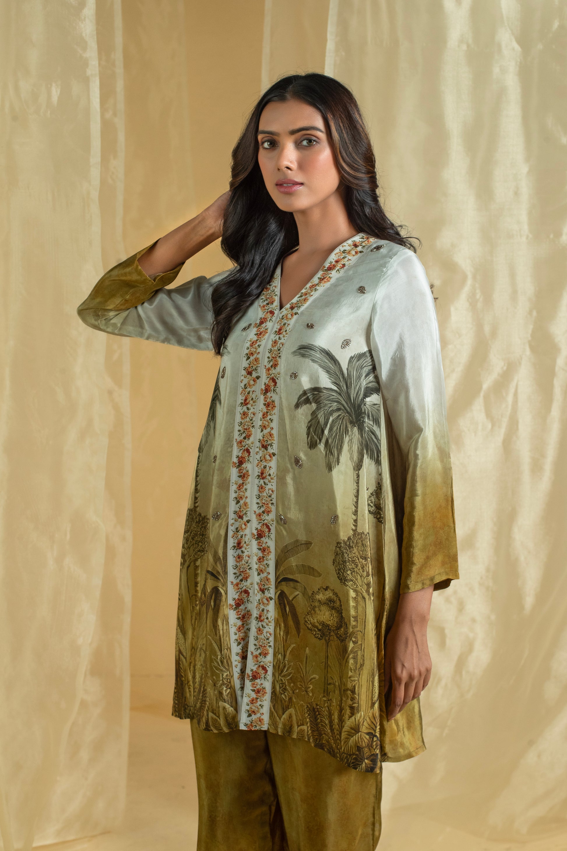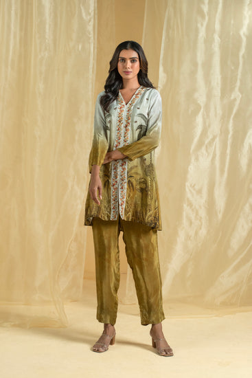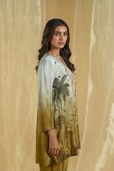 Step into elegance with our Lovescape Coconut & Mustard Co-Ord Set, designed to blend vintage charm with modern flair. The top features a captivating coconut print on an ombre background that transitions from cream to a rich mustard yellow. A vintage floral border along the neckline and center adds a touch of nostalgia, while scattered beaded embroidery enhances the formal appeal.