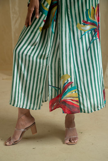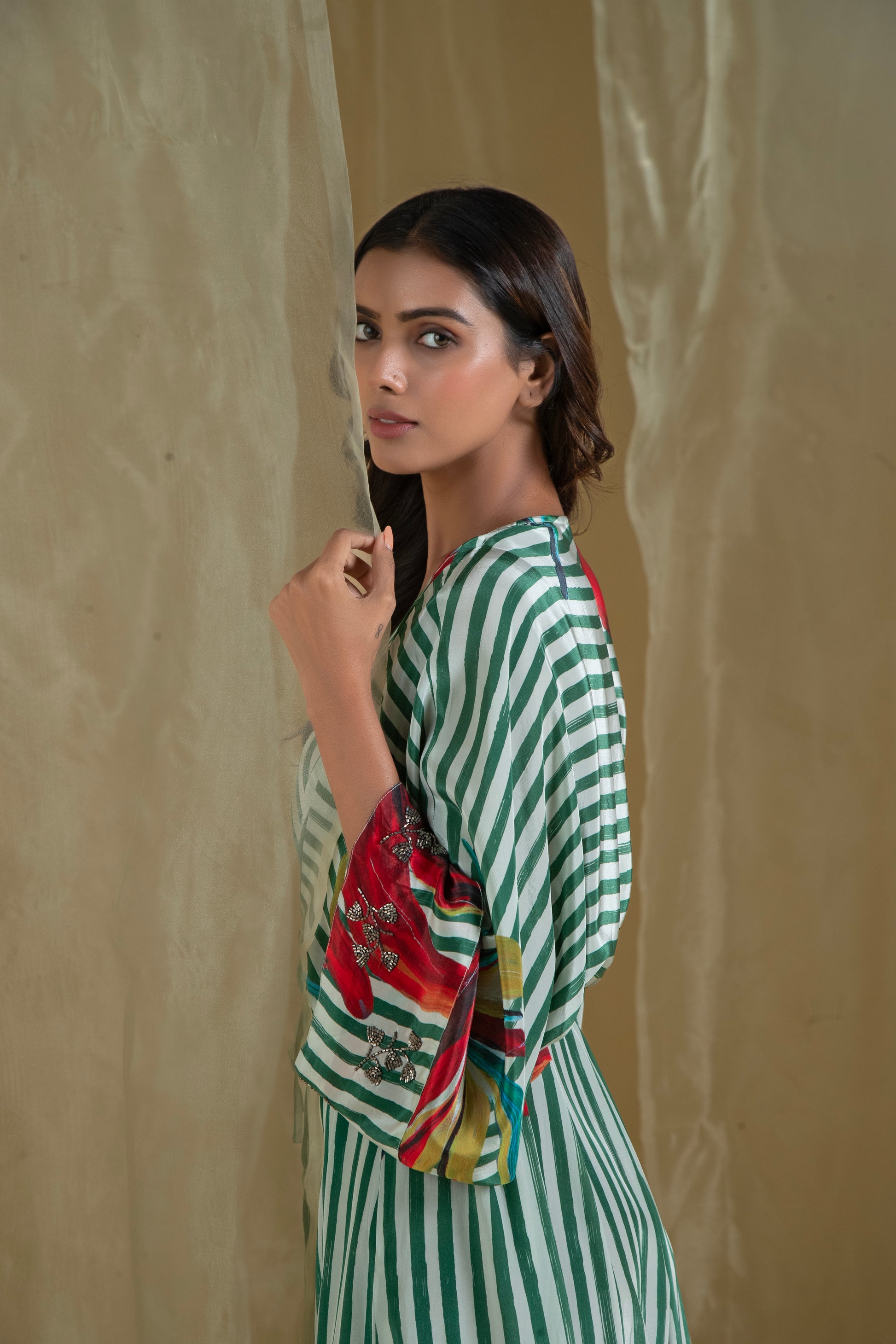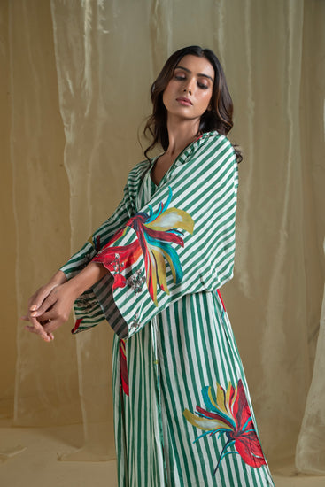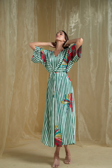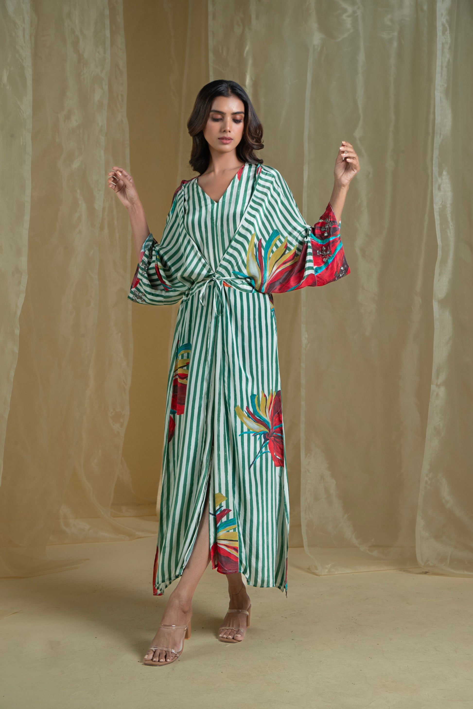 Embrace effortless elegance with our Lovescape Floral Tie-Around Dress. This versatile piece features a stunning big floral motif, creatively paired with green and white stripes for a modern twist. The tie-around silhouette allows for an adjustable fit, cinching at the waist to create a flattering shape for any body type. Crafted from pure crepe, the dress offers a comfortable and breathable feel, making it perfect for both casual brunches and resort getaways.