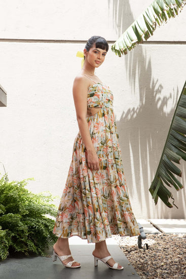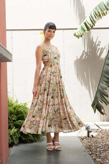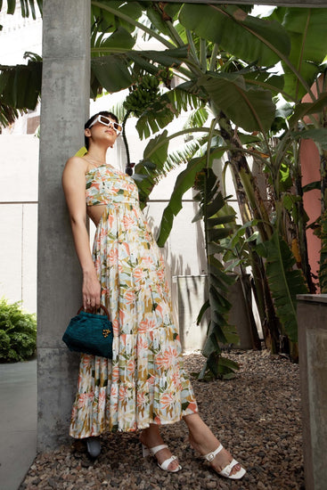 Soulful, an ankle-length dress from the Love Letter collection, exudes elegance with its pleated chest yoke and graceful flared silhouette. This strappy dress, adorned with cutouts on the waist, back, and sides, is perfect for holidays, making it an ideal choice for beach getaways and destination parties.