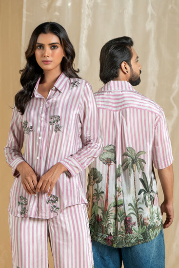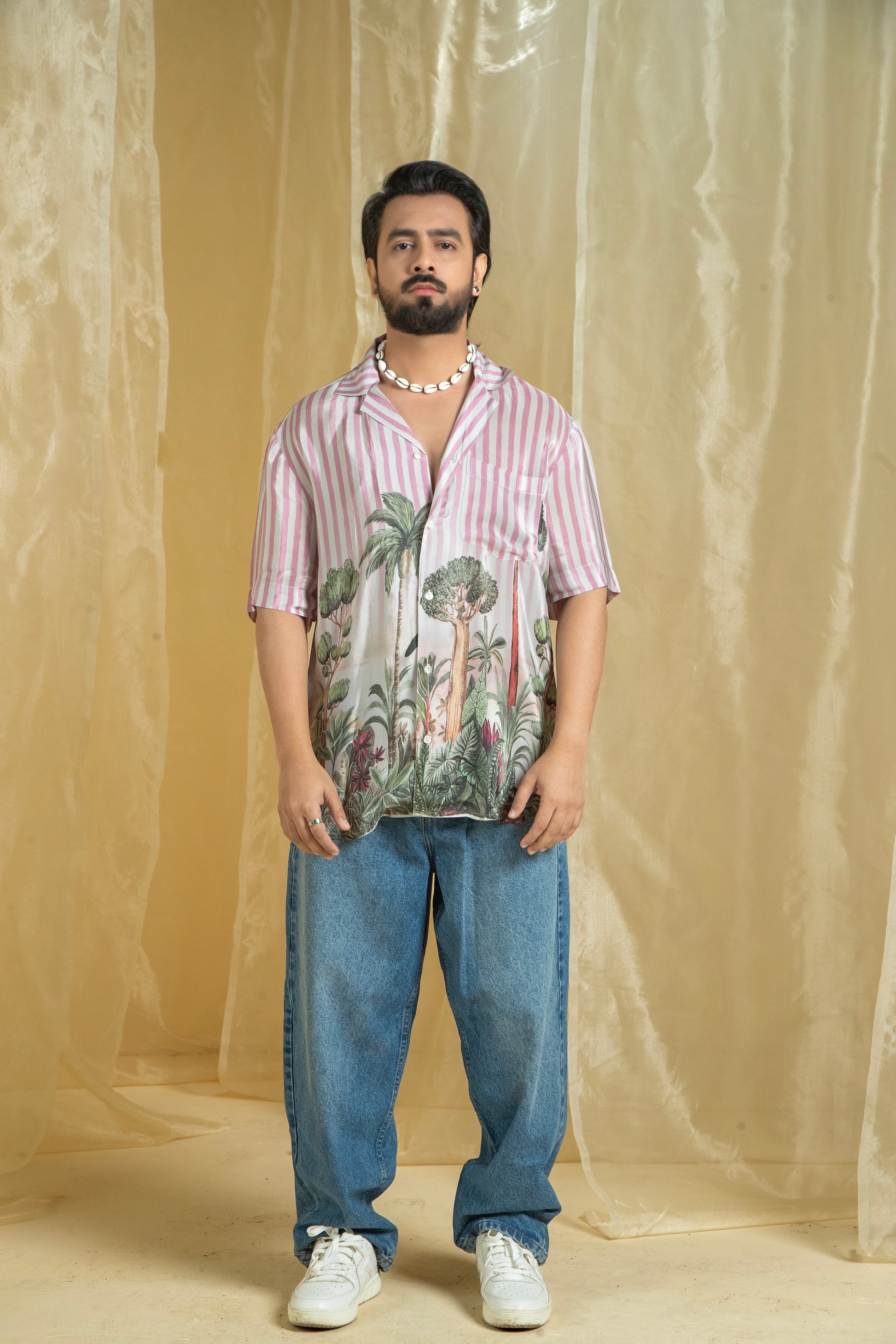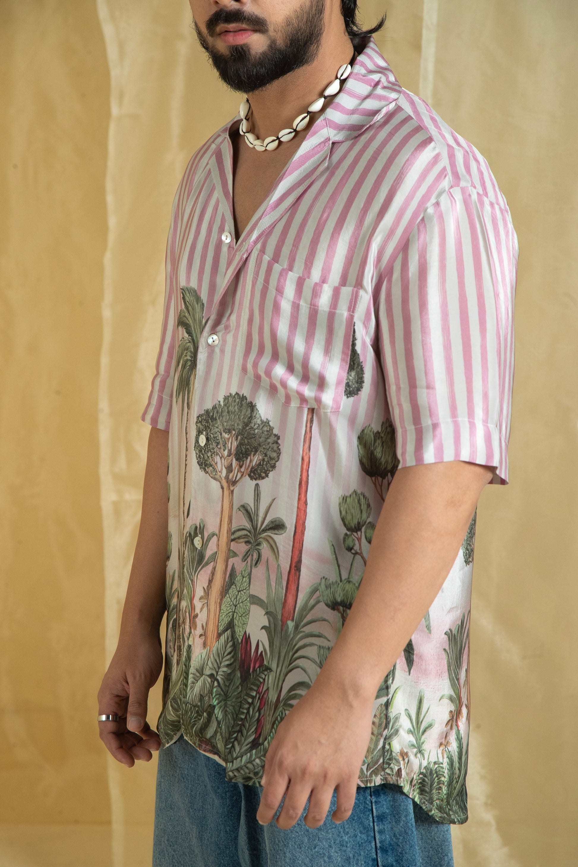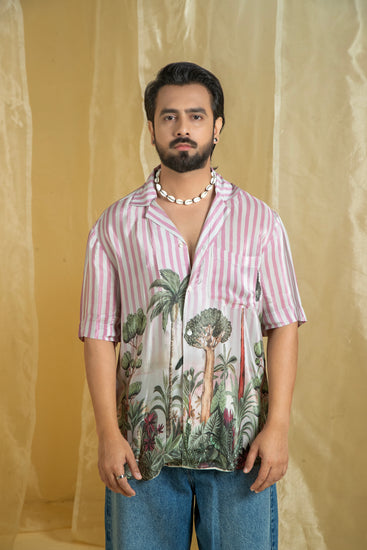 For men, the Lovescape Coconut Grove Shirt offers a vibrant and nature-inspired look, featuring a striking coconut tree print complemented by creative pink and beige stripes. Crafted from pure natural crepe, this shirt is lightweight and breathable, ensuring comfort for any occasion. The short sleeves provide added versatility, making it ideal for both casual outings and semi-formal events. This shirt brings artistic elegance to your wardrobe, blending distinctive design with everyday wearability.