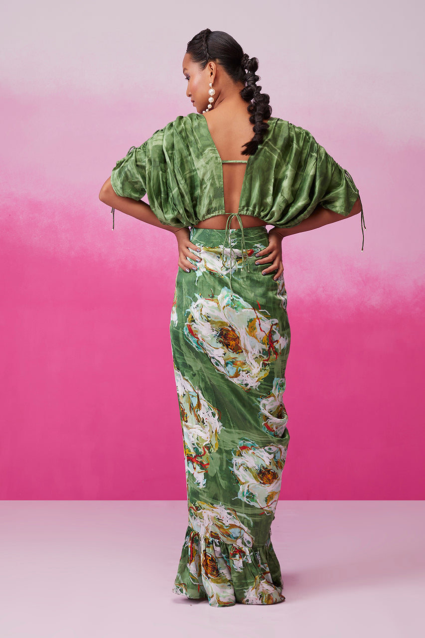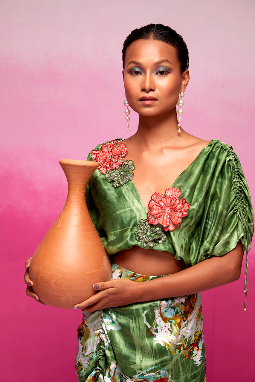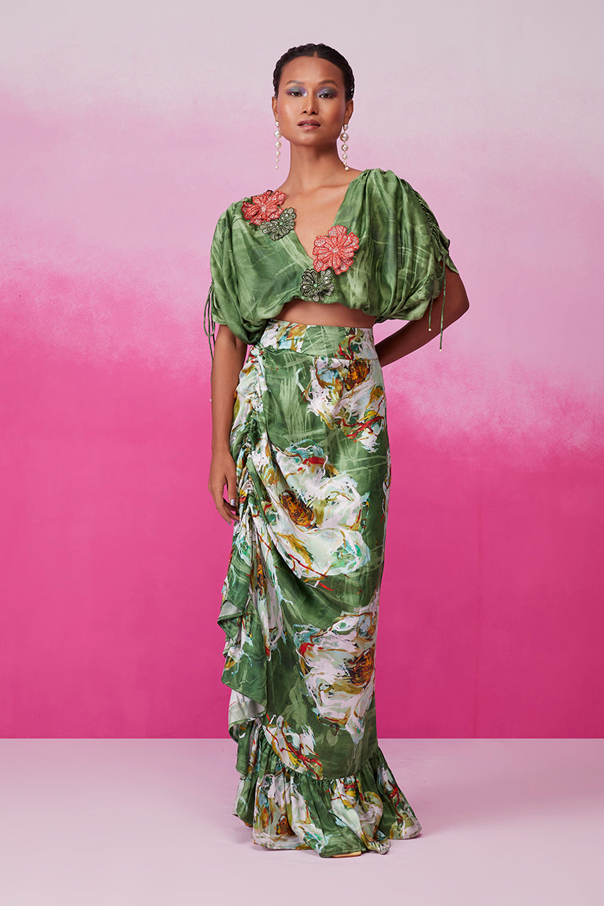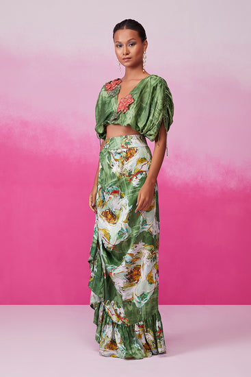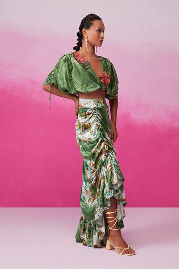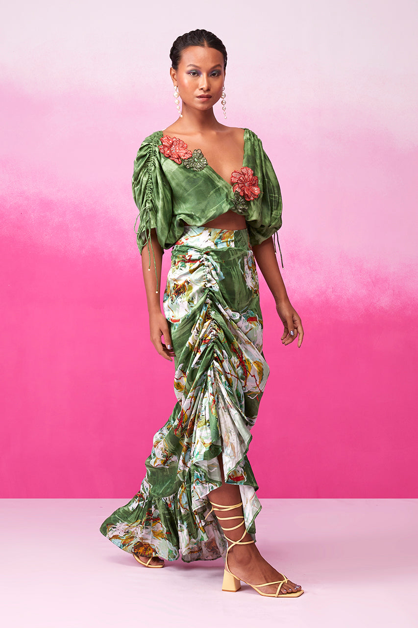 Indulge in the allure of "Tropical Treasure" by Call it Love. This captivating ensemble is a dance of style and sophistication. The crop top, adorned with organza embroidered flowers and a playful string tie, complements a frill-adorned skirt, making it perfect for parties or cocktails. Trendy, edgy, and undeniably attractive – dance through the night in this exquisite ensemble.