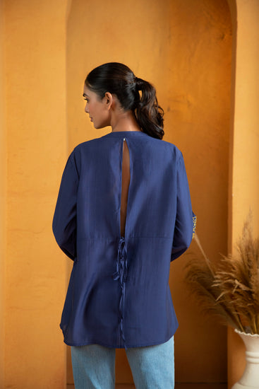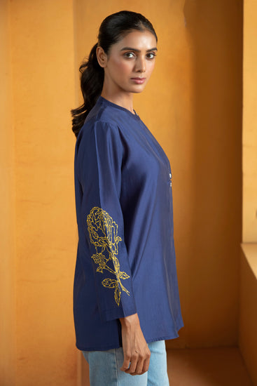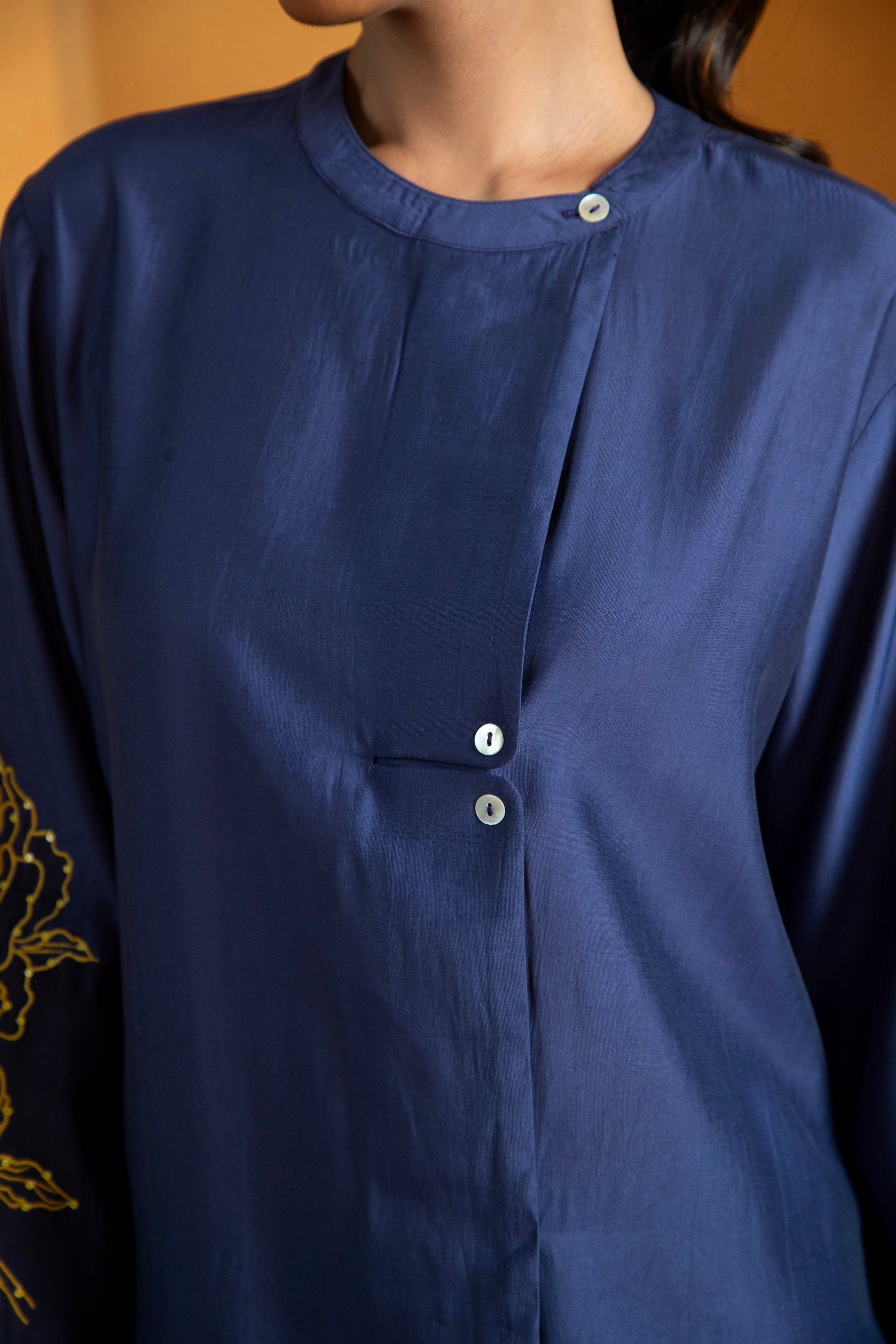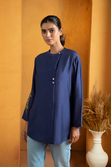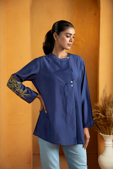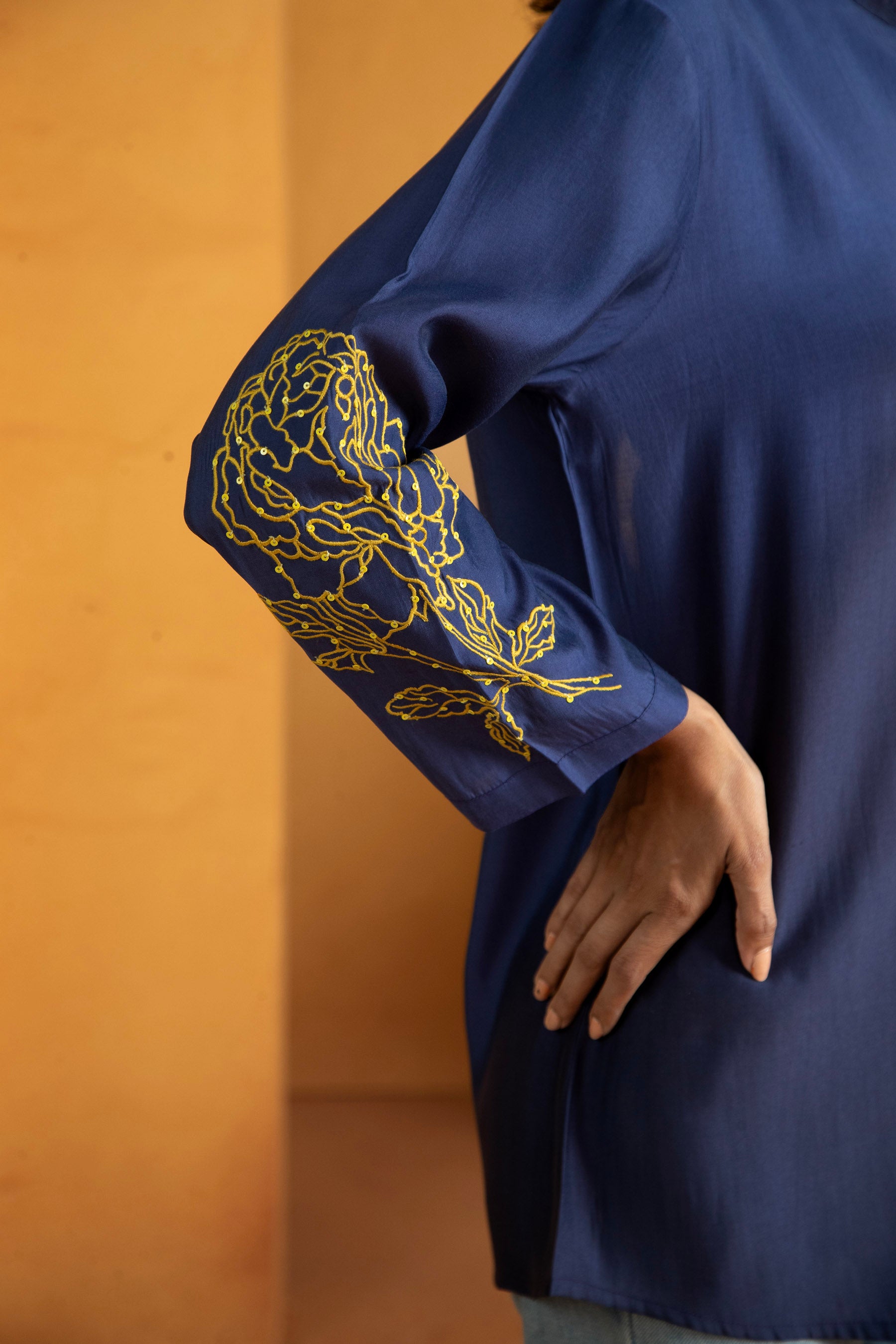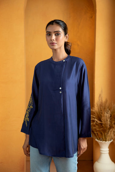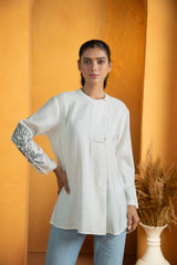 This style is simple yet has an attractive appeal to it. The placket style is different and has a slit at the back, which gives a modern switch to the look. The embroidery detailing in one sleeve adds a little fun to the shirt.
