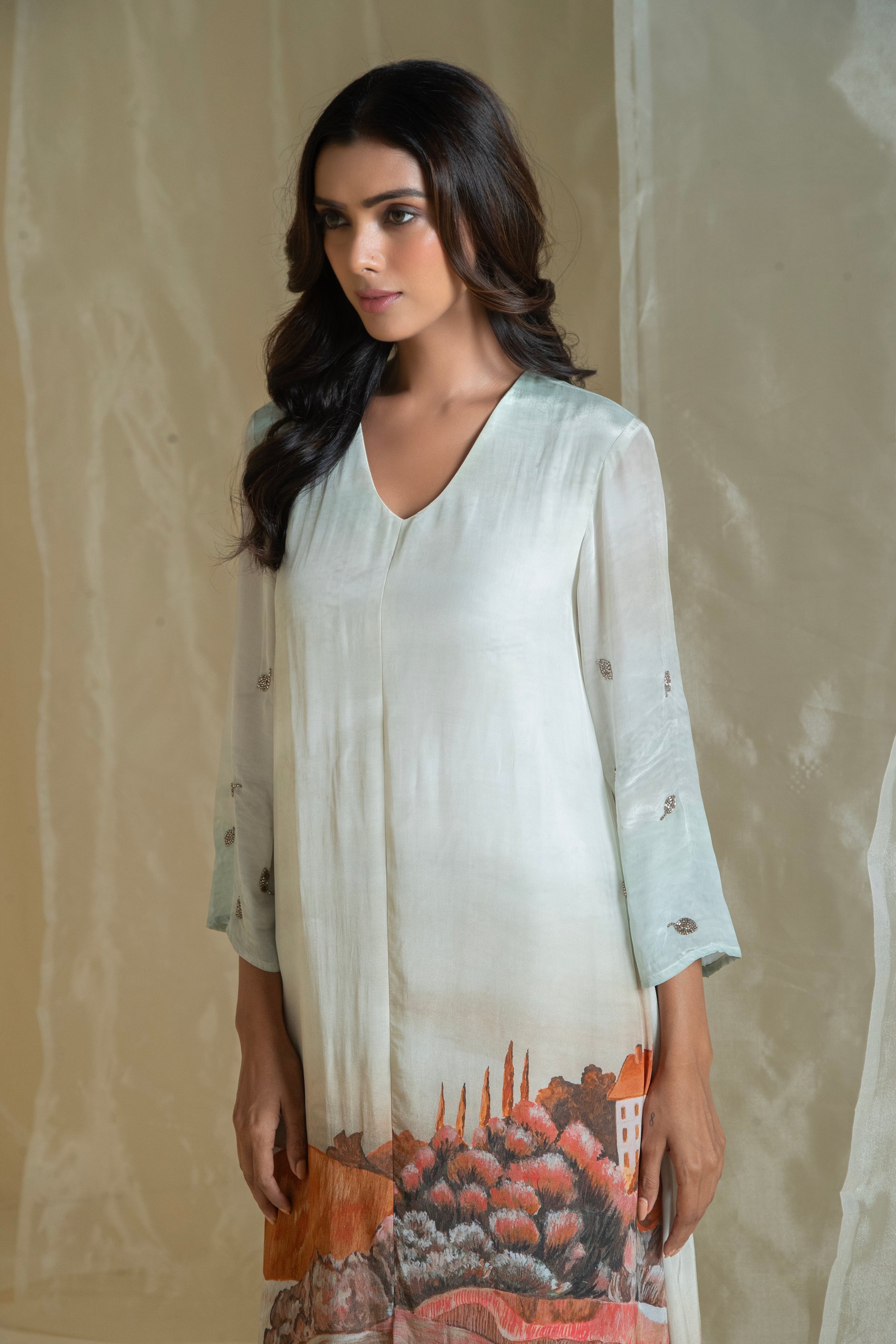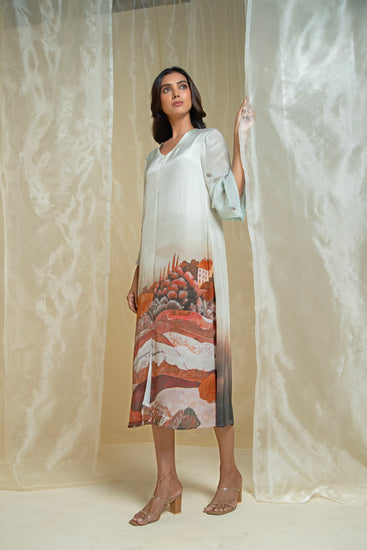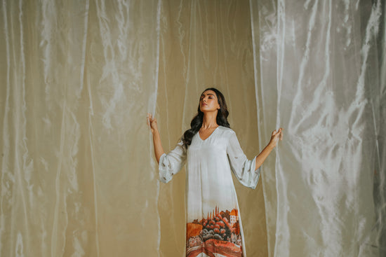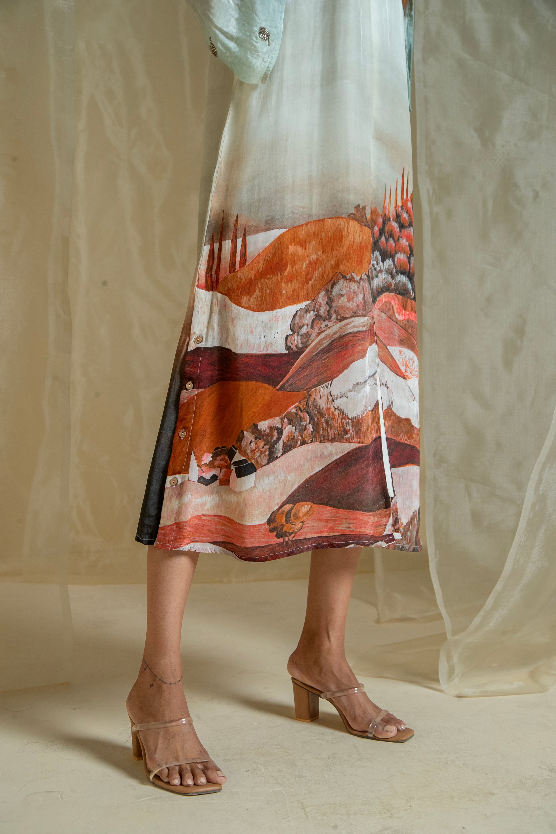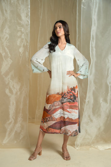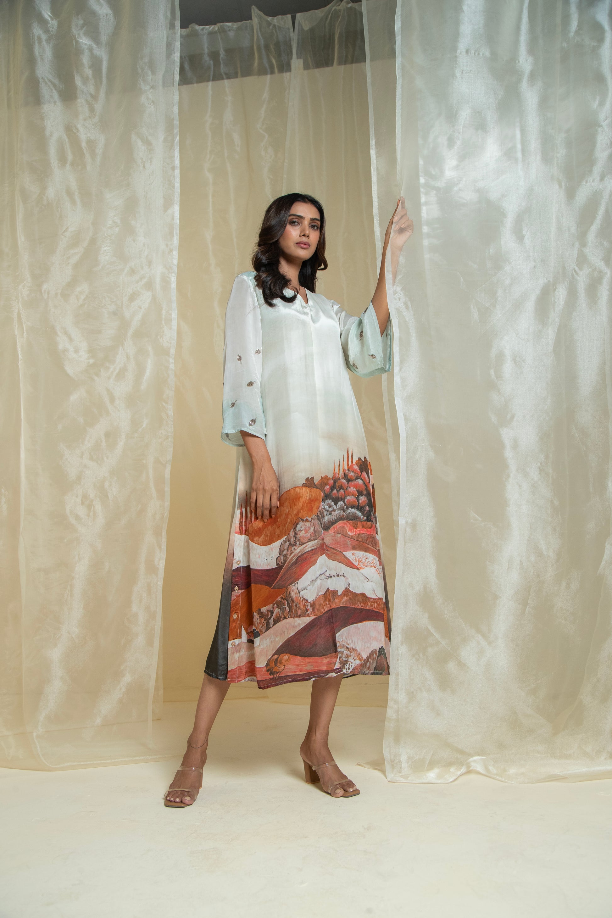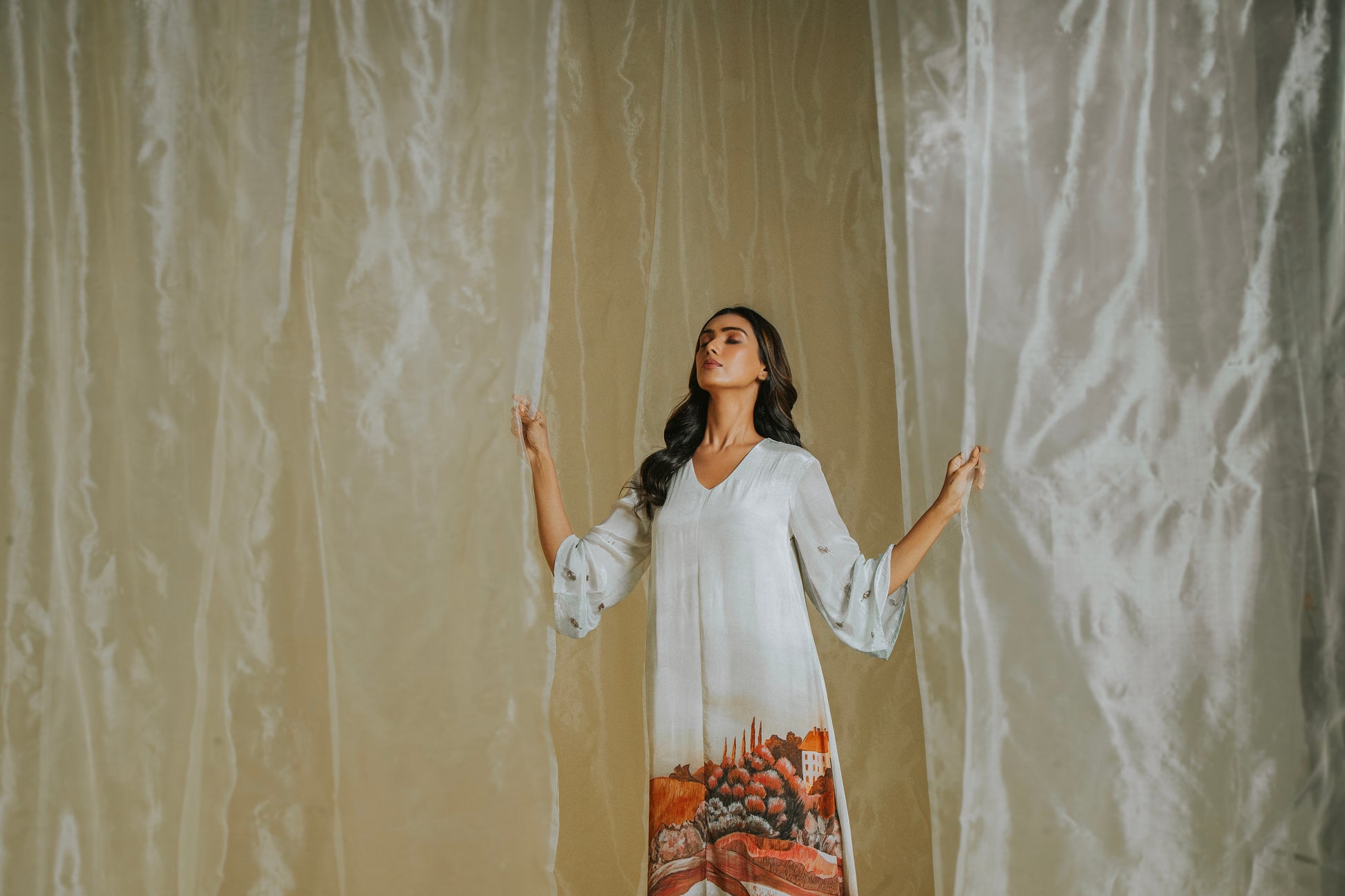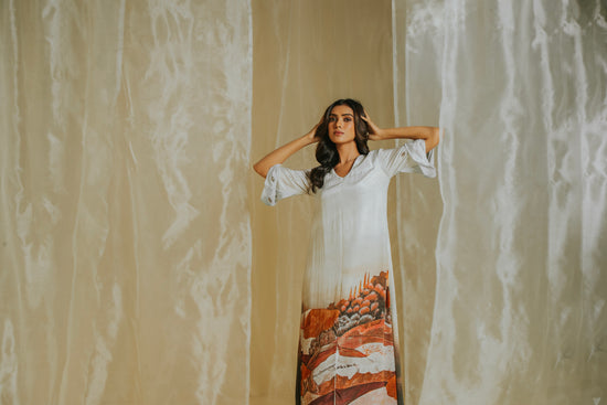 At Callit Love, everything we create is a reflection of love—love for art, love for nature, and love for every person who wears our designs. Our Lovescape A-Line Dress embodies this philosophy, blending the serene beauty of mountain landscapes with thoughtful craftsmanship. Designed with a narrow V-neckline and bell sleeves, adorned with delicate beaded hand embroidery, this dress is made to celebrate you. Each detail is crafted with care and passion, ensuring that when you wear this dress, you feel wrapped in love. The center cut near the hem adds a touch of flair, making it perfect for a special brunch or a relaxed resort day. Fully lined for comfort, this dress is more than just fashion—it's a piece of art, created with love, for you to cherish.